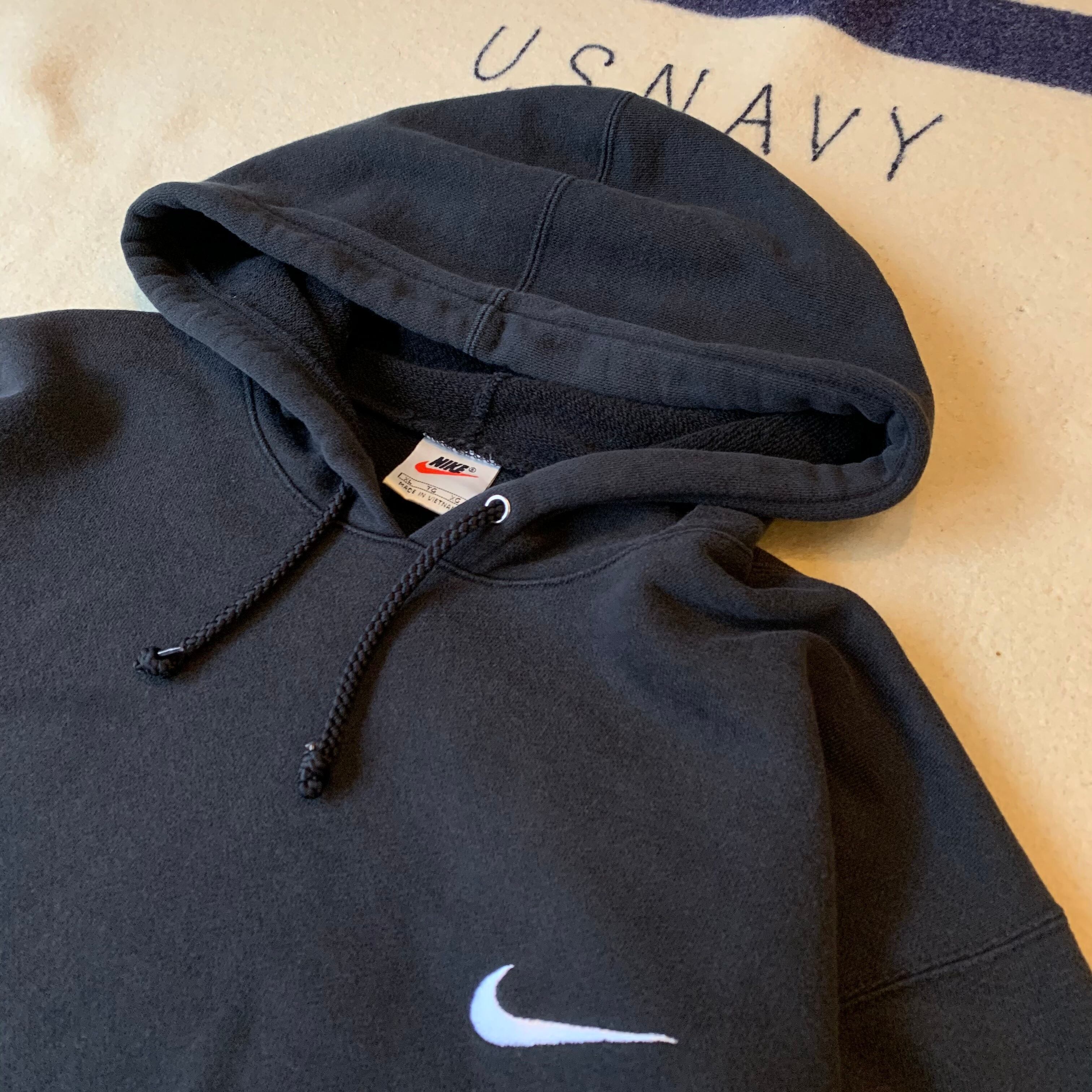 90s頃のUSA製から変わった直後あたりのNIKE。ブラックボディのワンポイントスウォッシュロゴ。着回しの効く一着です。