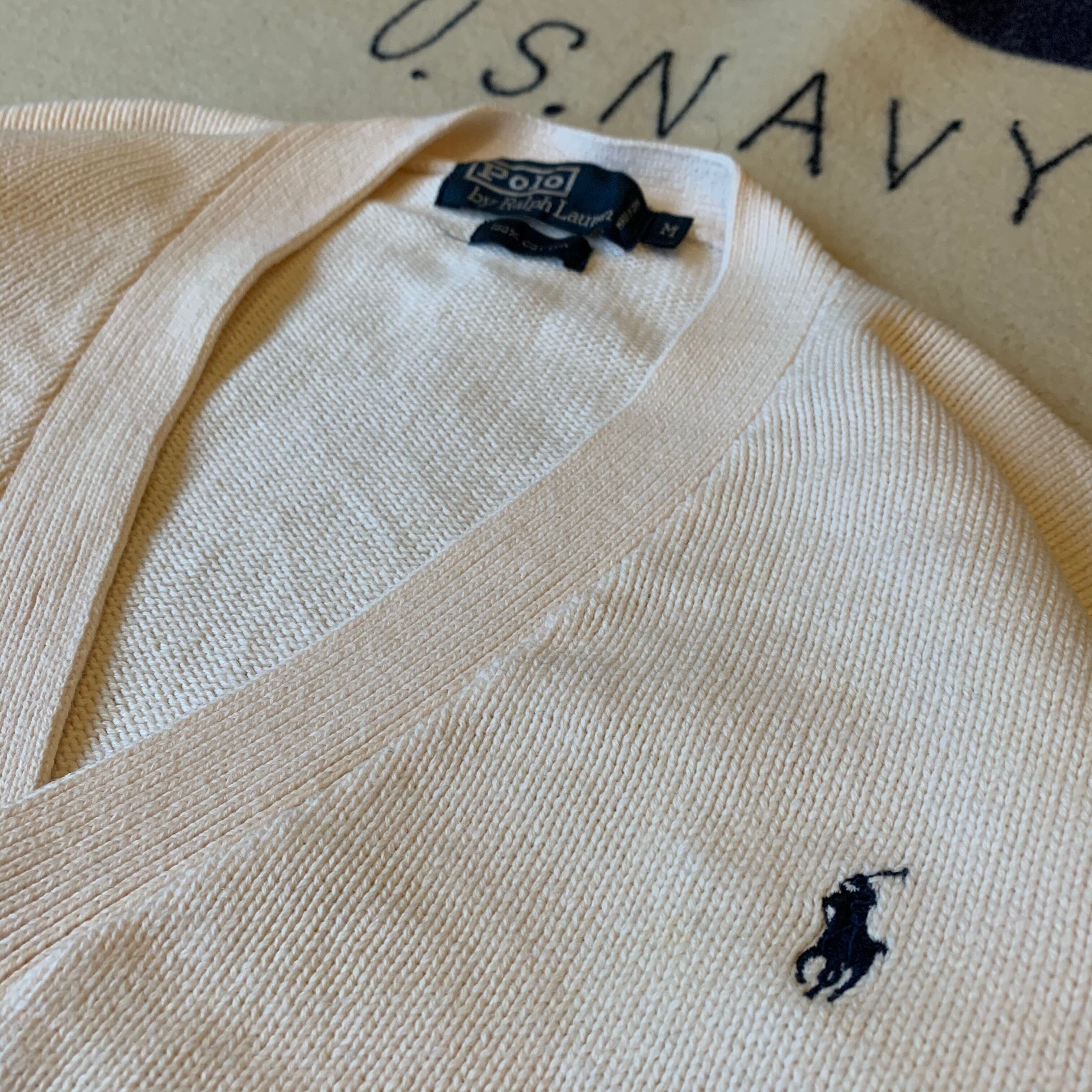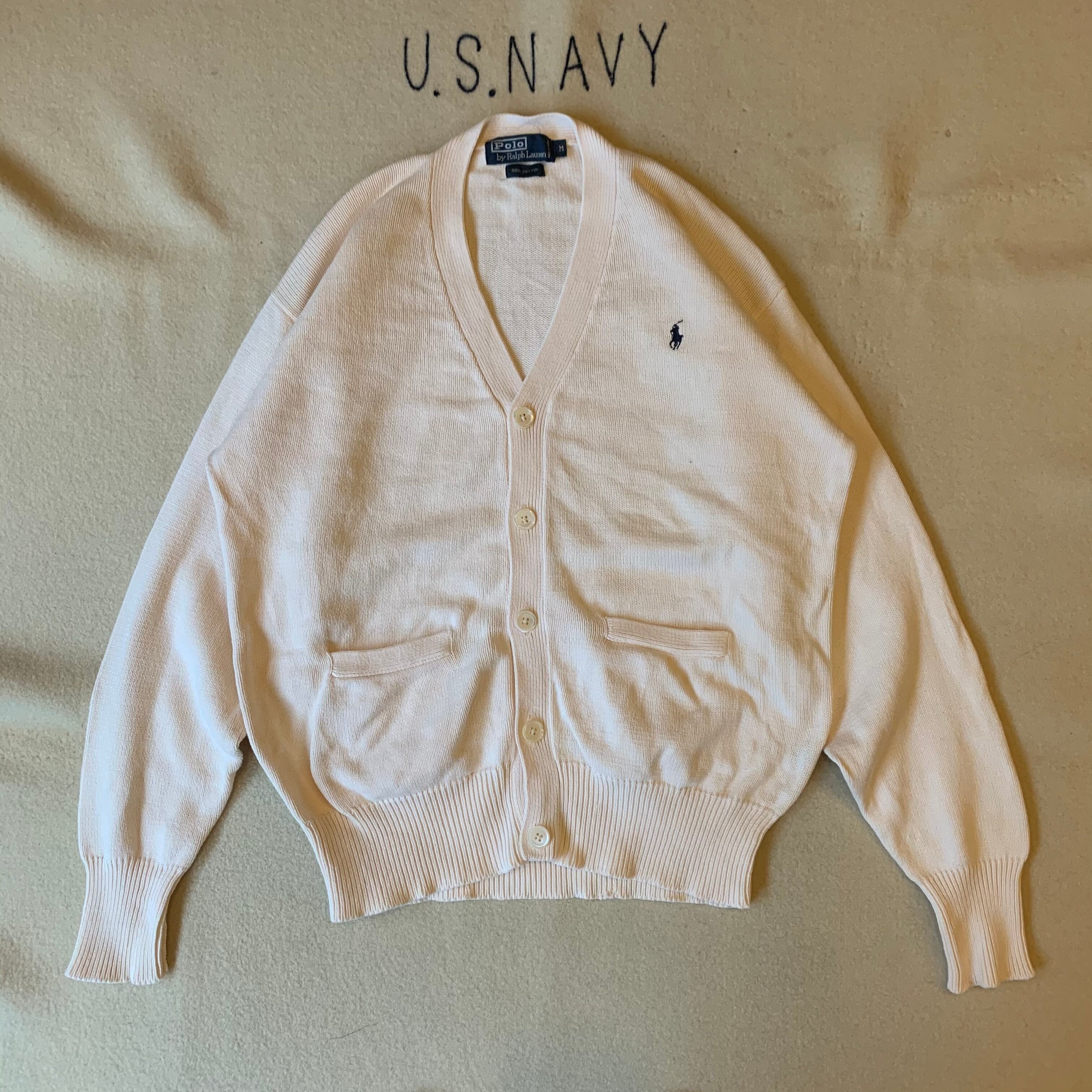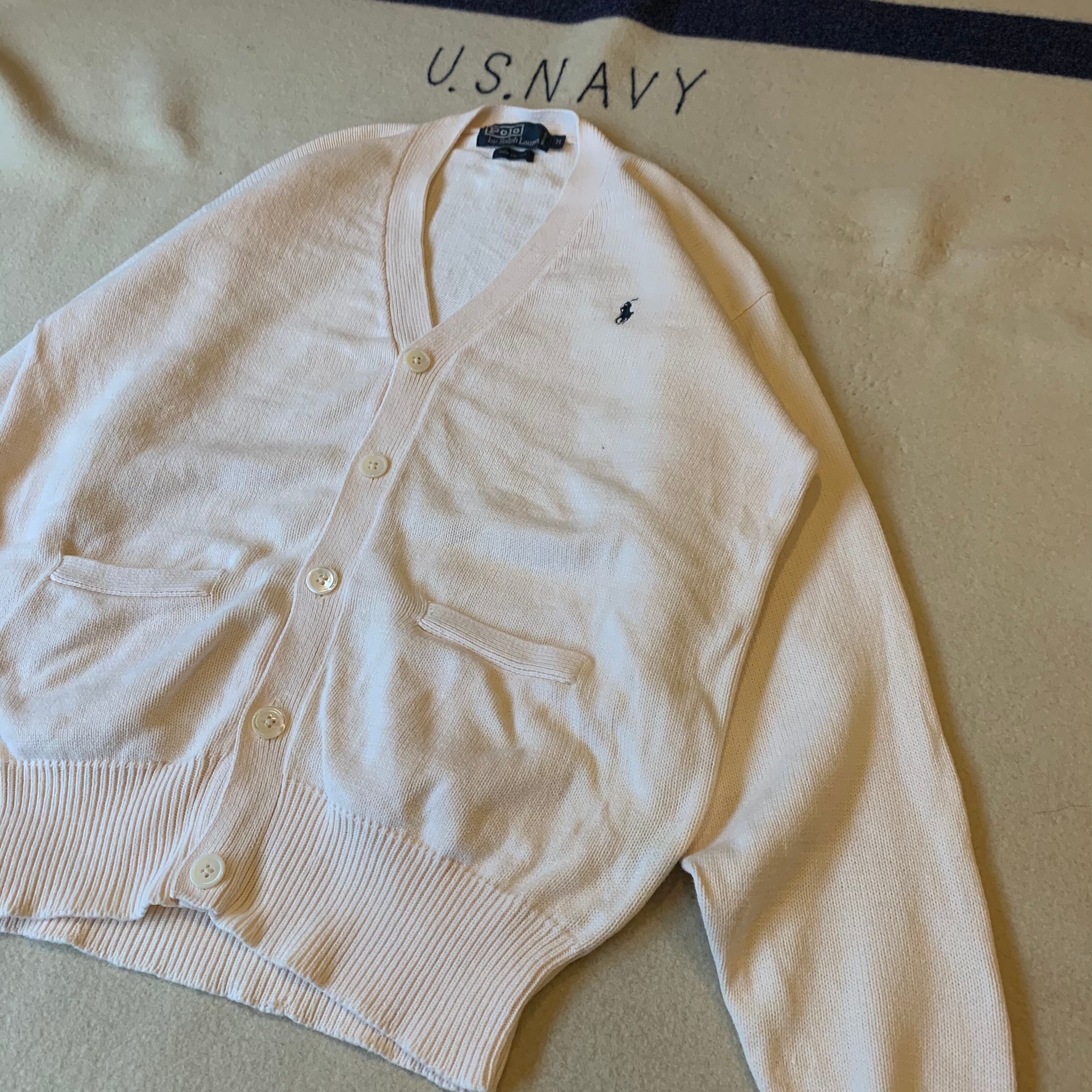 90s頃のラルフローレン。コットンニットのカーディガンタイプ。カラーはホワイトに見えますがうっすらピンクが入ってます。珍しいです。