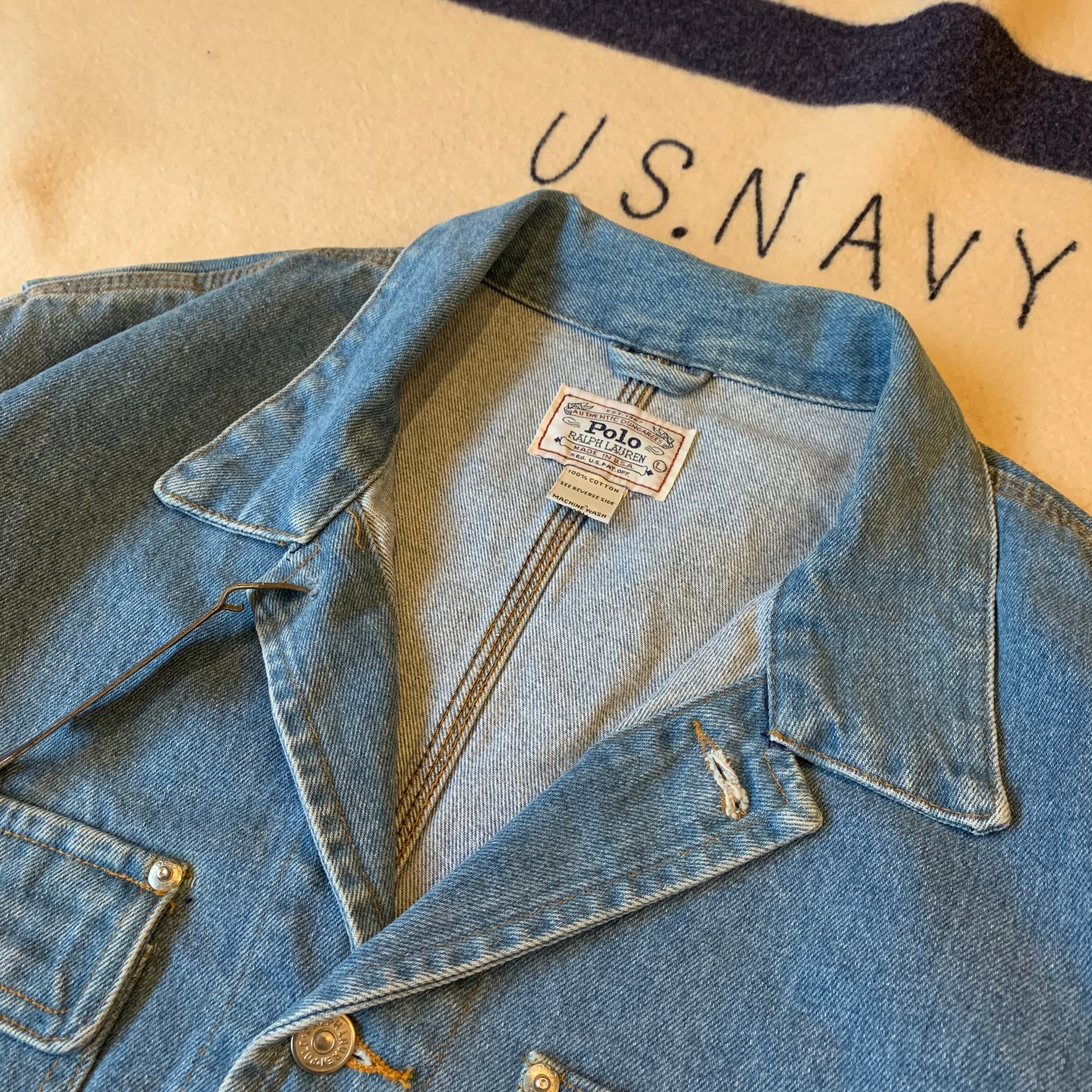 90s頃のPOLO RALPH LAUREN。USA製のデニムジャケット。シルエットはGジャンですが各所のディテールはカバーオールを踏襲しています。美味しいとこ取りです。