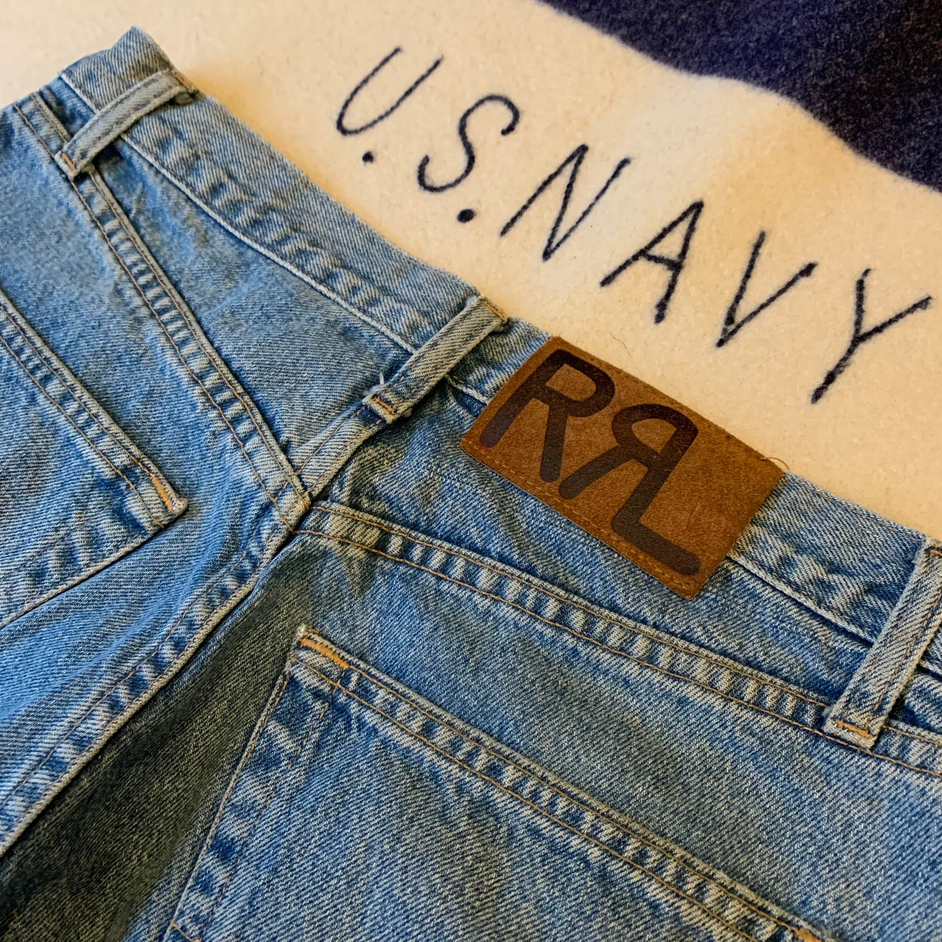 90s頃のRRL。90sらしい色落ちとシルエット。裾口にかけて絞られておりロールアップで靴下を見せてもかわいいと思います。