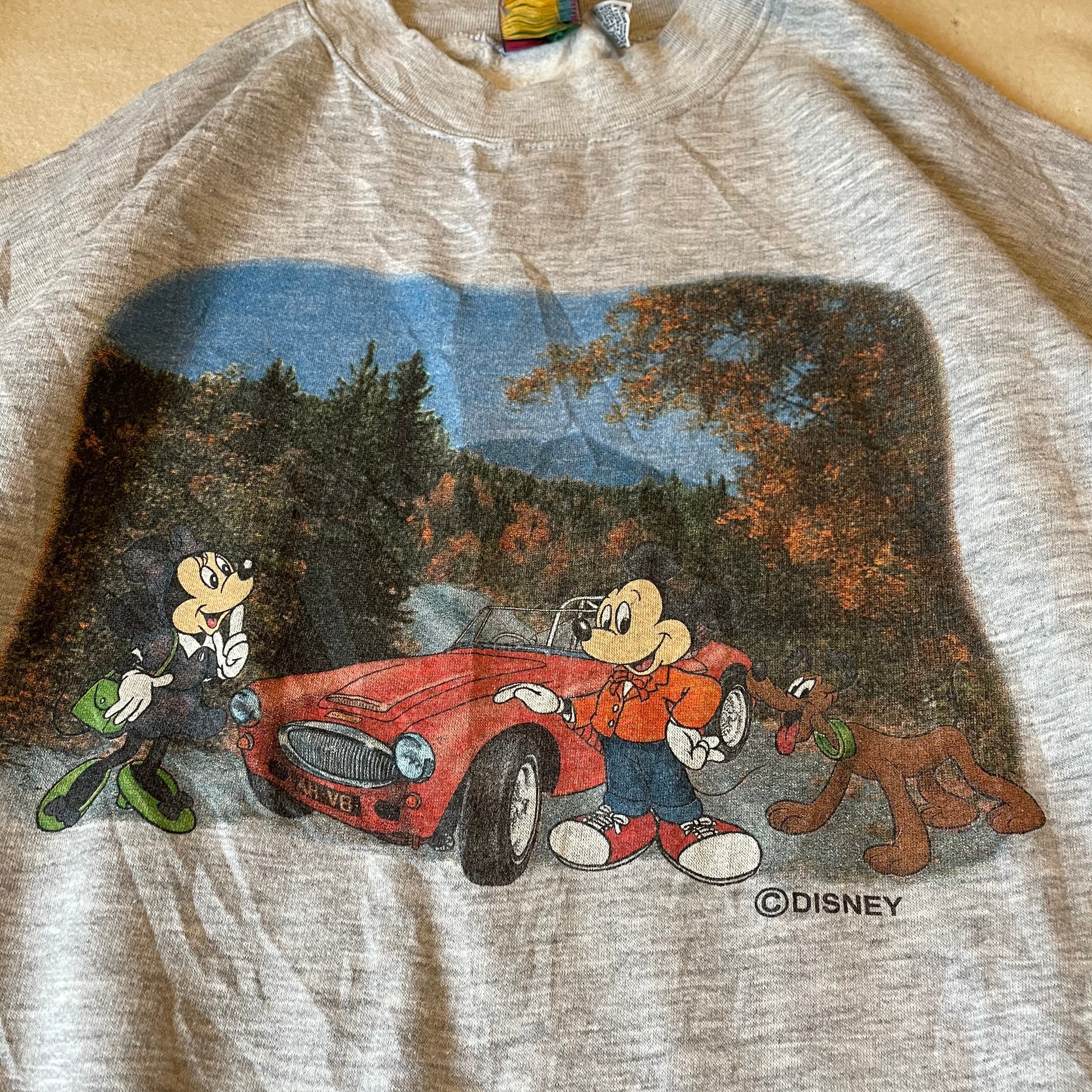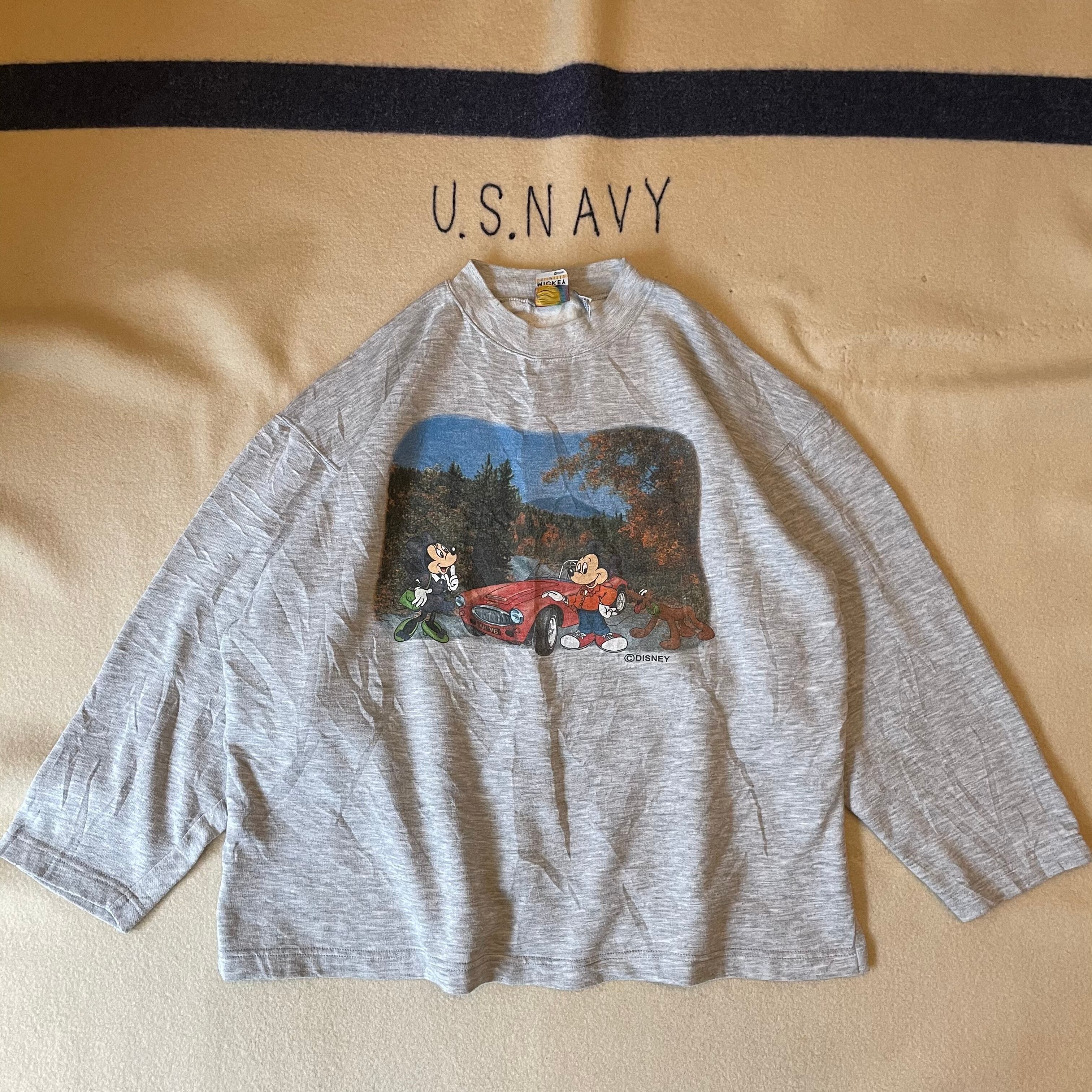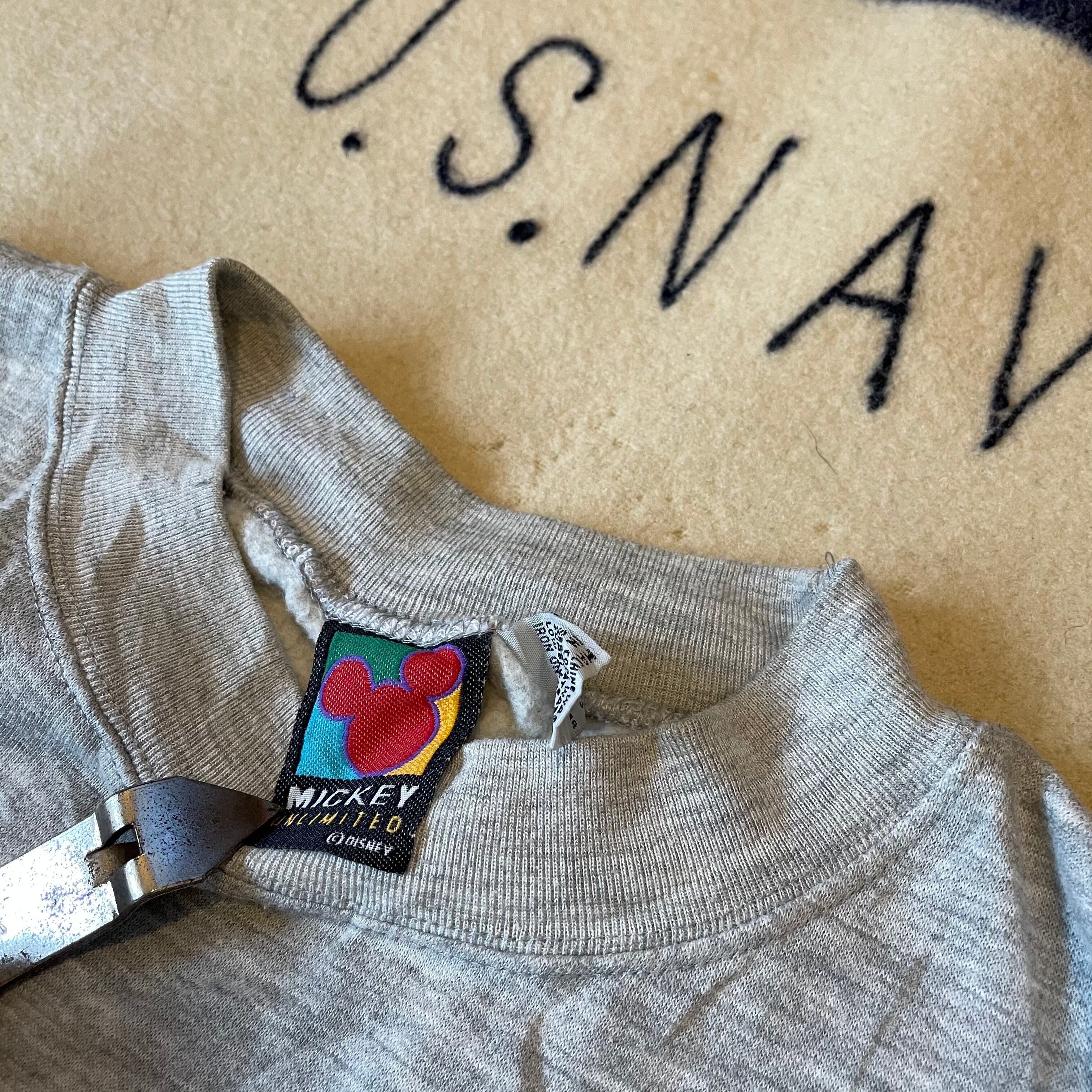 90s頃のDisneyオフィシャルスウェット。タイプ的には珍しいスリット入りでリブの絞りがないボディ。柔らかいコットン×ポリの杢グレーカラー。