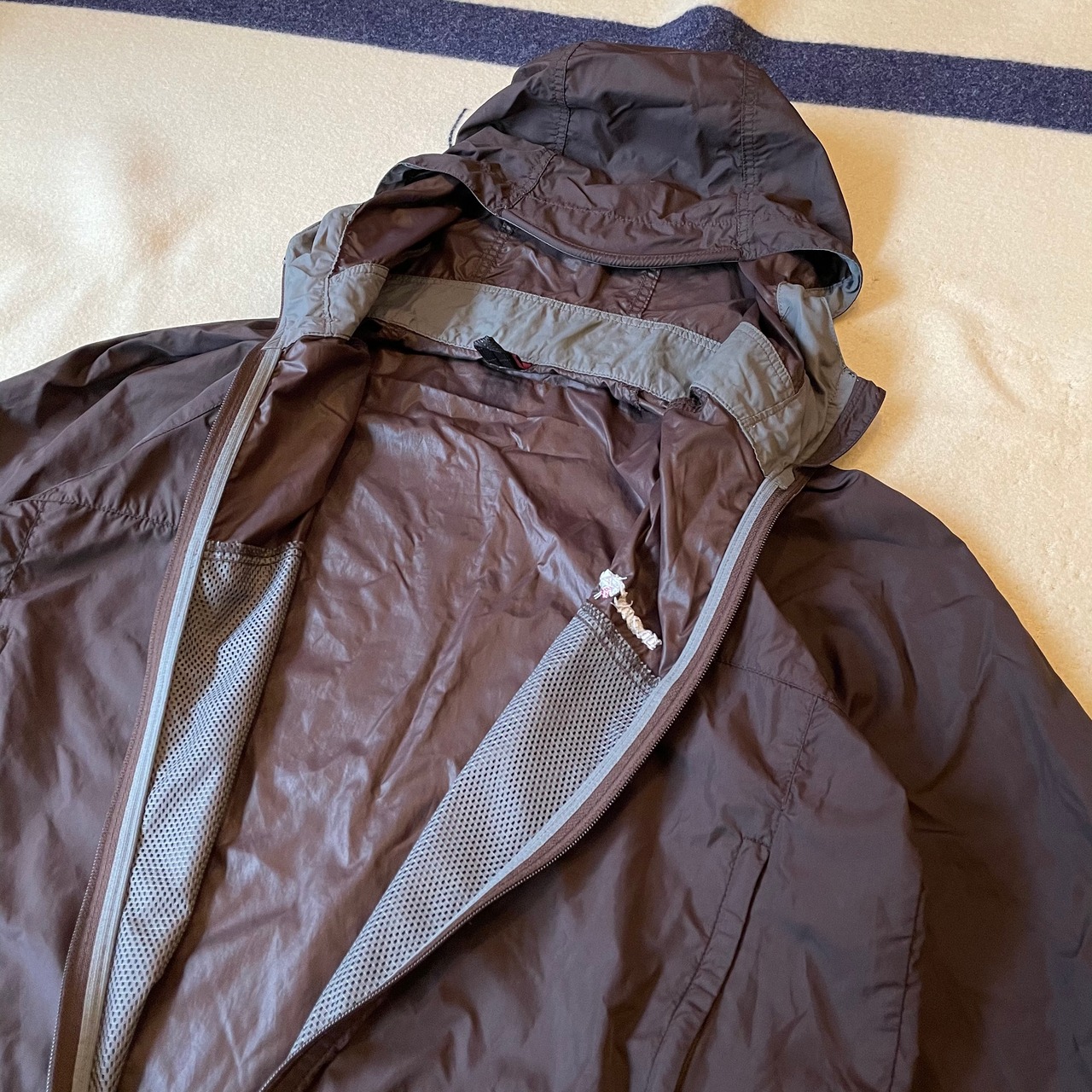 montbellのナイロンマウンテンパーカー。薄手のナイロンシェルです。フロントジップの取っ手に欠け、バック側に掻き傷でできた小さい穴あり。広がる様子もなく主観ですが着用する分には気になりません。