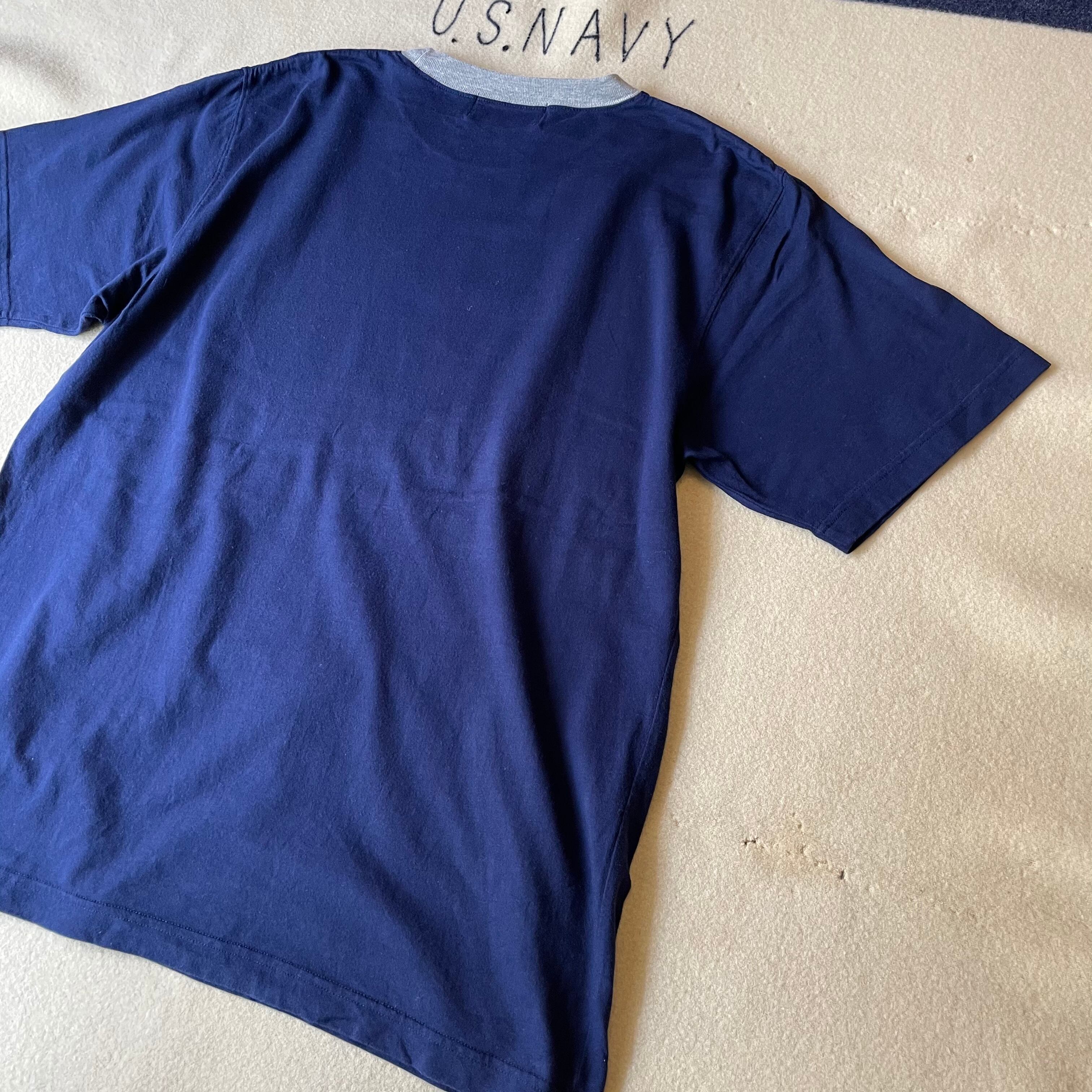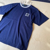 ネイビーカラーに首回りにグレーのトリムが入ります。トリムTとはまた違った雰囲気がありサイズも大きい為どこかストリート感があります。