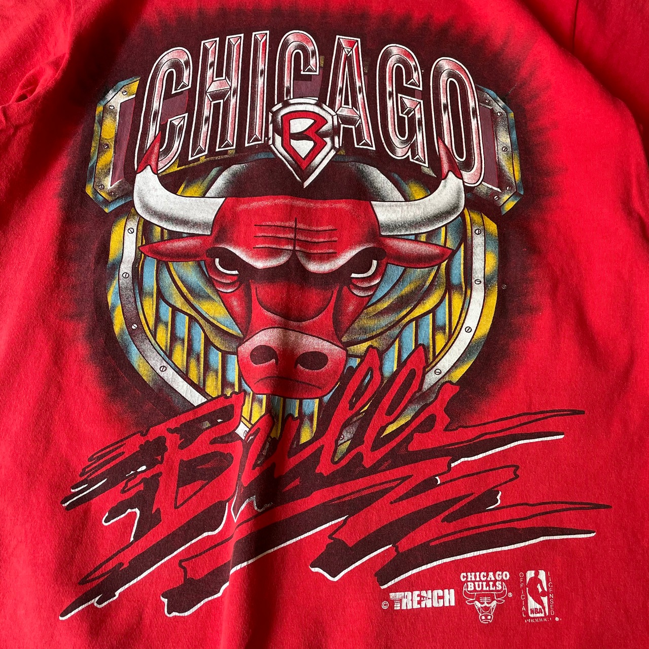 90s頃のCHICAGO BULLS。オフィシャルライセンスものです。チームカラーのビビットなレッドに90sらしいプリントは今のストリートにも遜色なくハマると思います。