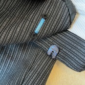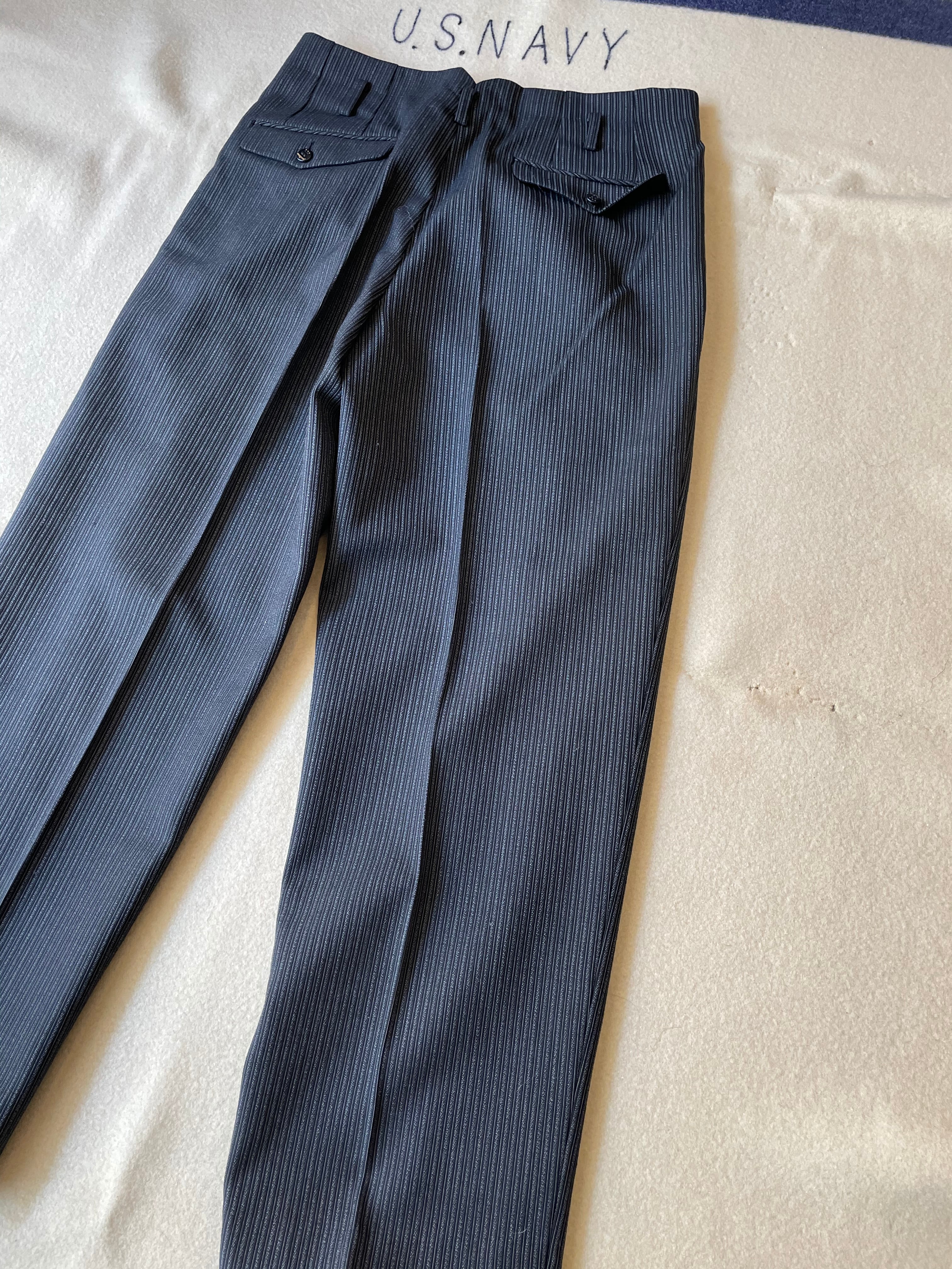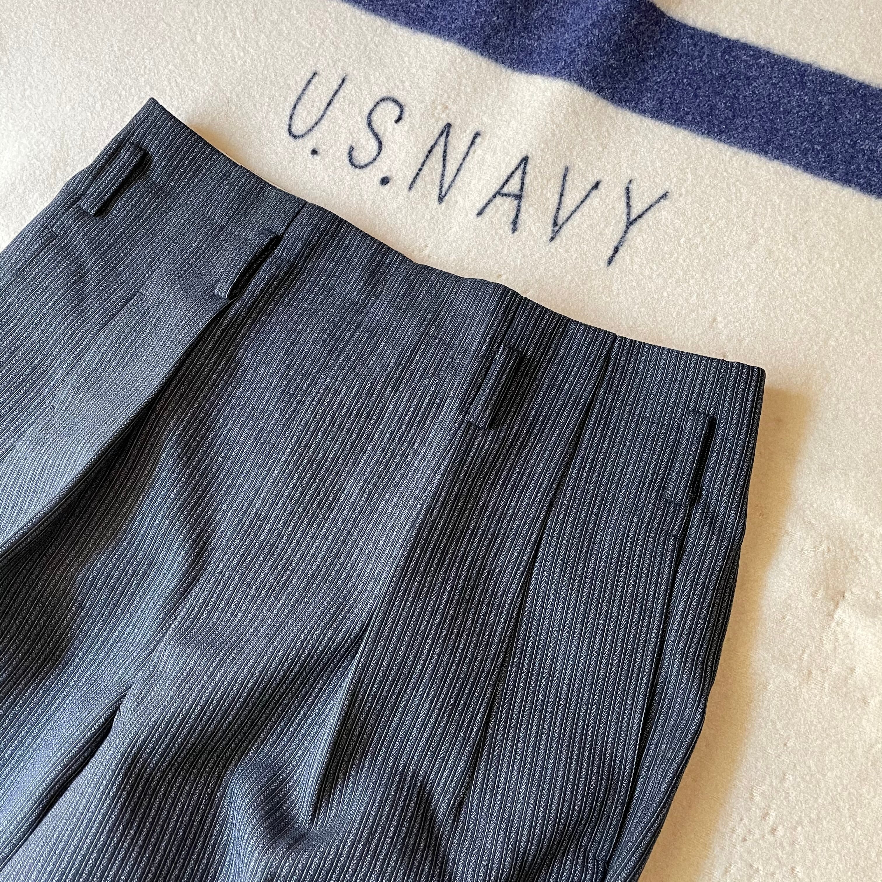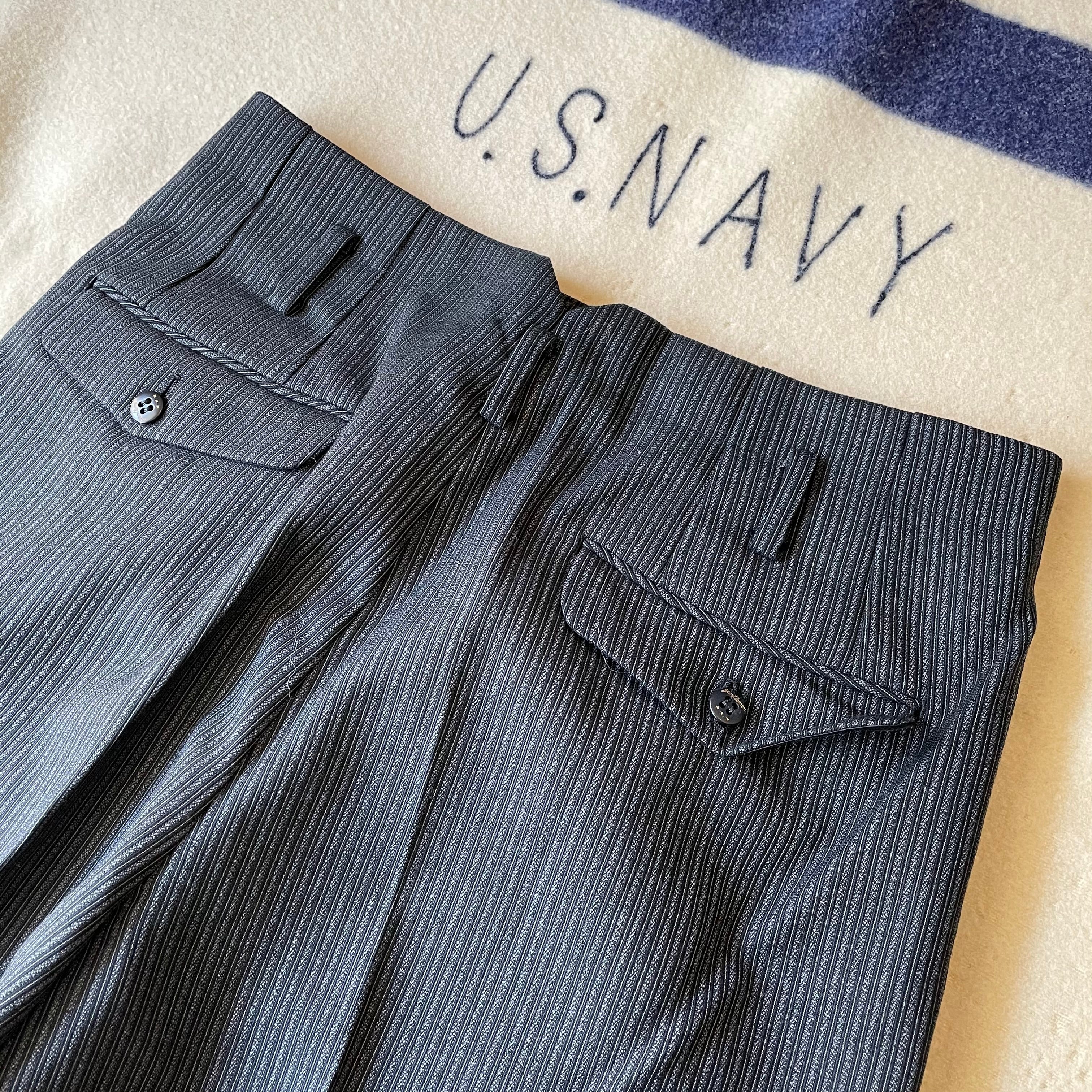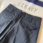 ウエストバックの割れやフロントポケットの位置、ベルトループなどアメリカ製のヴィンテージスラックスと似た作りです。綺麗なストライプパターンはフランスヴィンテージのスラックスにも通ずる部分があると思います。