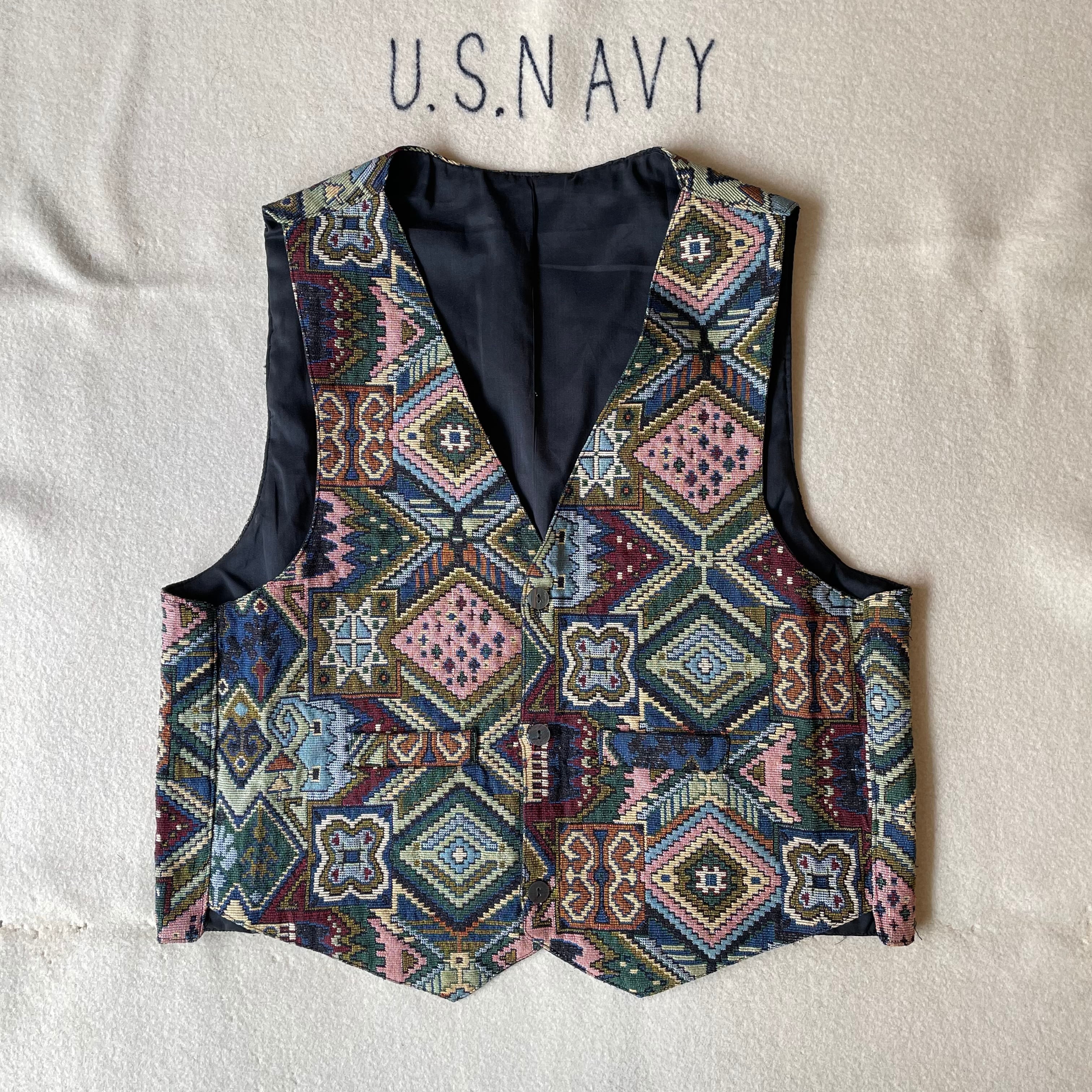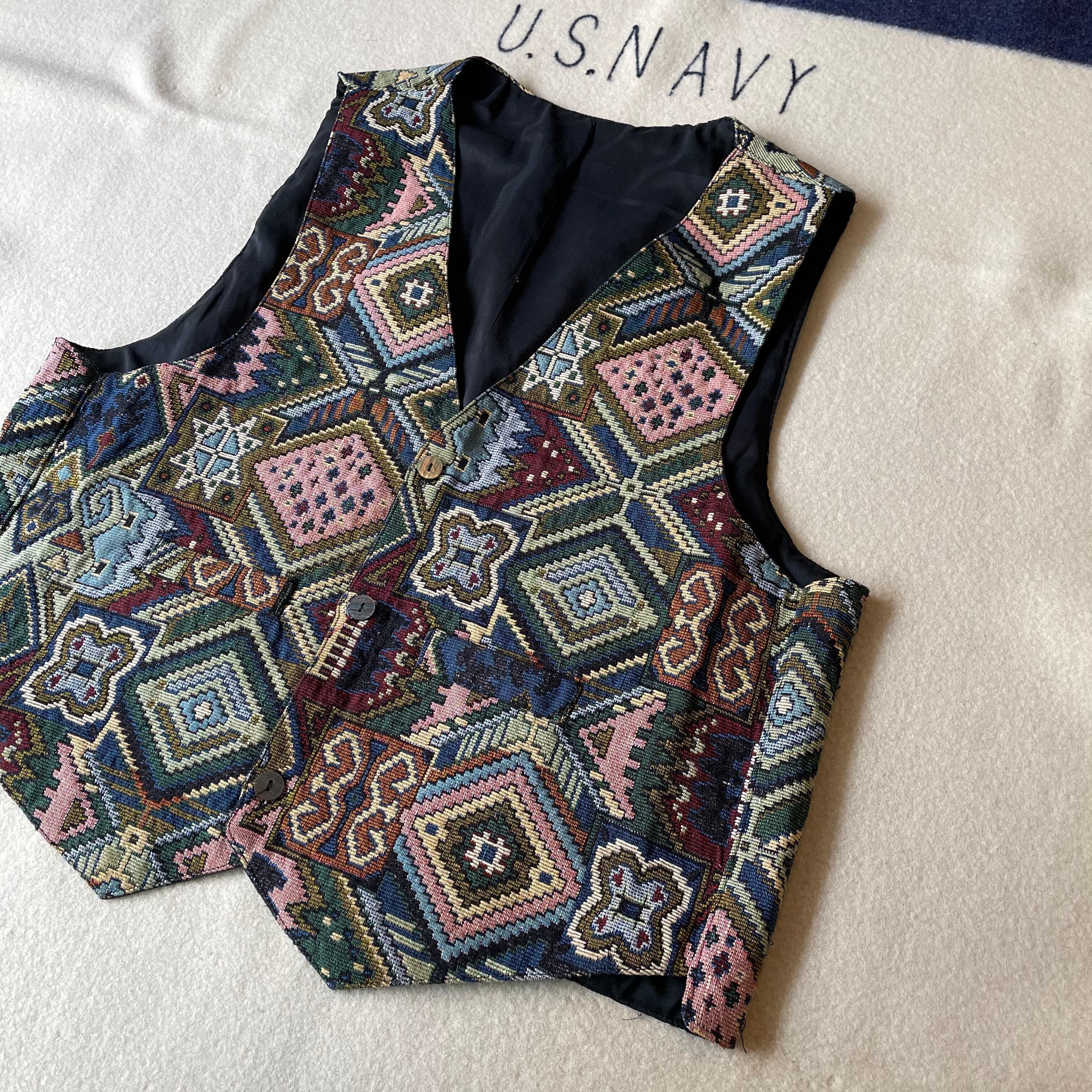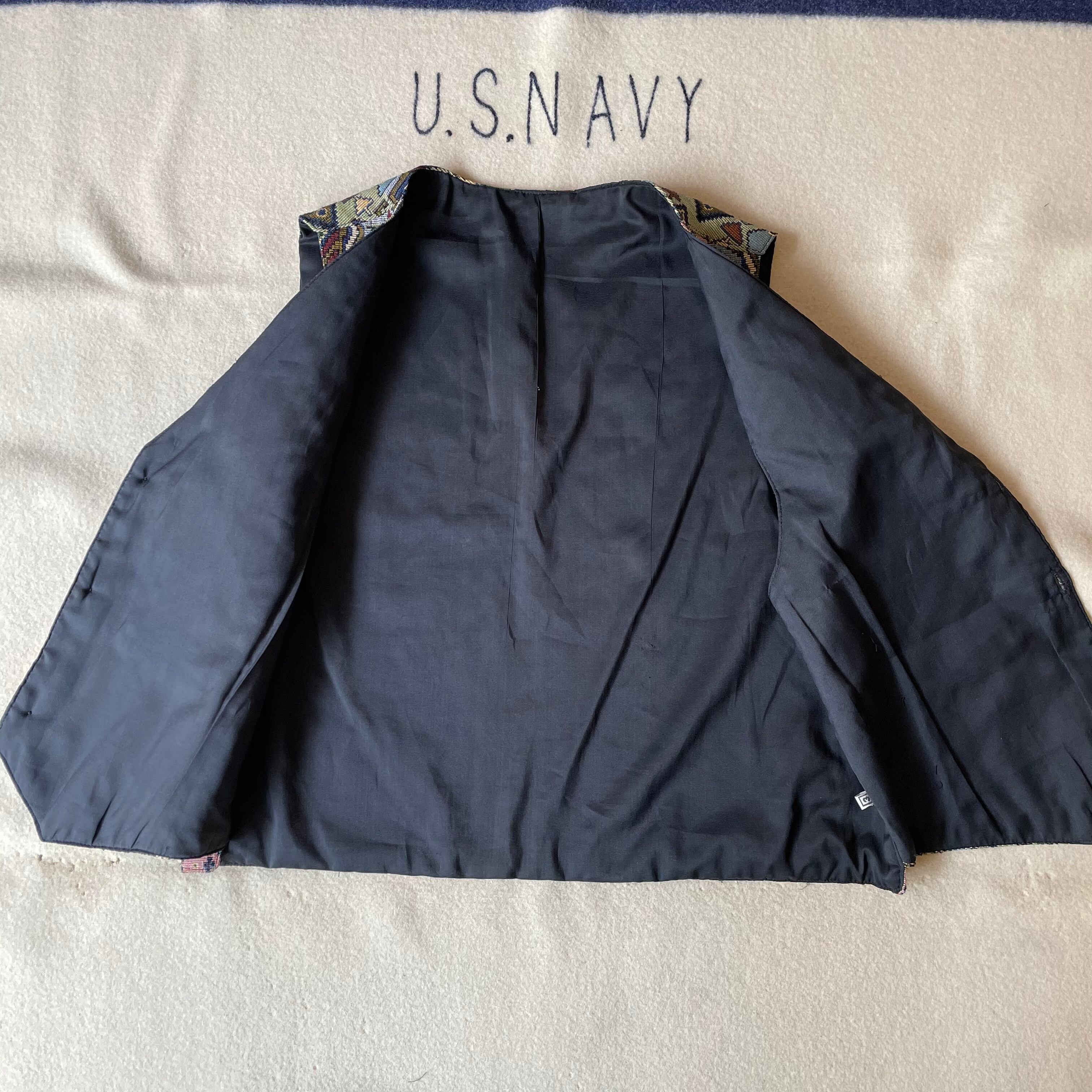 恐らくユーロ物のヴィンテージベスト。幾何学模様の総柄。ボタンには貝を使用しており当時でも高級なラインとして作られた一着と思います。