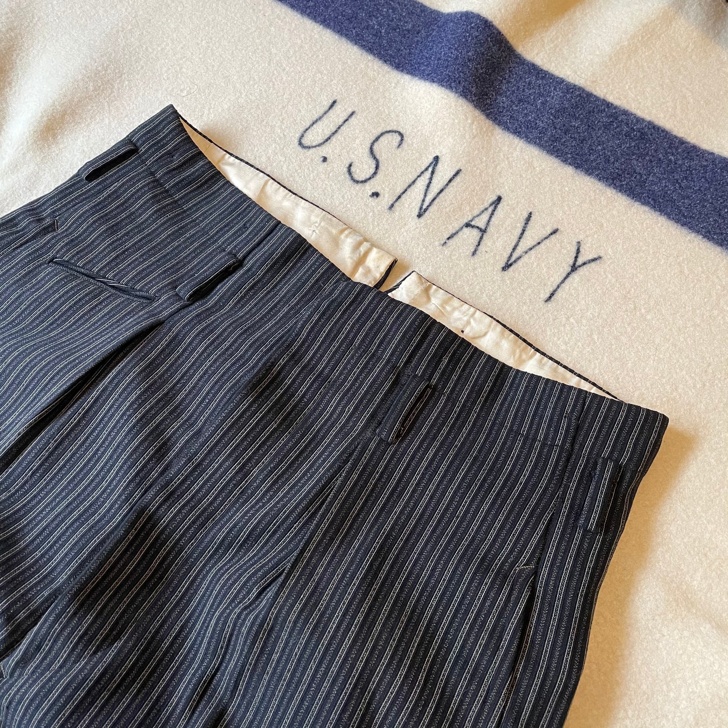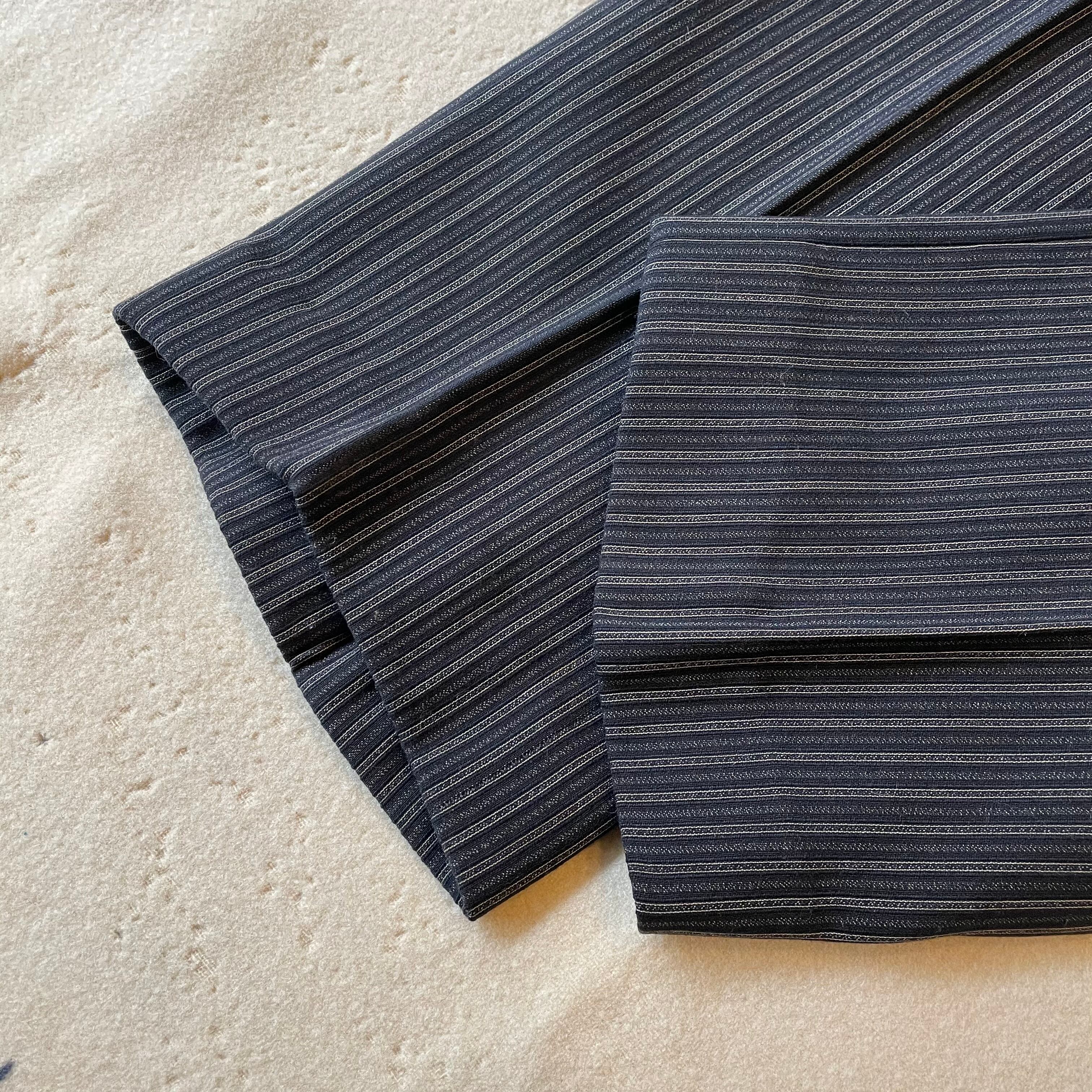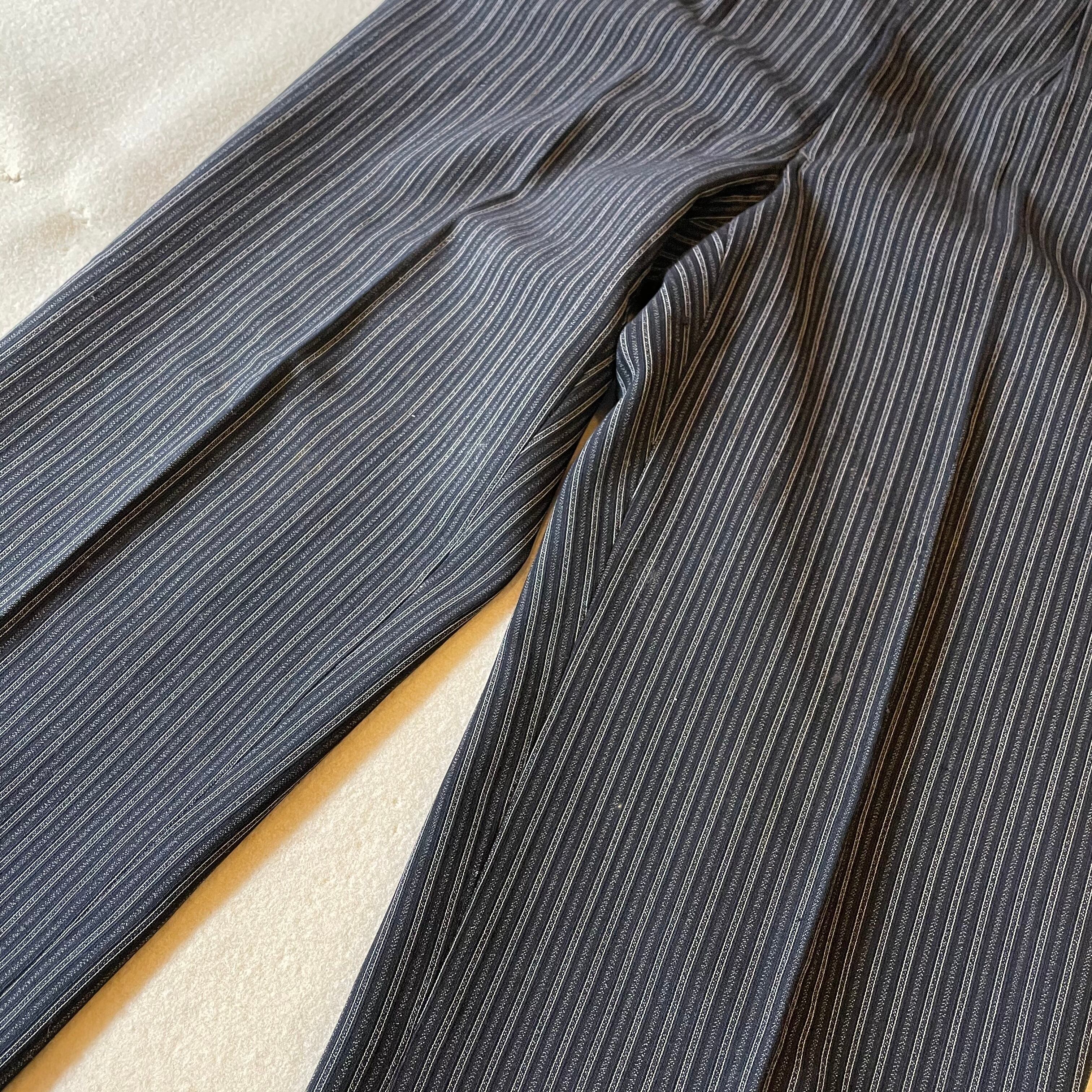 ウエストバックの割れやフロントポケットの位置、ベルトループなどアメリカ製のヴィンテージスラックスと似た作りです。綺麗なストライプパターンはフランスヴィンテージのスラックスにも通ずる部分があると思います。