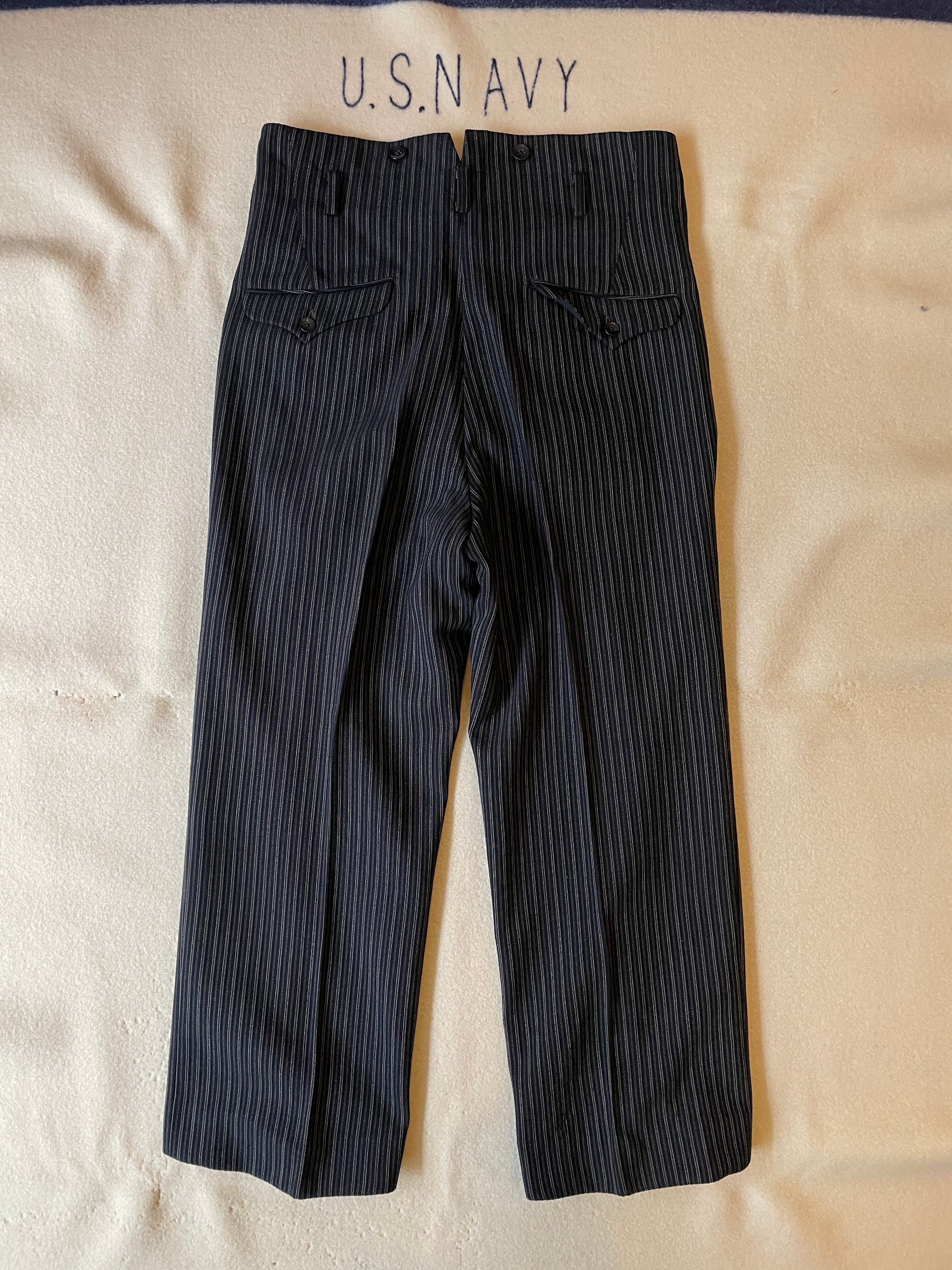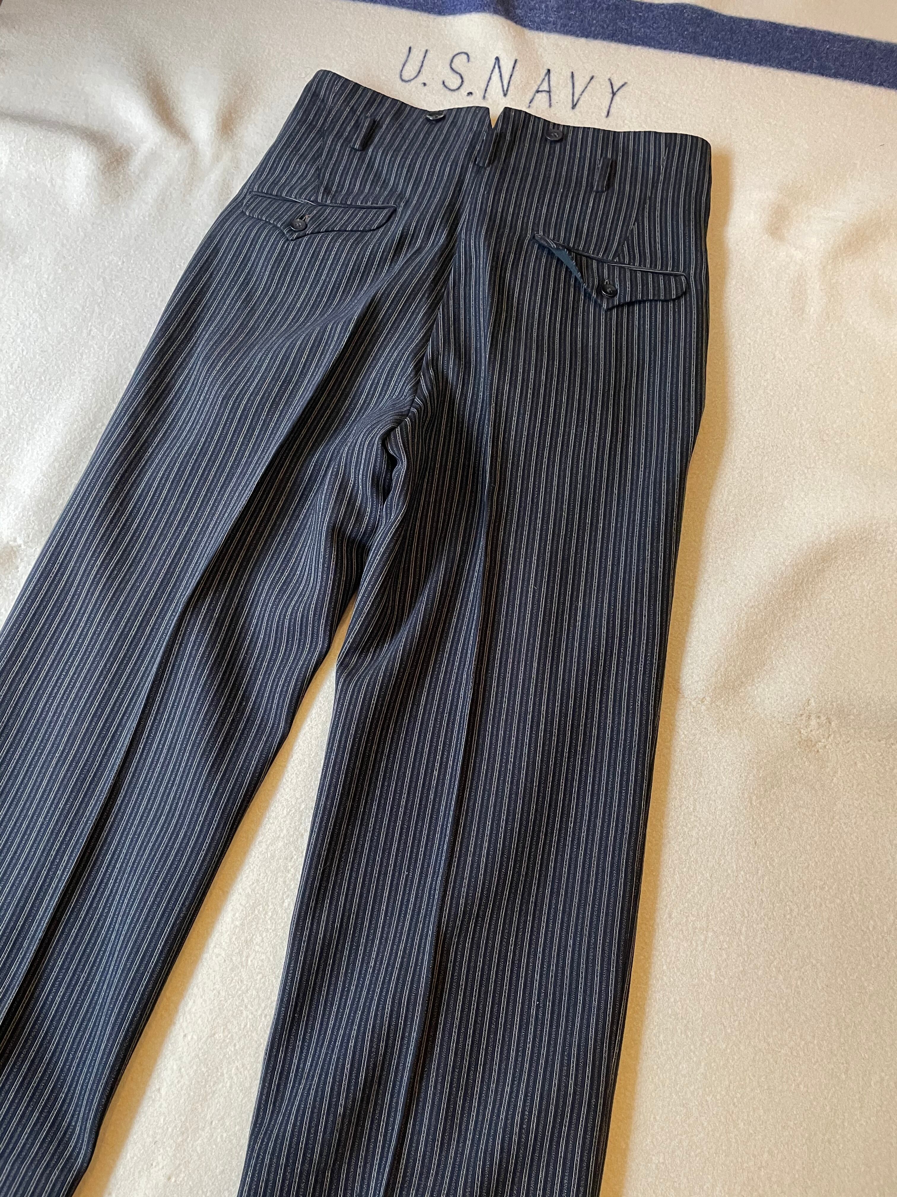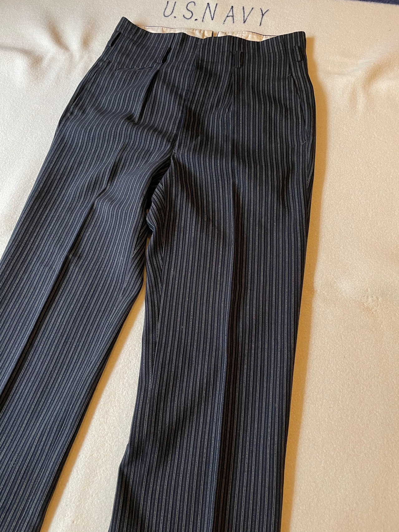 ウエストバックの割れやフロントポケットの位置、ベルトループなどアメリカ製のヴィンテージスラックスと似た作りです。綺麗なストライプパターンはフランスヴィンテージのスラックスにも通ずる部分があると思います。
