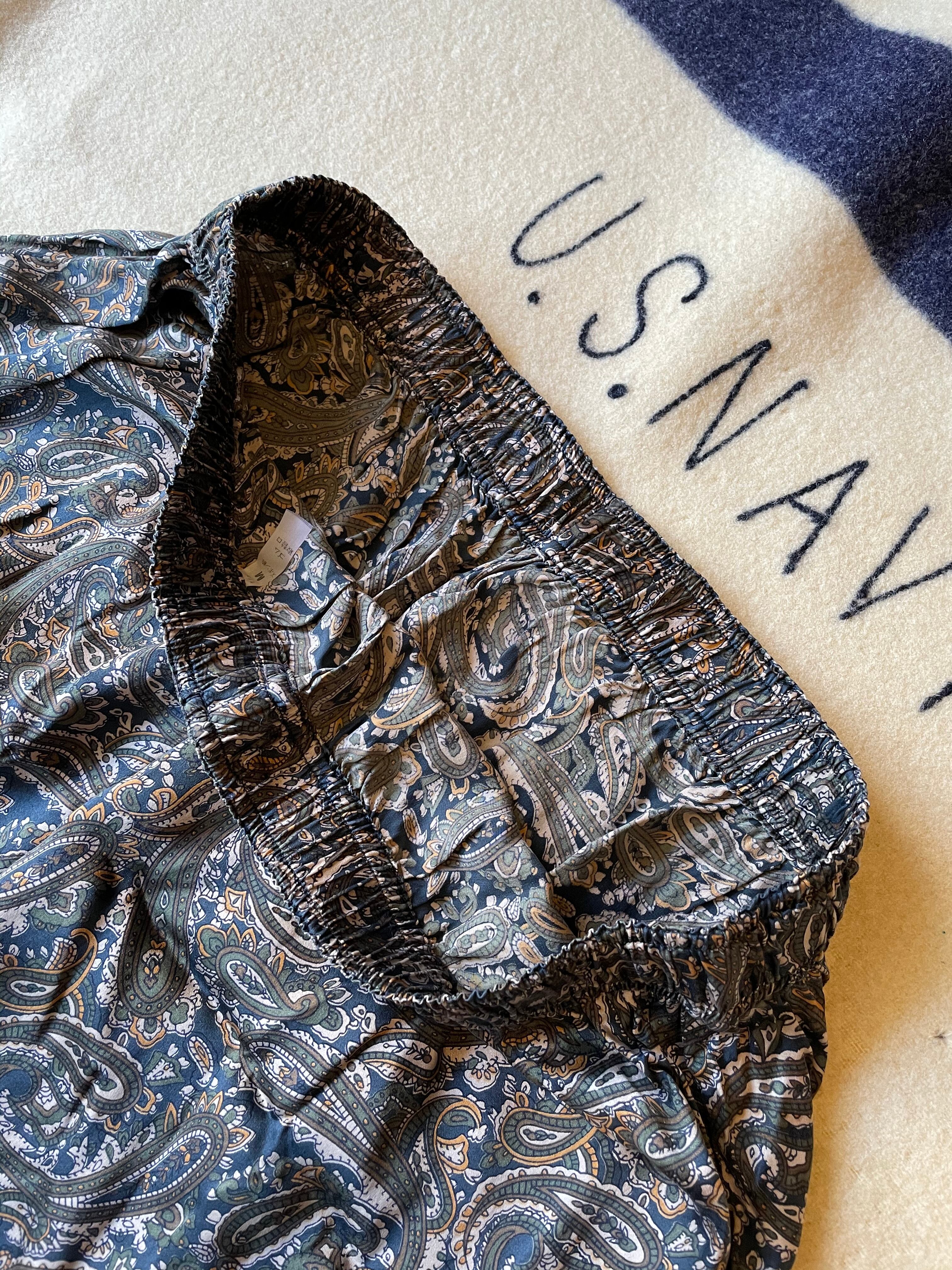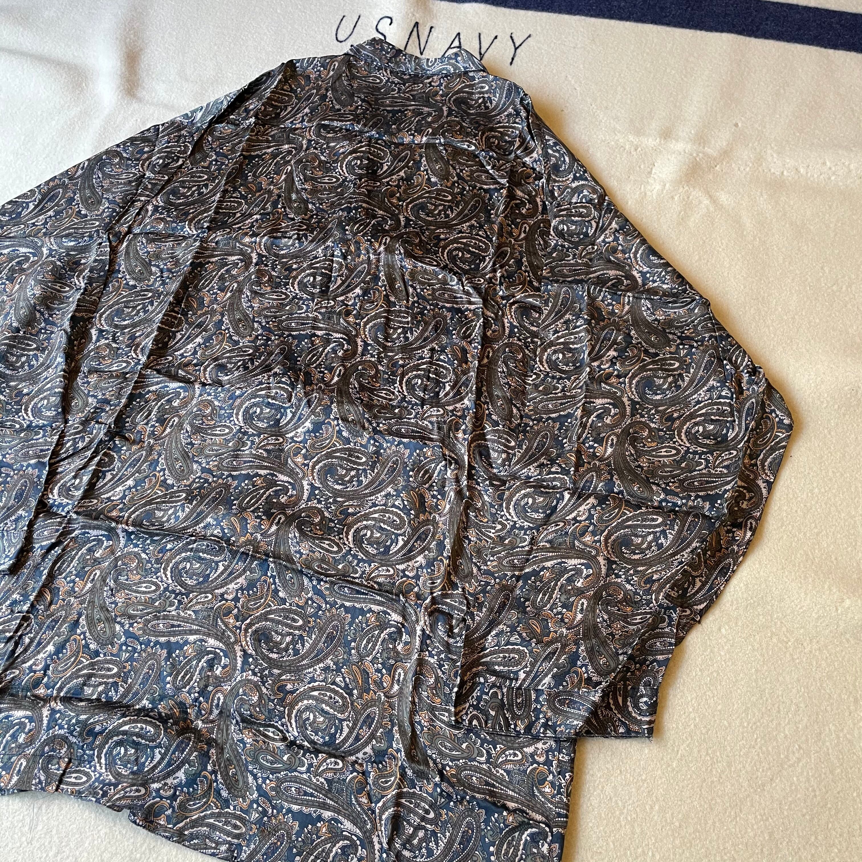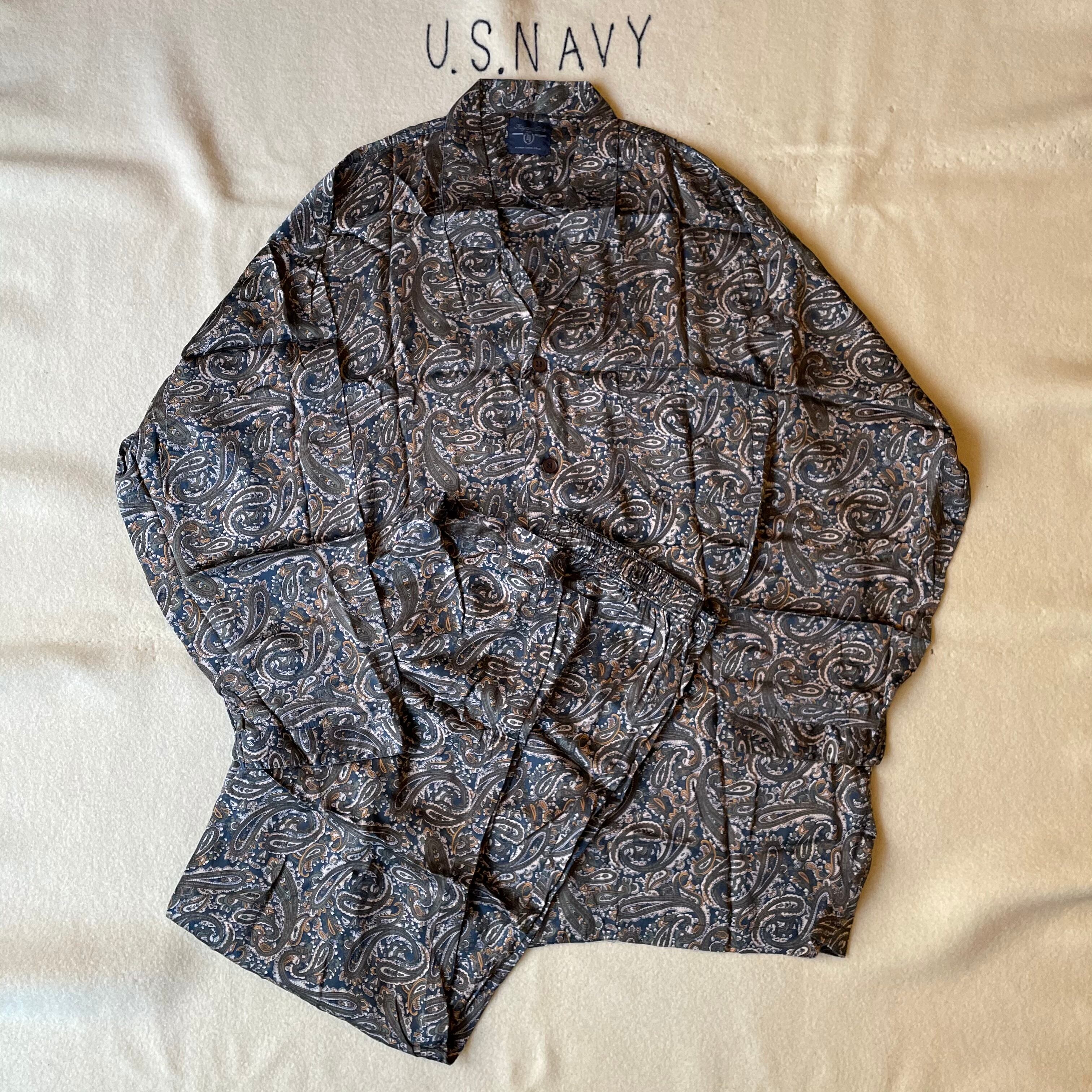90s頃のOLDシルクパジャマシャツとパンツのセットアップ。ペイズリーパターン、ビッグサイズでゆったりめに着用できると思います。