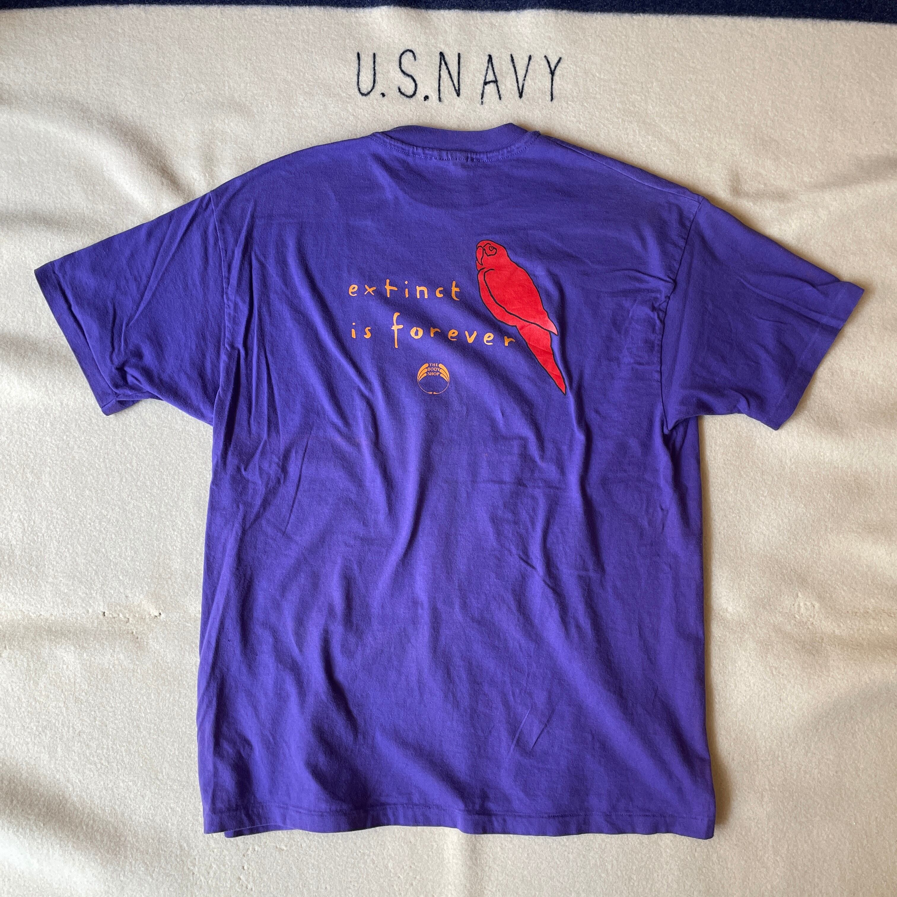 深いメッセージT。extinct is forever。絶滅は永遠に。THE BODY SHOPの動物愛護、チャリティーの販促Tシャツかと思います。