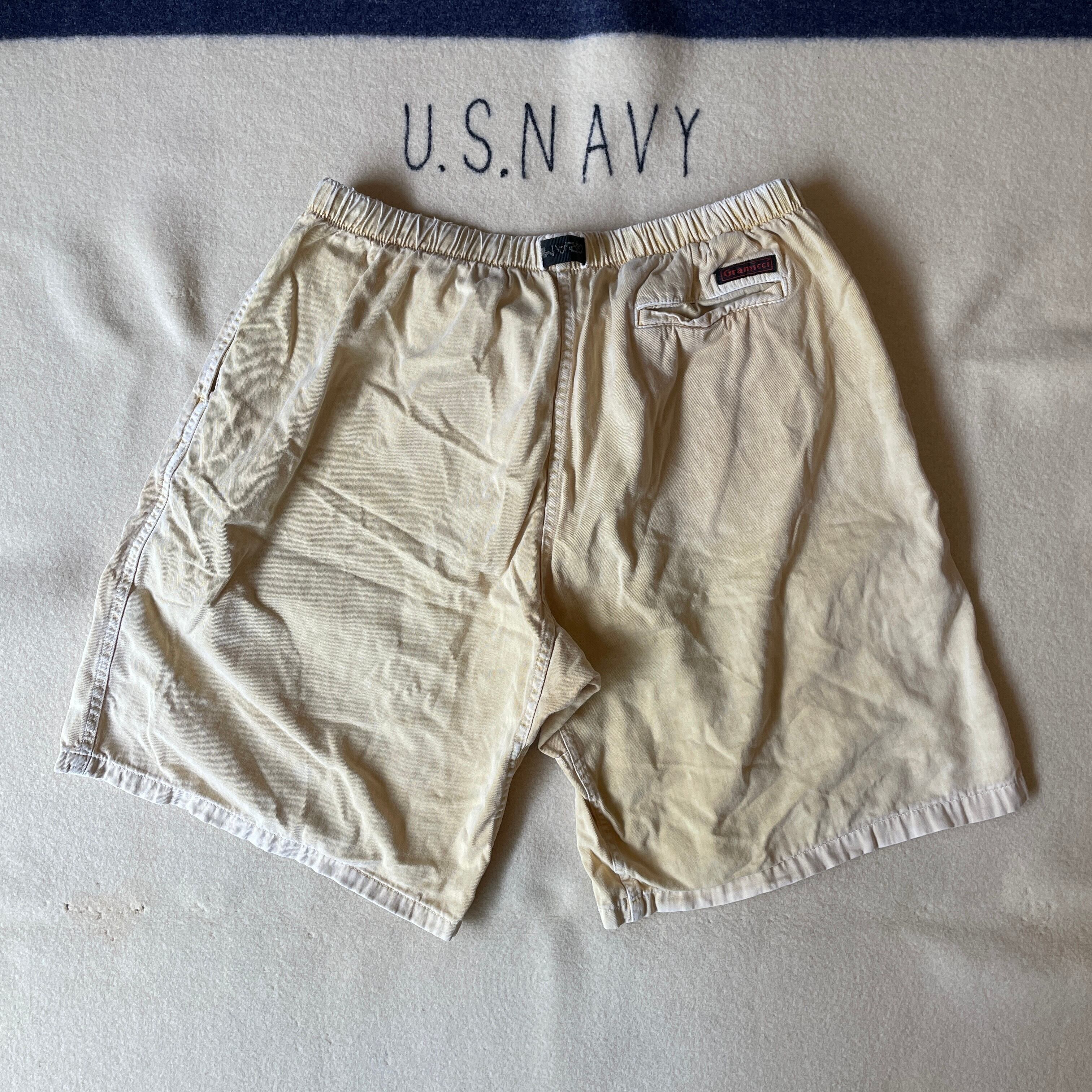 良いフェイド感の出たOLD gramicciのクライミングショーツ。黄色がかったクリーム色が大分褪色し良い雰囲気でてます。