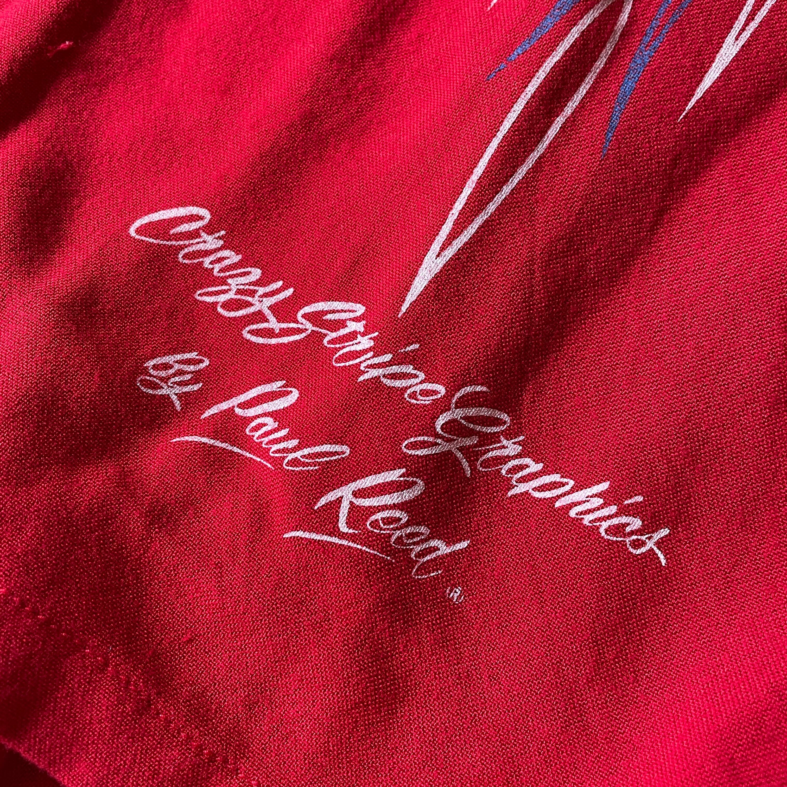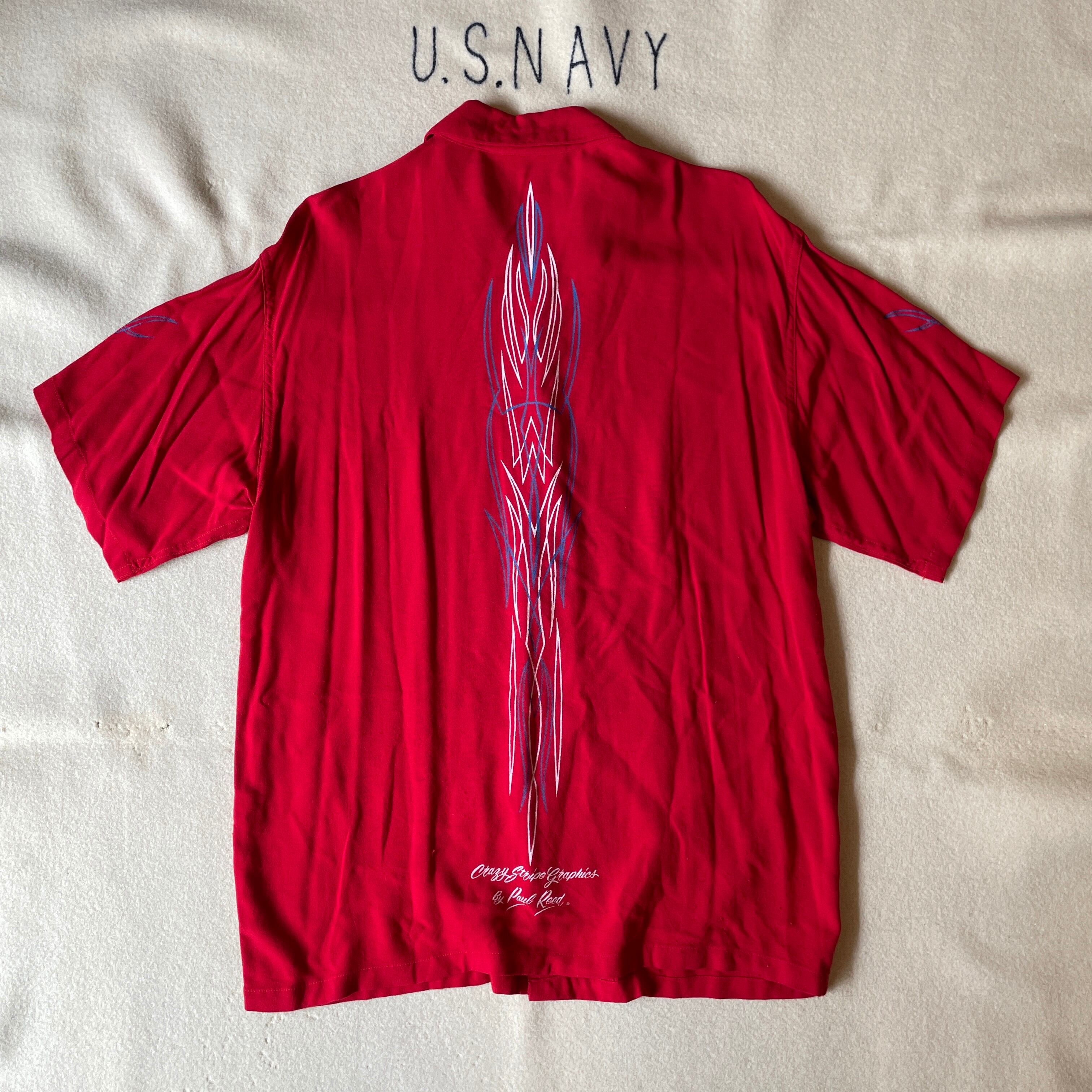 90s頃のOLDモデル。当時TOYOが展開していたPAUL REEDのレーヨンシャツ。形は50s-60sのボーリングシャツベースにローライダー系のグラフィックを施したロカビリーな一着。