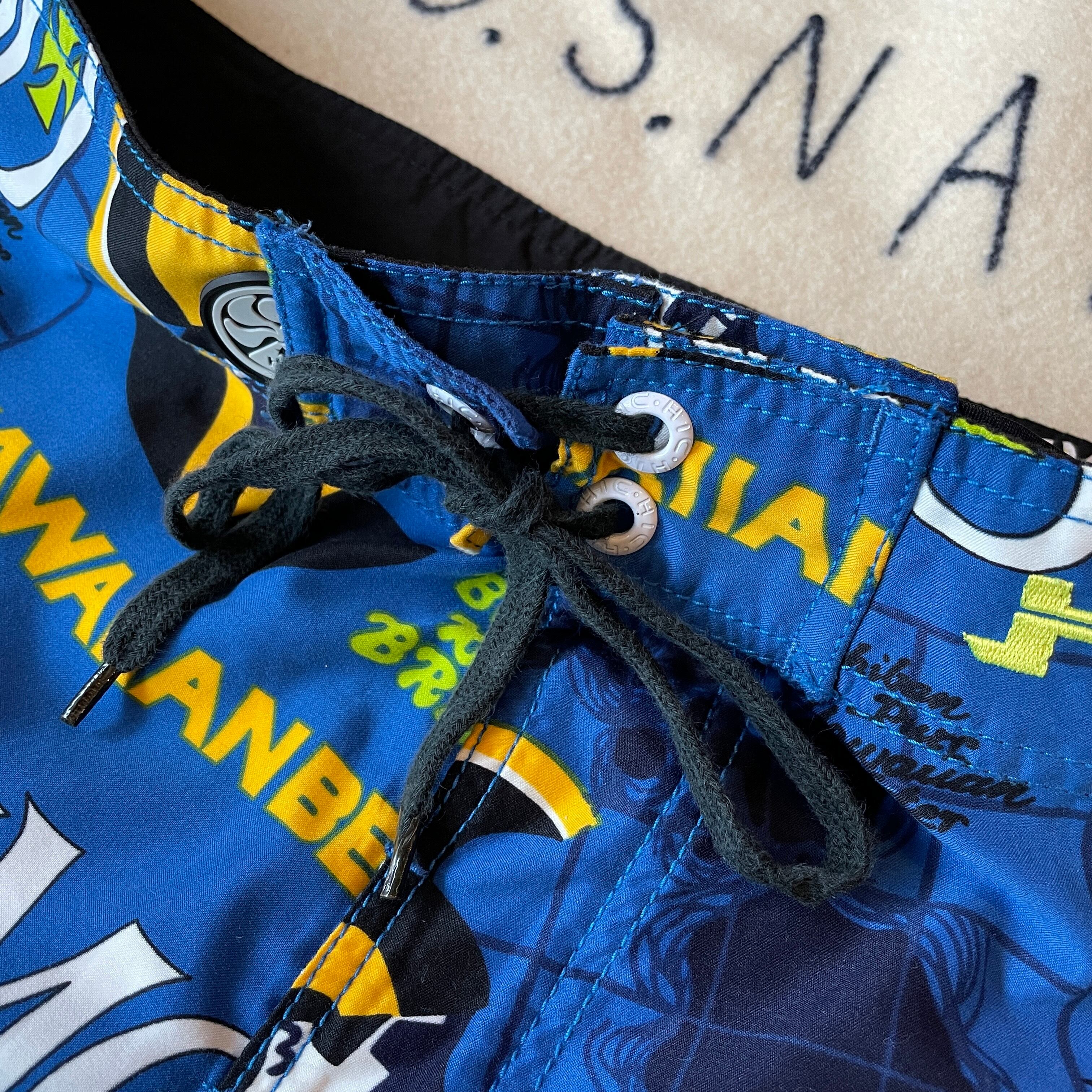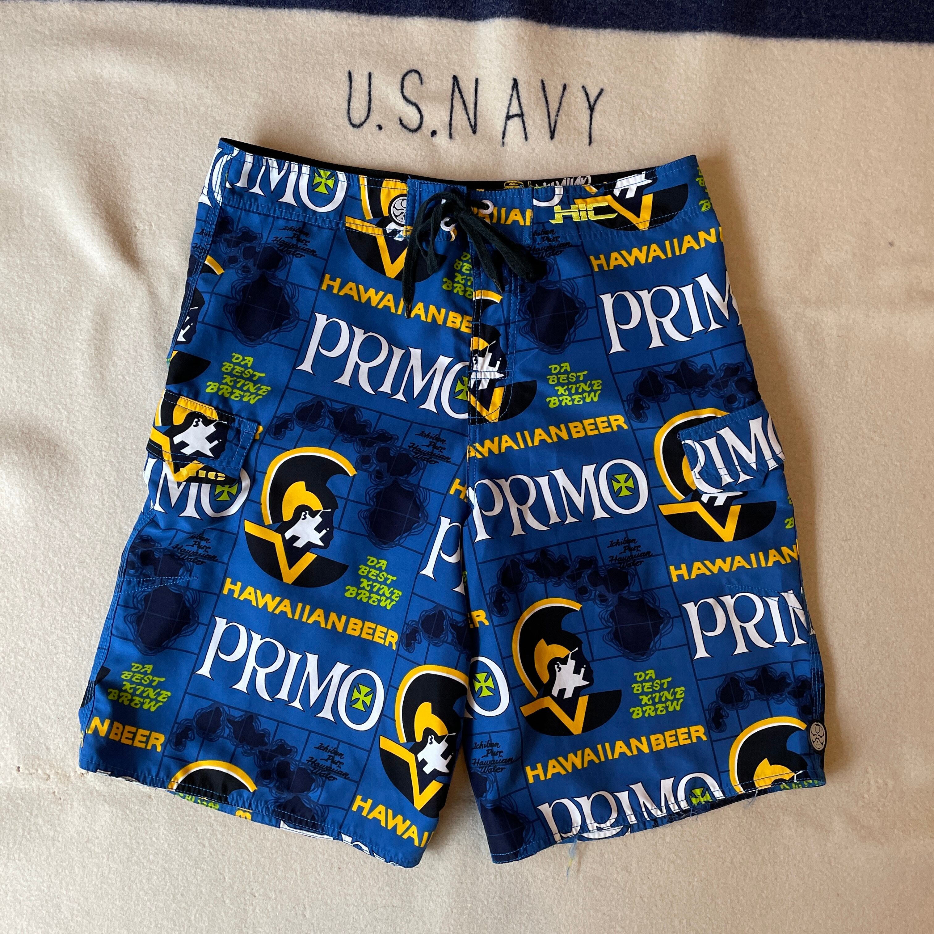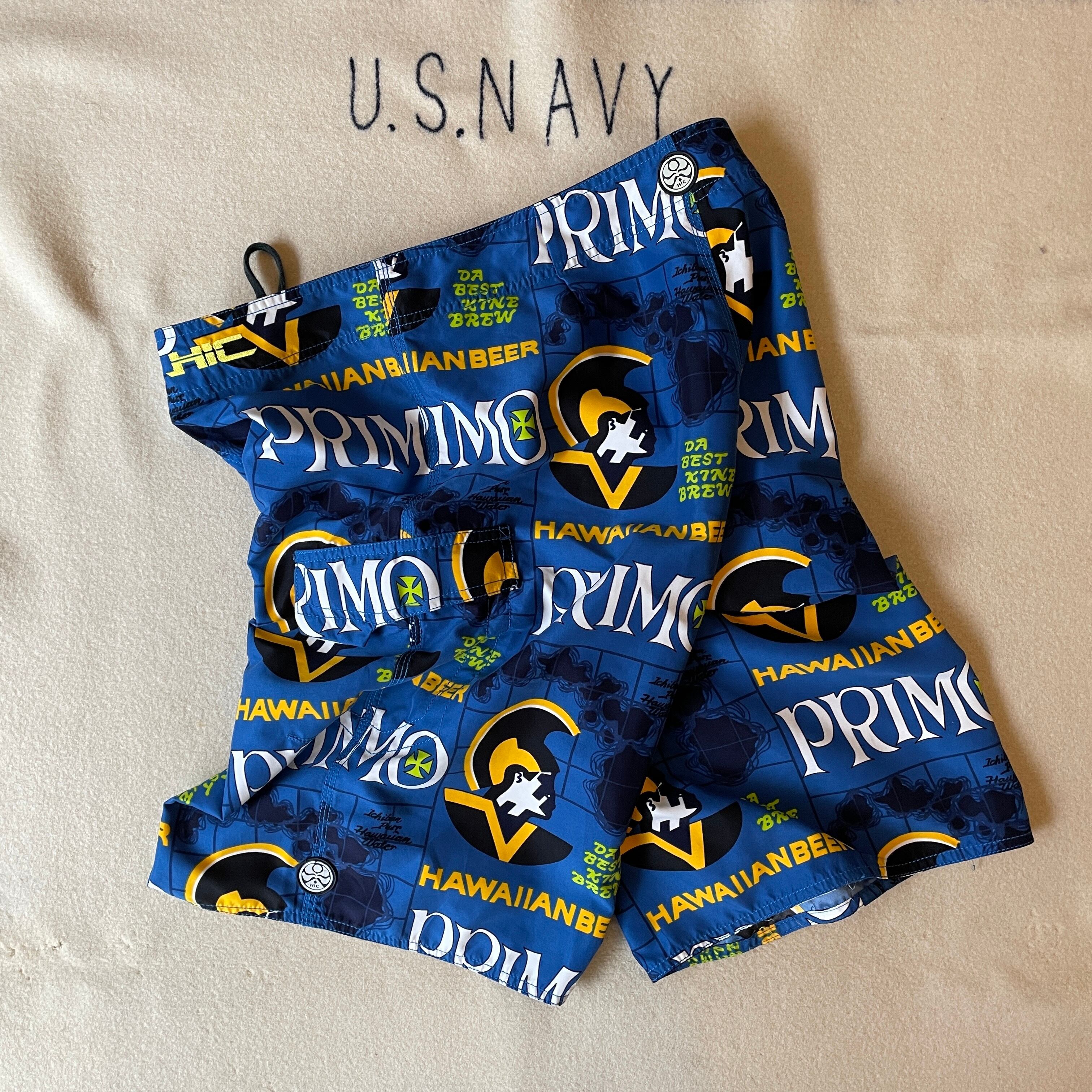 00s以降と思います。OLDのPRIMOビール総柄スイムショーツ。いい感じのバギーシルエット。そのままタウンユースでもいけるデザインです。
