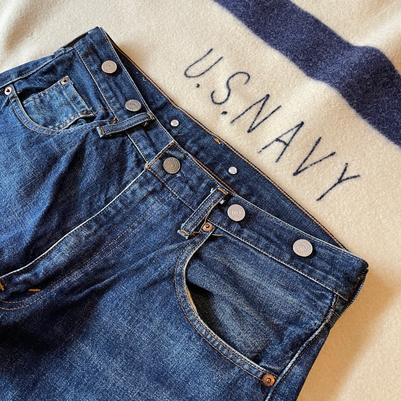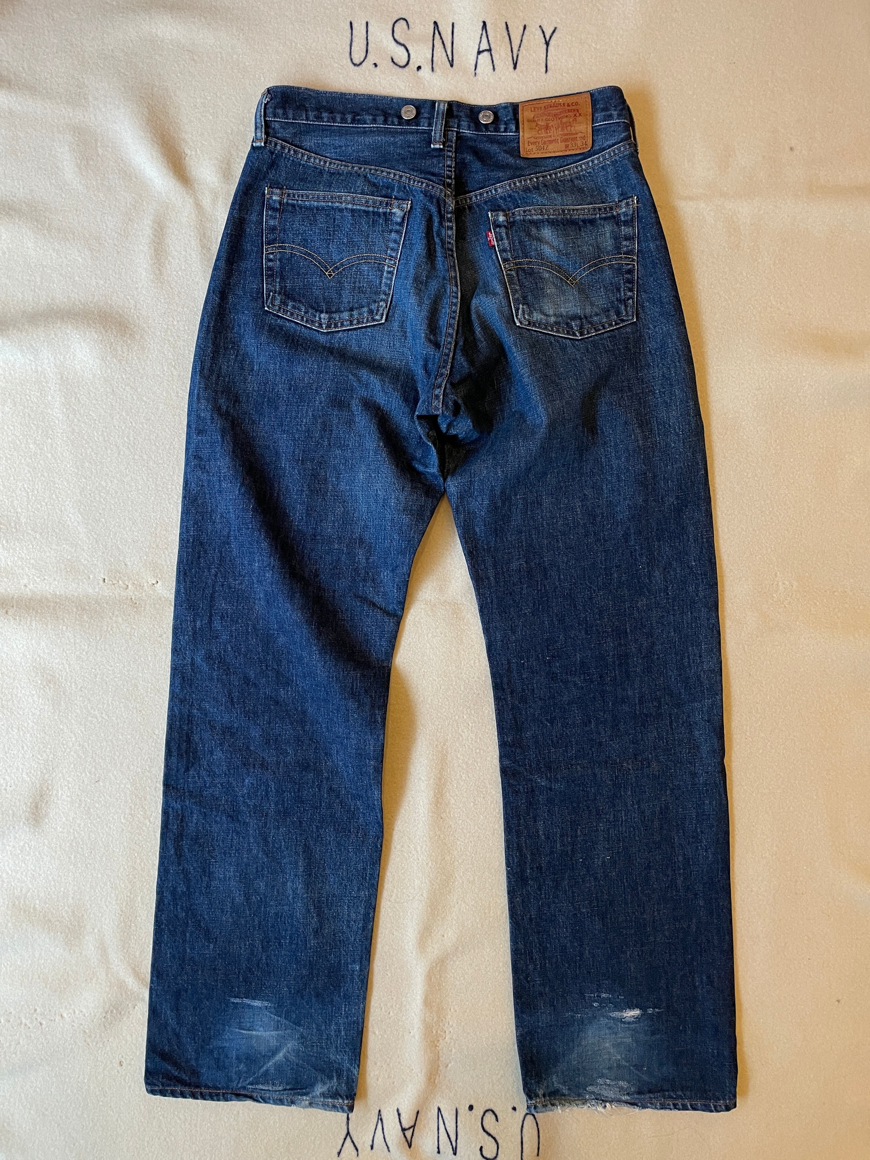90s頃のLevi’s504ZXX。日本製のクオリティの高い復刻です。サスペンダーボタンがつくモデルはあまり見かけずレアかと思います。色残り70%。裾口に若干の擦れがありますがこれから良い色落ちしてくるかと思います。