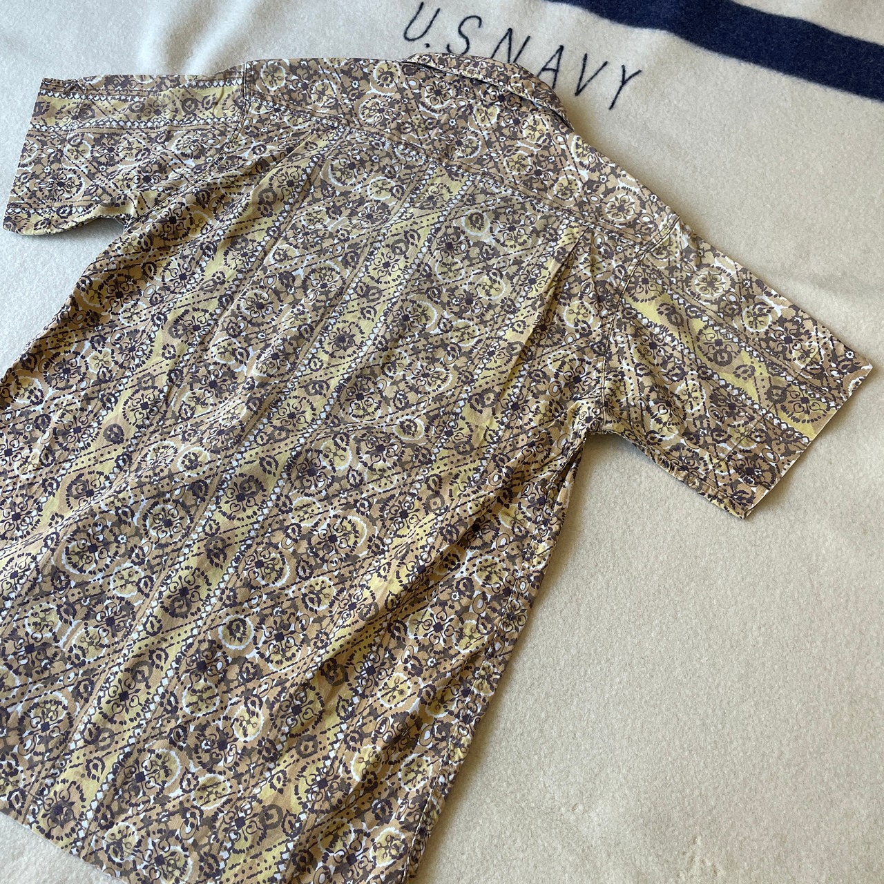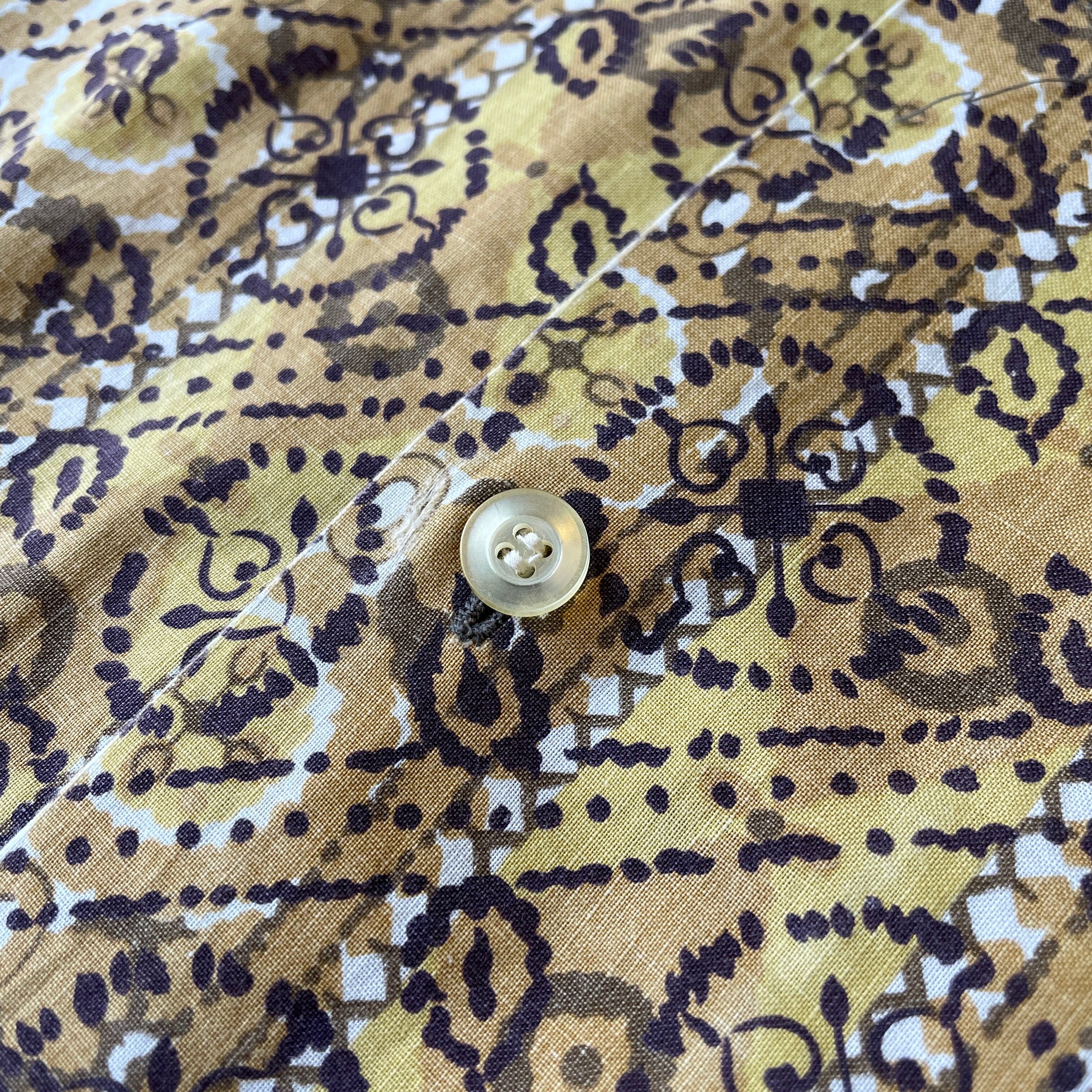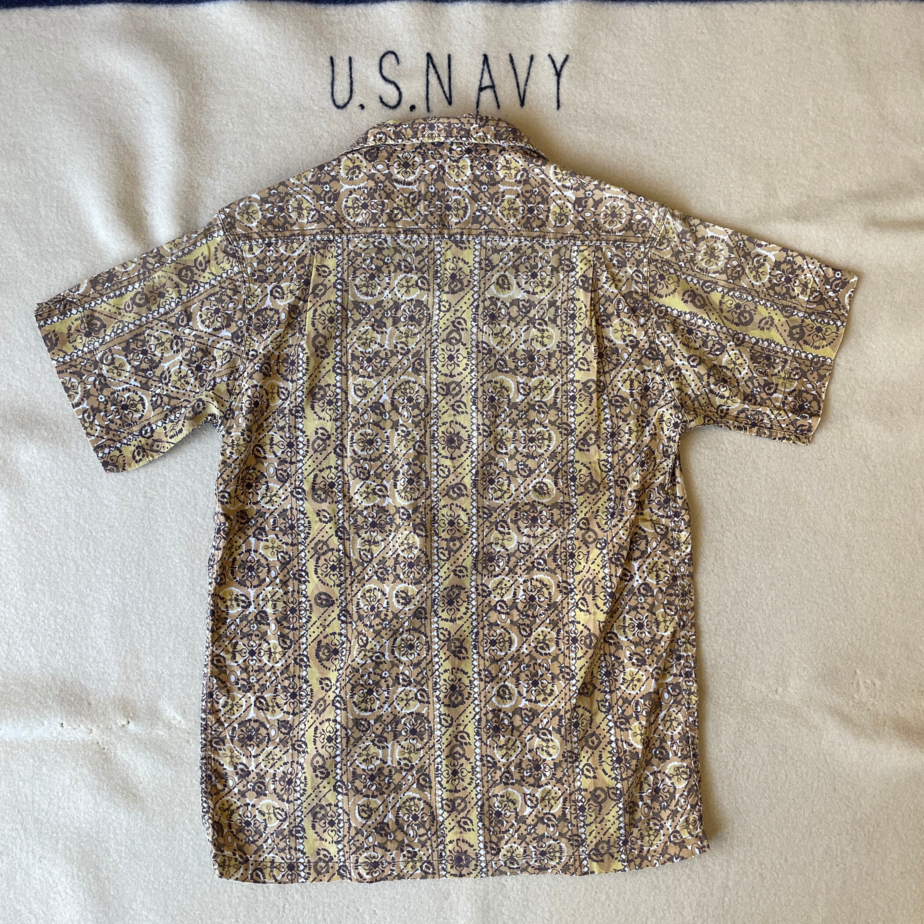 60s頃のオープンカラーシャツ。コットン100%、カラーはマスタード系のイエロー。60sあたりのものとは思えないスッキリとしたシルエット。