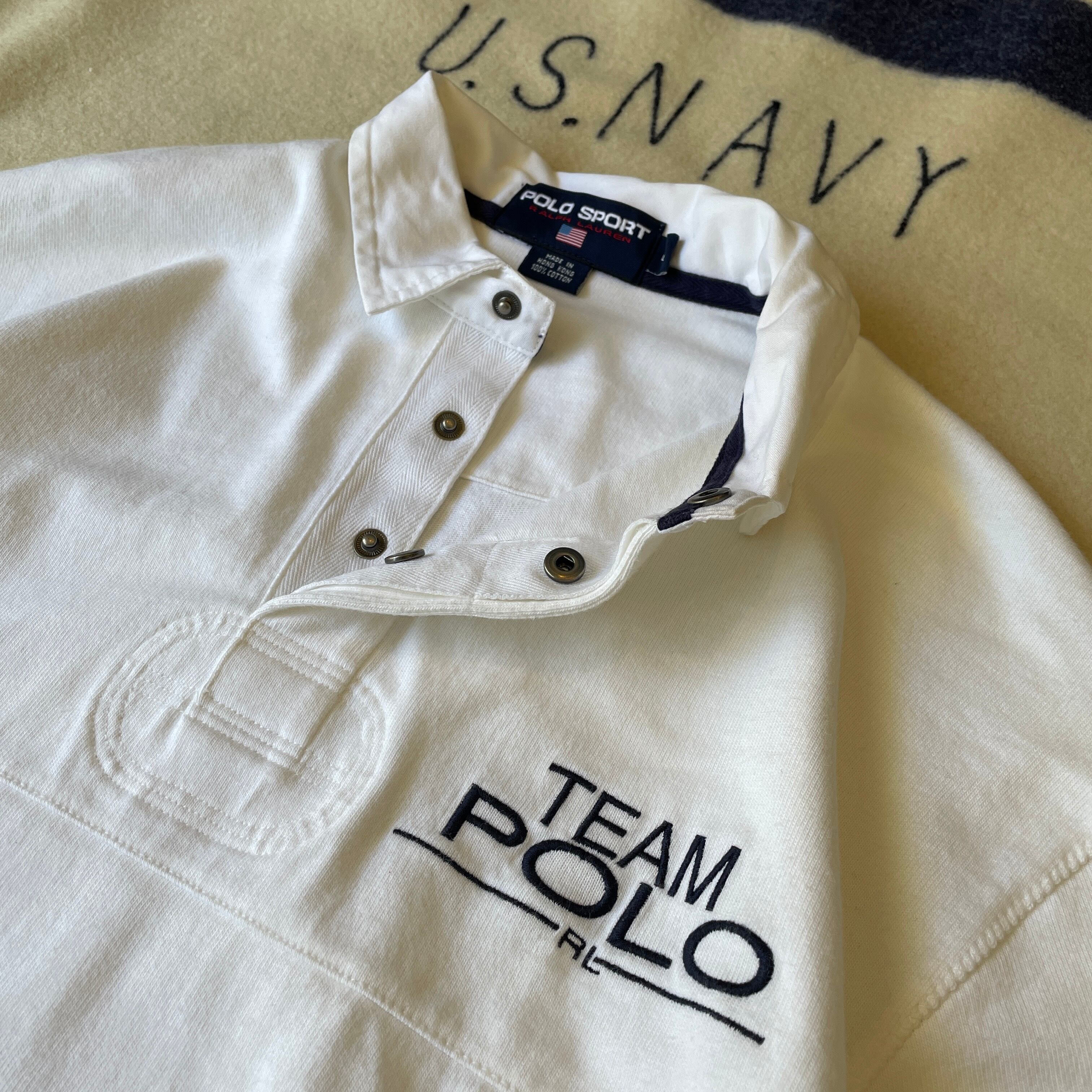 90s頃のPOLO SPORTS。胸、両肩にレーシングチームライクなTEAM POLO, RL67 Technologyのワンポイント。肘部には当て布付きです。