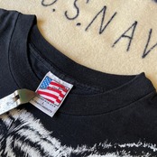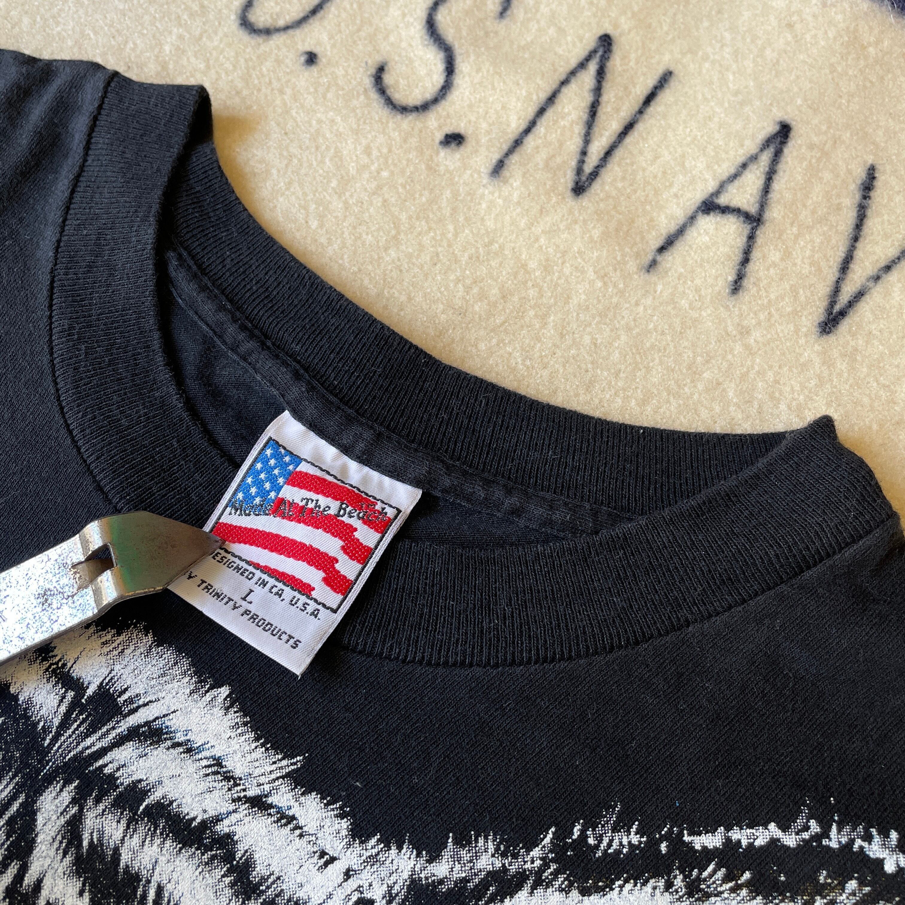 94sのコピーライトが入るヴィンテージTシャツ。カリフォルニア州にあるTシャツ専門店Trinity Productsのアニマルプリントシリーズ。ブラックボディにホワイトタイガーはインパクト大です。