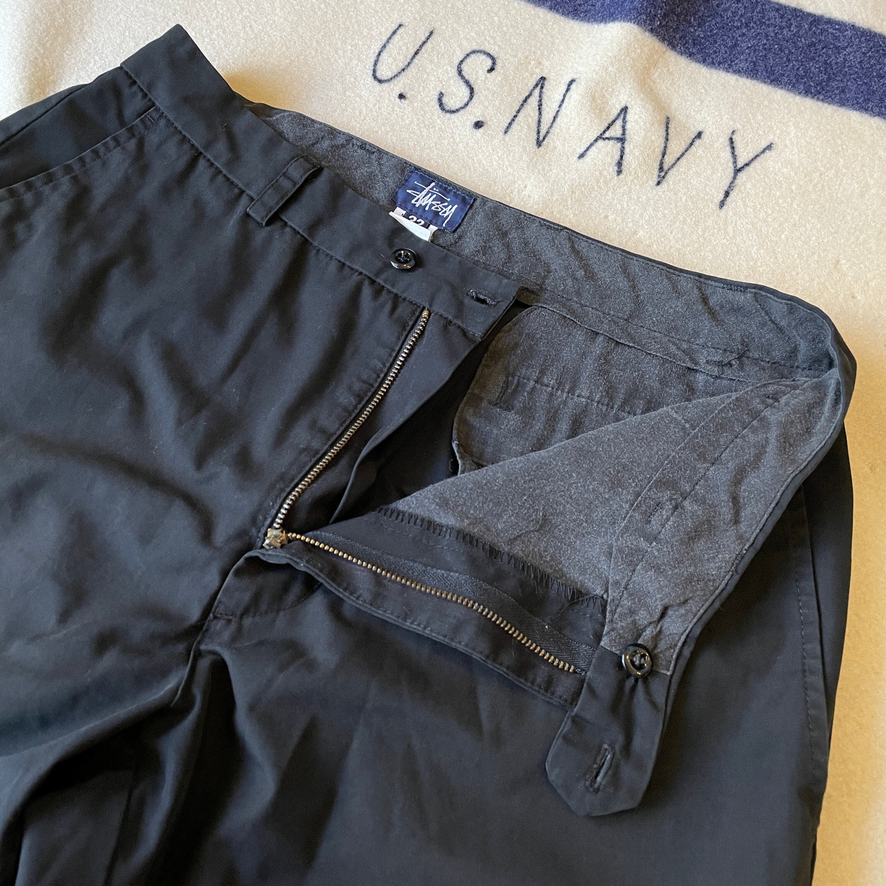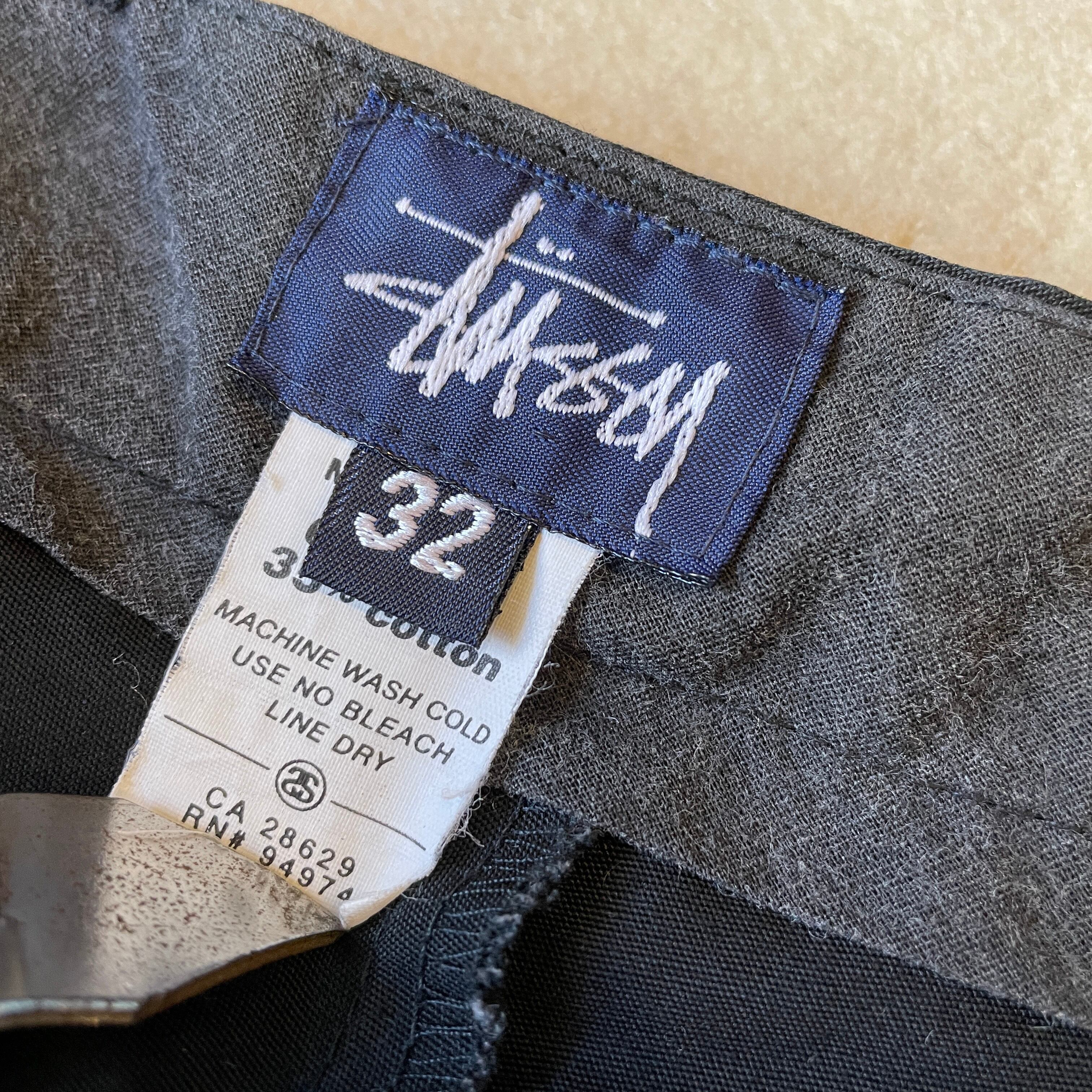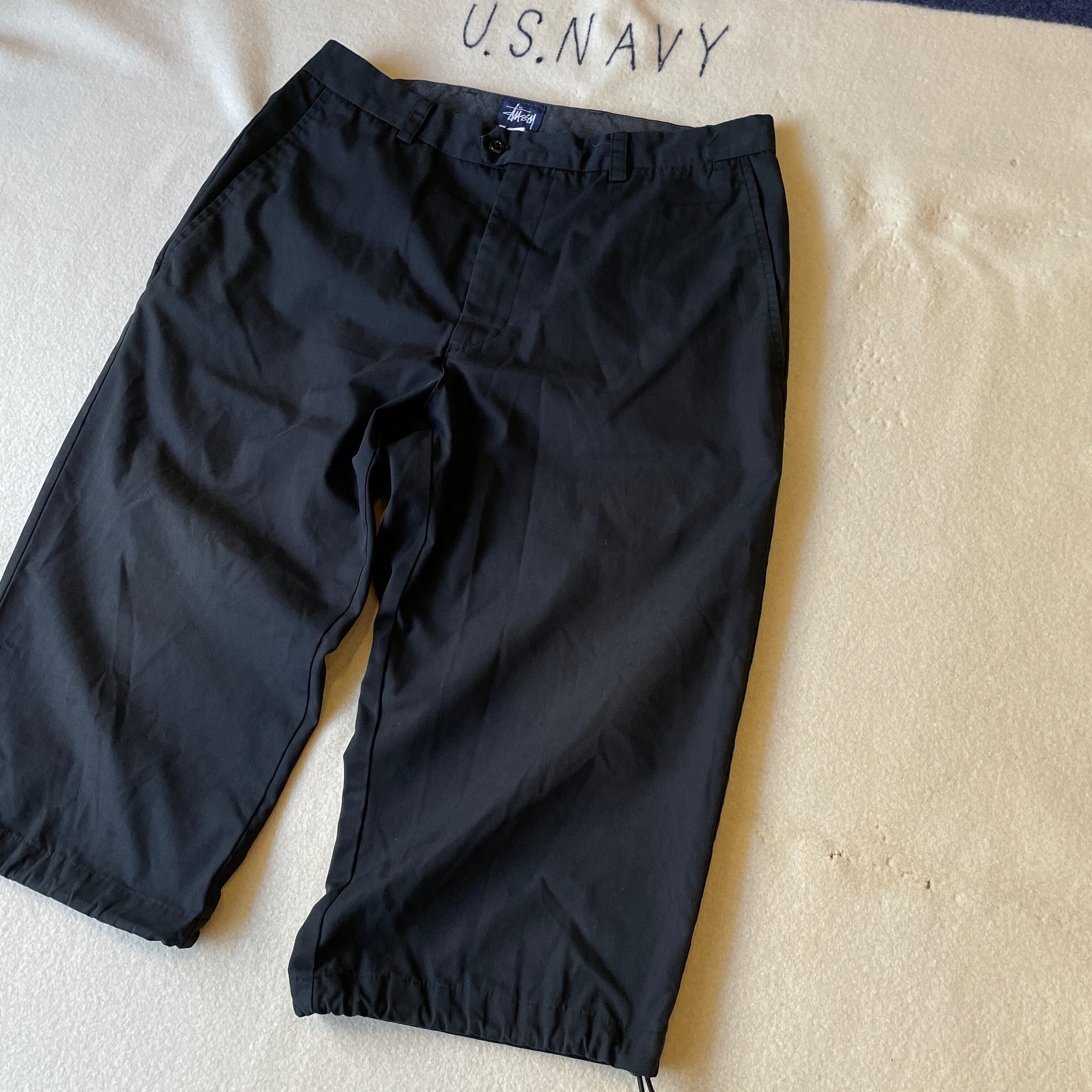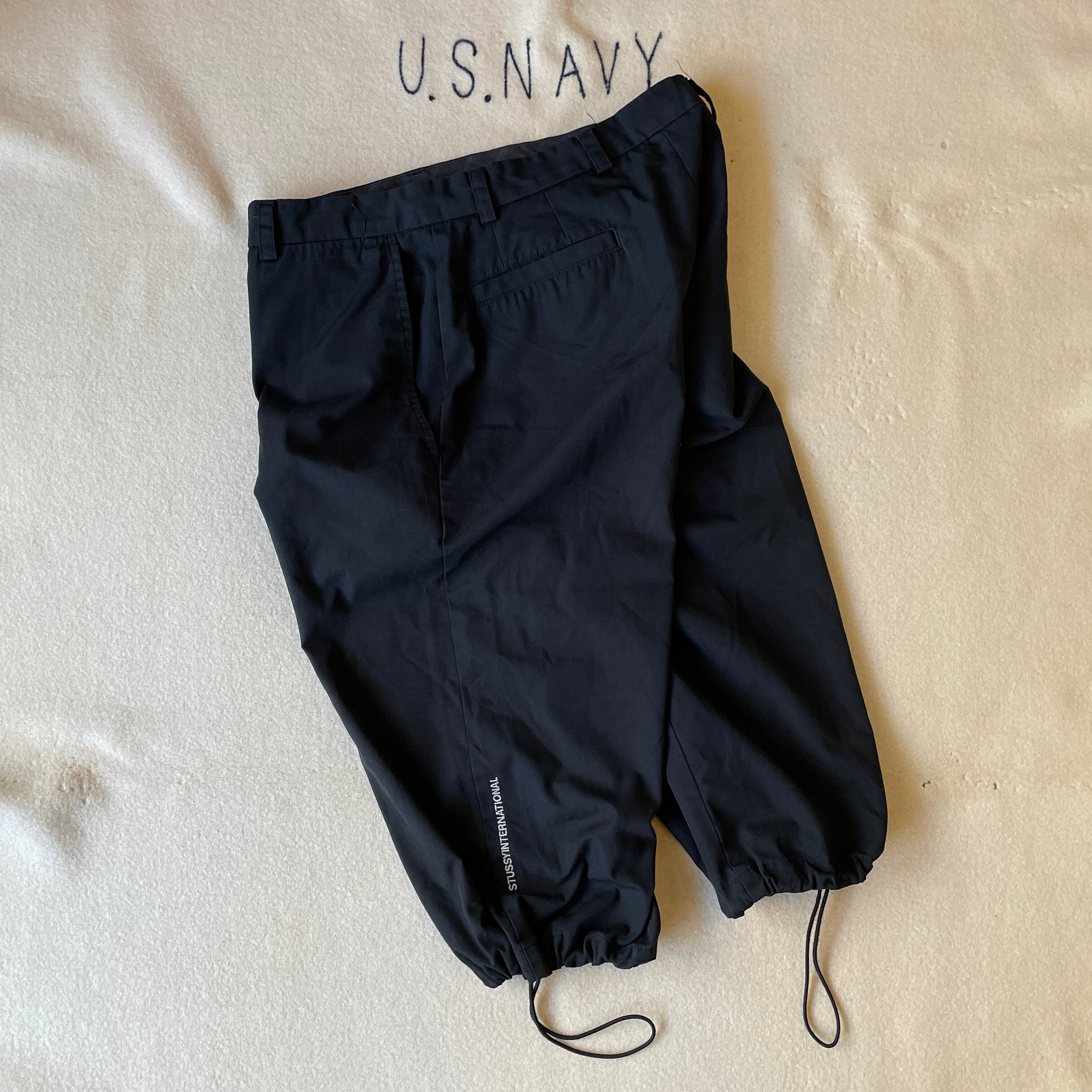 90s stussy internationalのショーツ。7分丈くらいのクロップドショーツ。裾口はゴムストラップで調整可能。長めのソックスとローテクスニーカーでどうでしょうか。