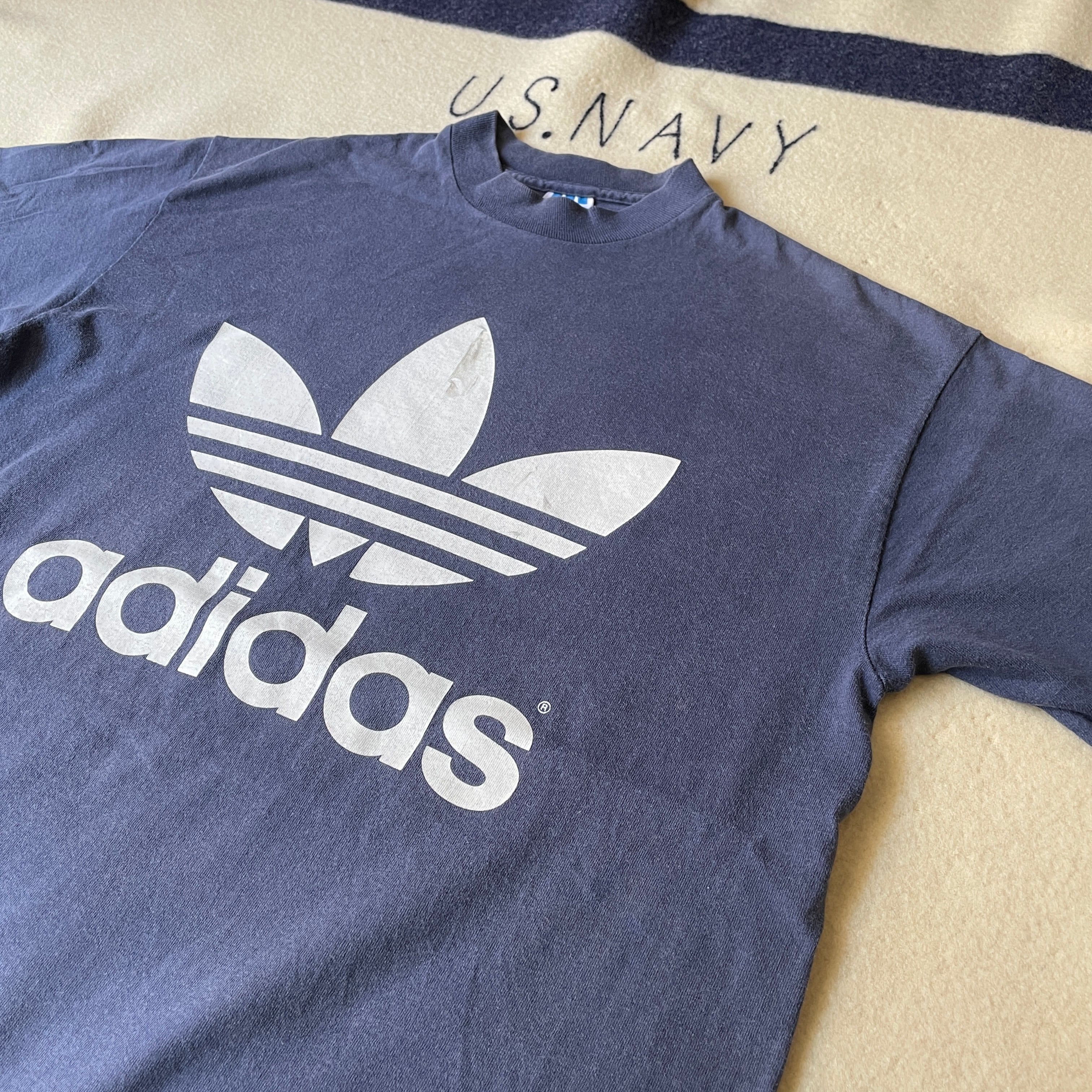 90s頃のadidas。定番のトレフォイルプリント。ヴィンテージ特有の使用感、プリントに若干の汚れありますが古着慣れされていれば問題無く着用可能と思います。