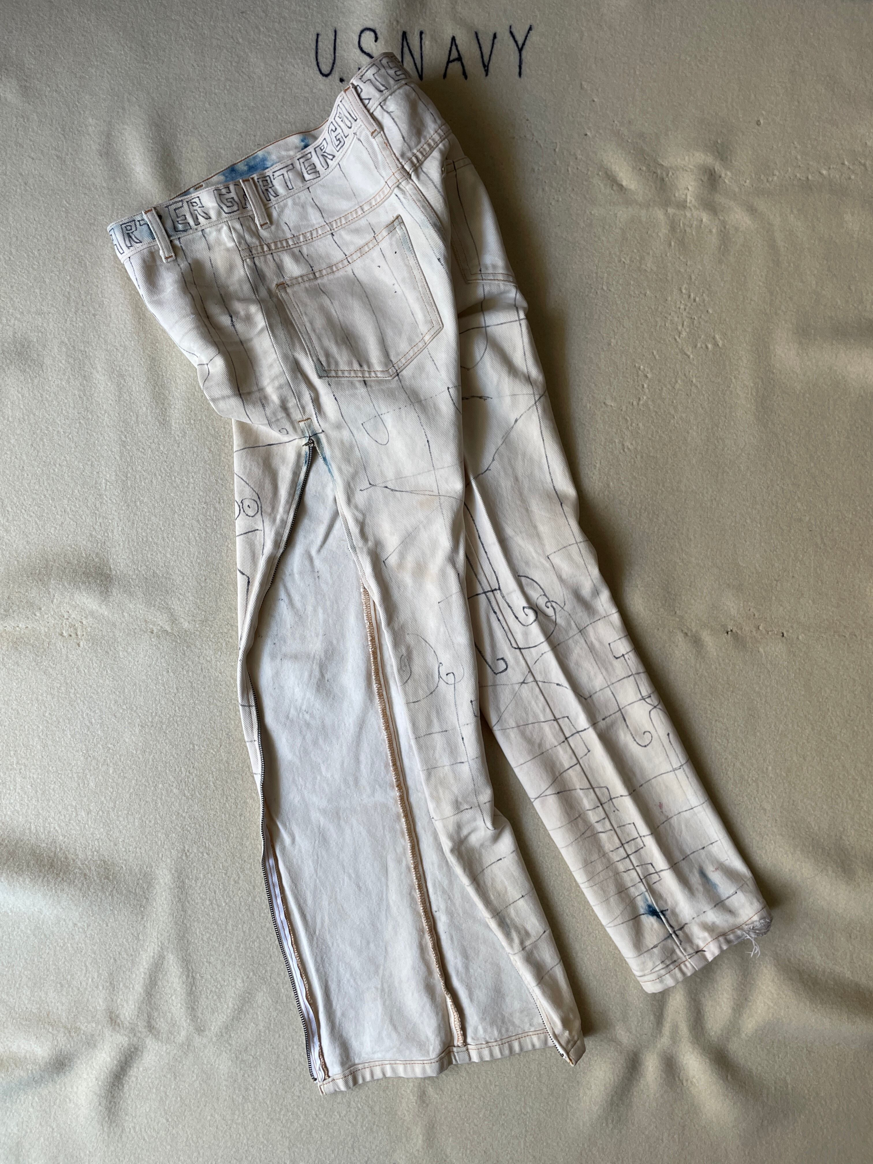 OLDのX-GIRL。デニムをブリーチした後手書きでペイントを施したデザイン。サイドについたジッパーは腿上までオープン可能です。