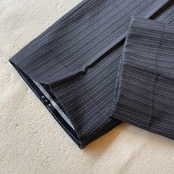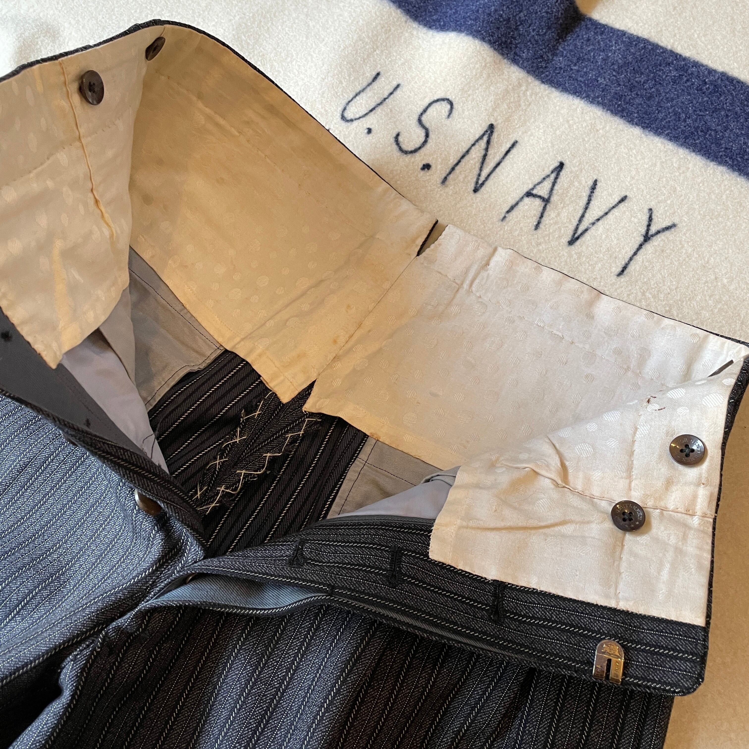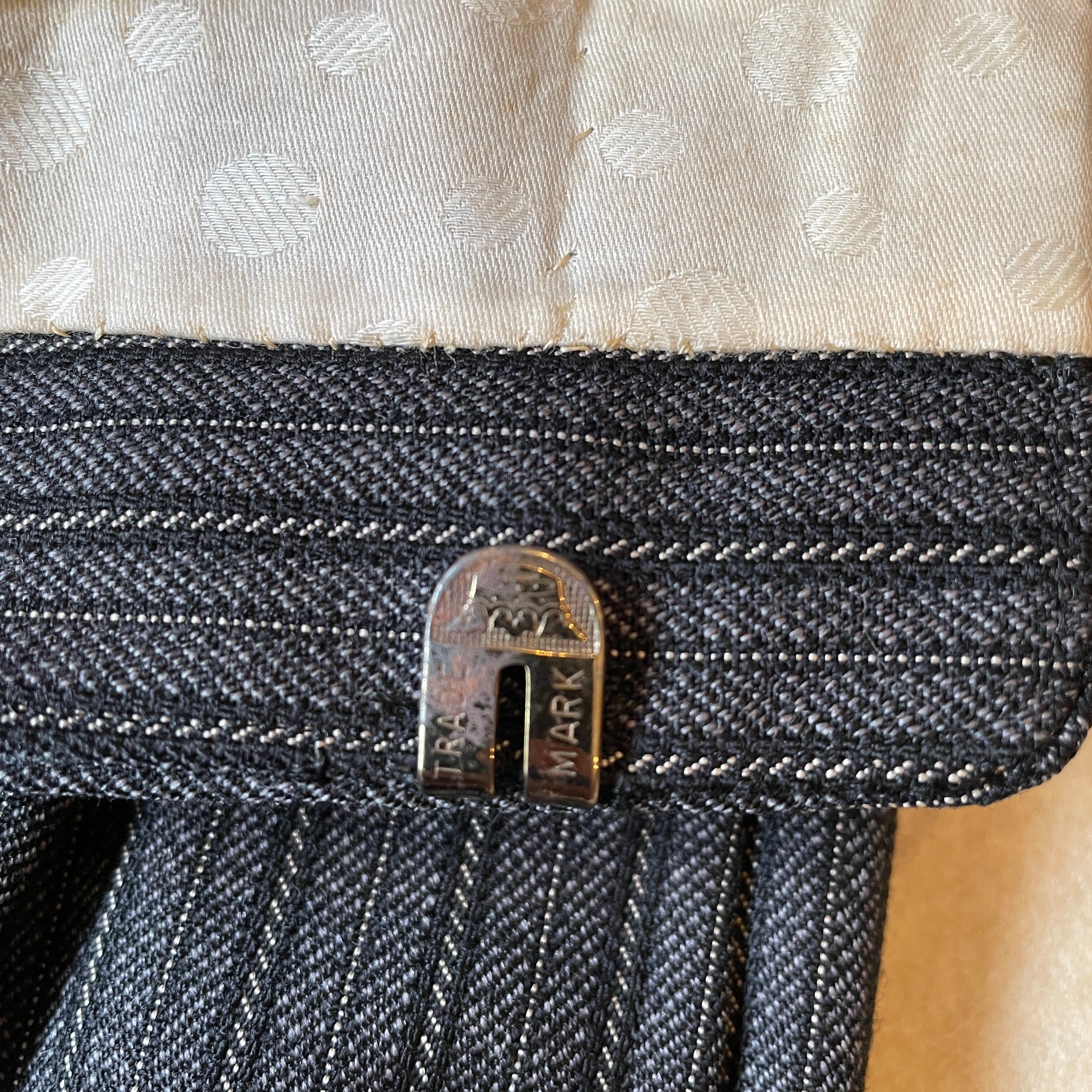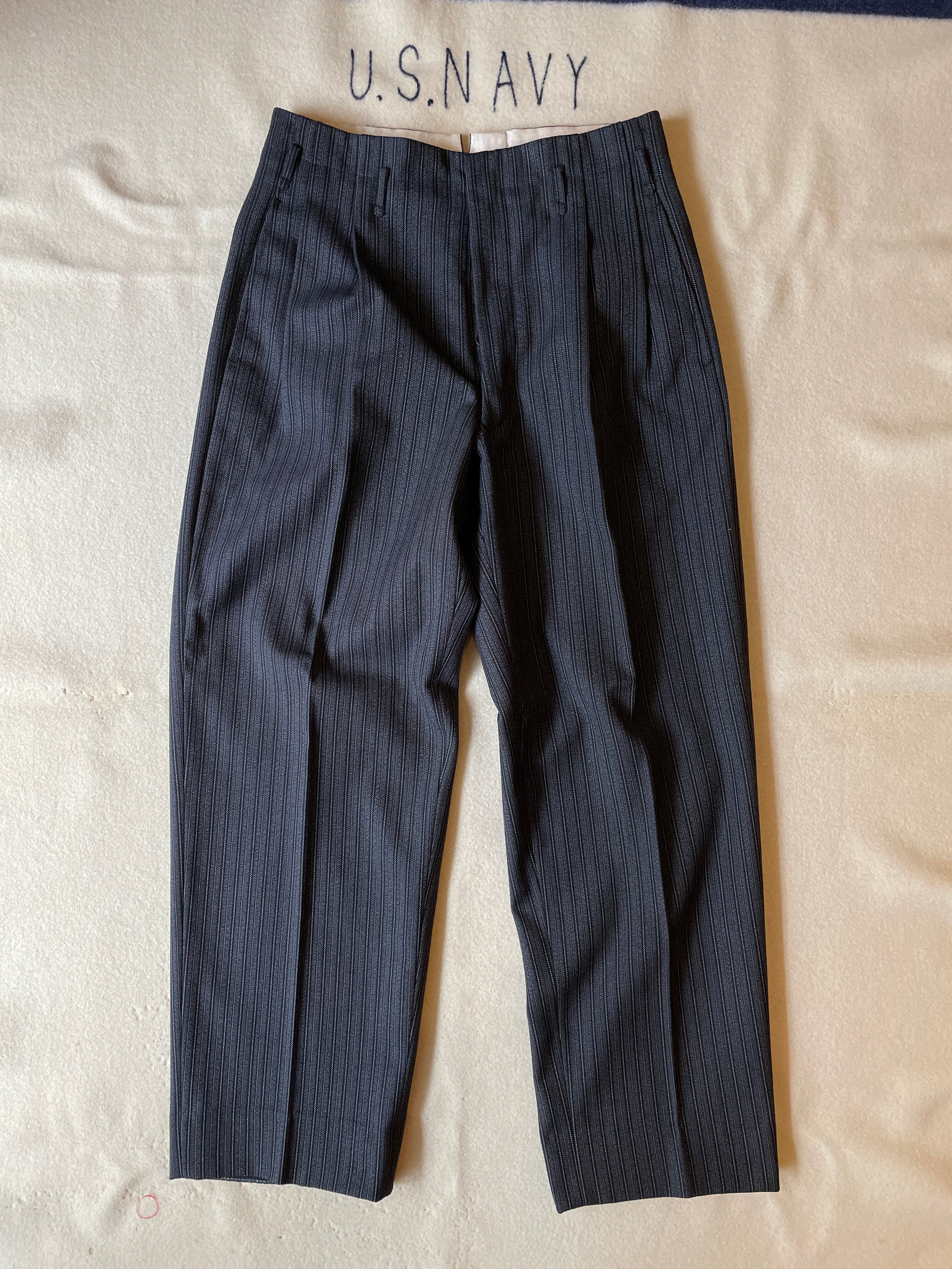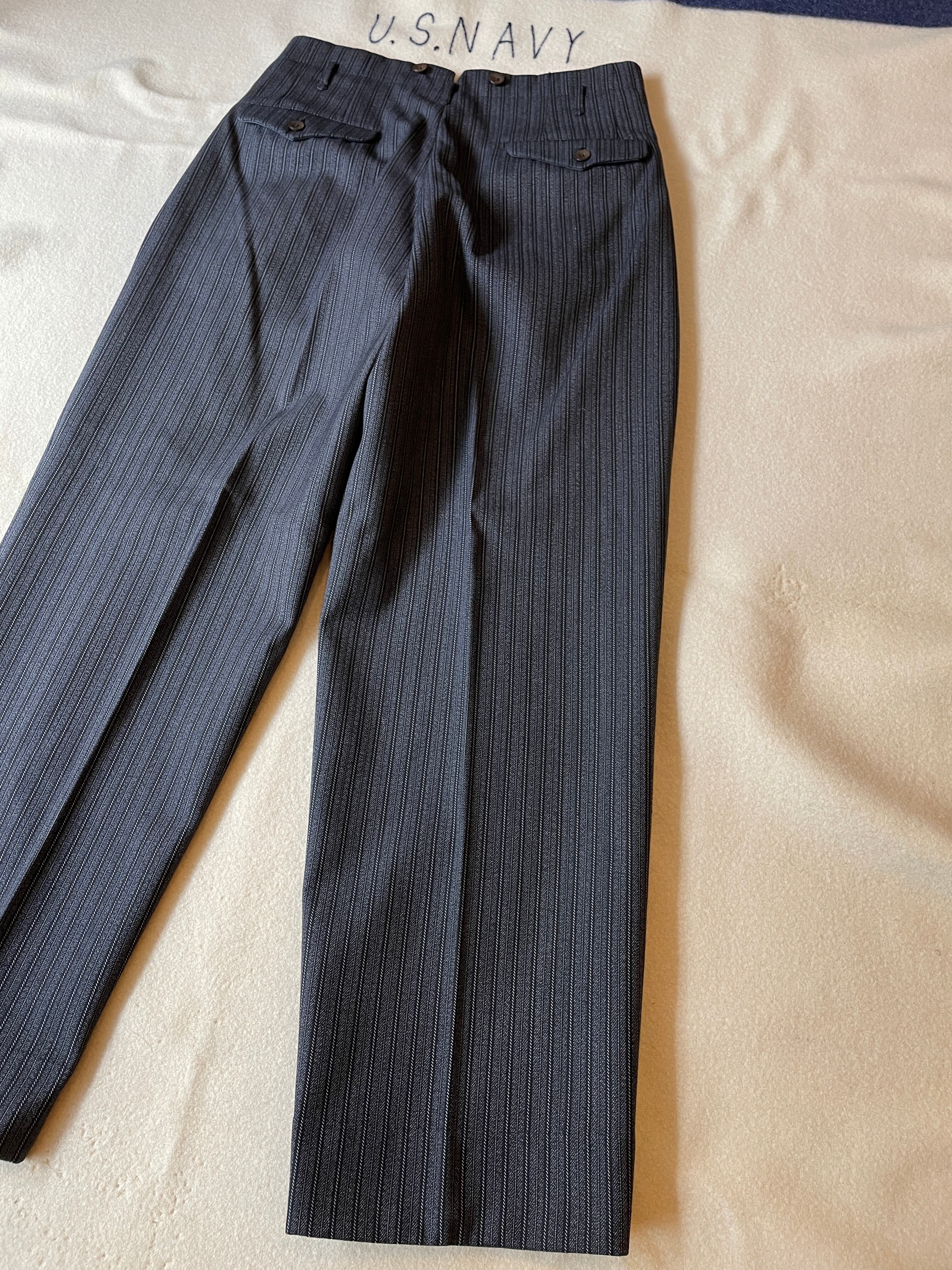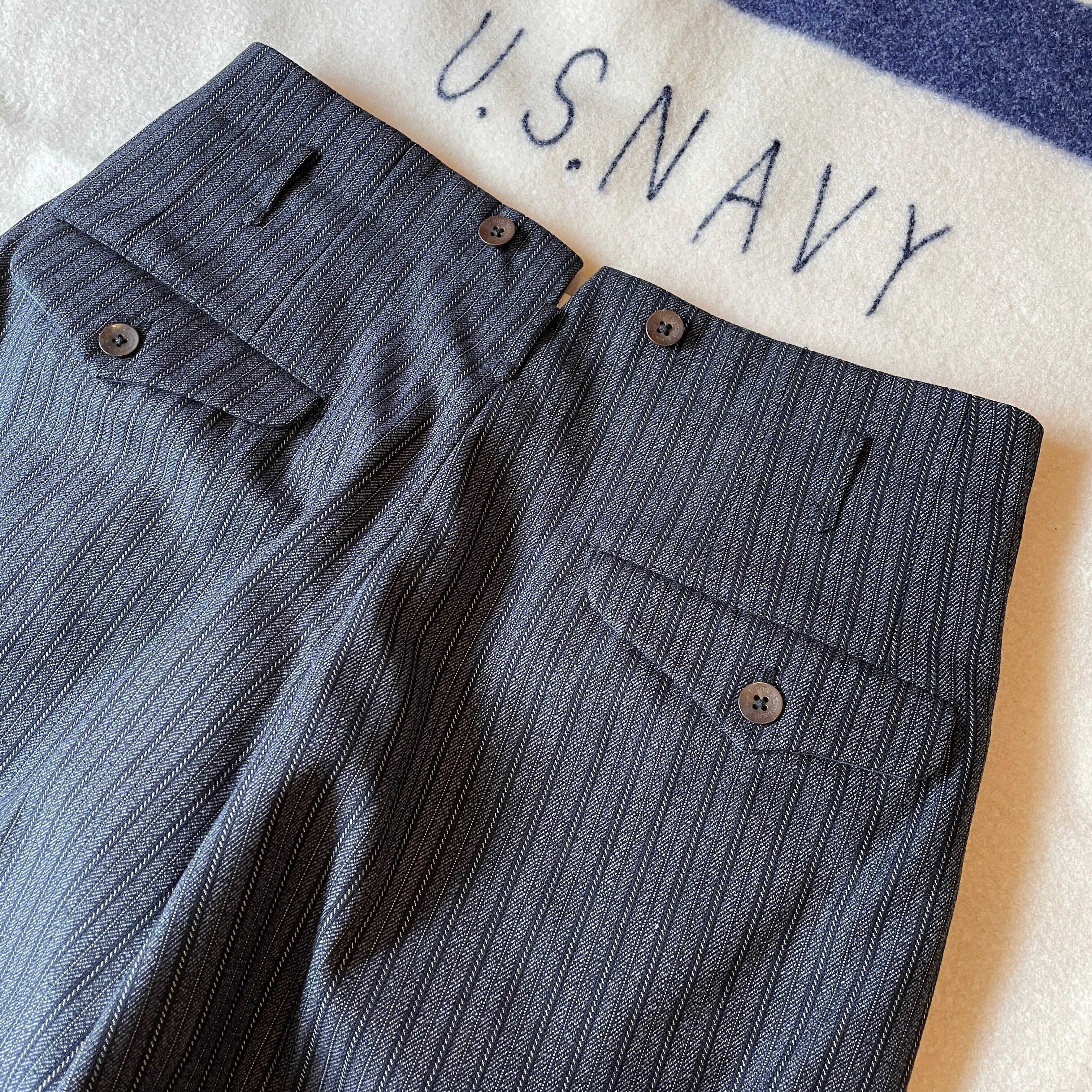 ウエストバックの割れやフロントポケットの位置、ベルトループなどアメリカ製のヴィンテージスラックスと似た作りです。綺麗なストライプパターンはフランスヴィンテージのスラックスにも通ずる部分があると思います。