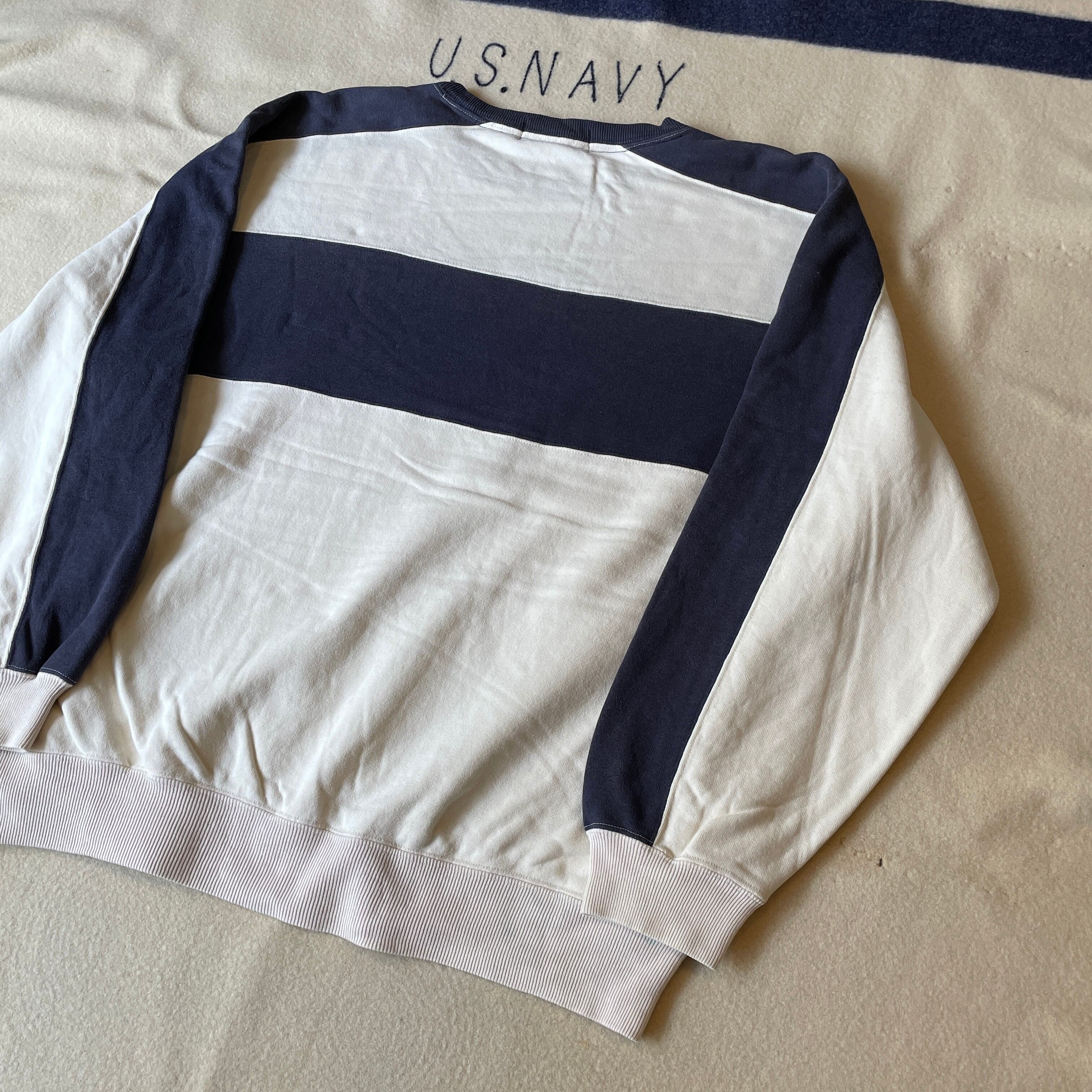 90s頃のPOLO SPORTS。ネイビーと生成りの2トーン。ストリート感強めの一着です。フロントと袖部に若干の汚れありますがあまり気になりません。主観ですが。古着慣れされていれば問題無く着用可能と思います。