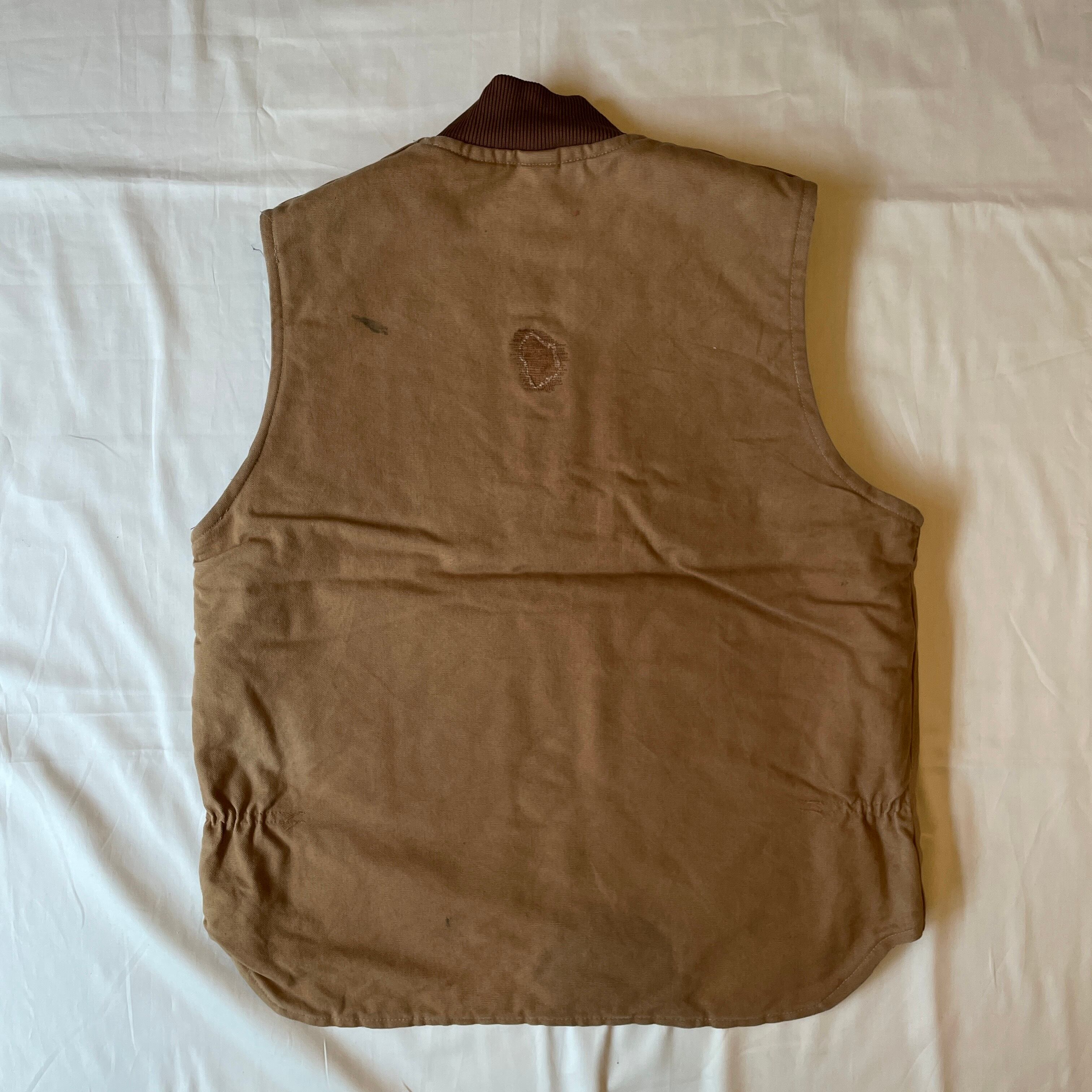 90s頃のcarhartt。定番ダック地のベストタイプ。インナーは中綿の入ったキルティング仕様。胸にロゴ入りで企業で作成されたものと思います。