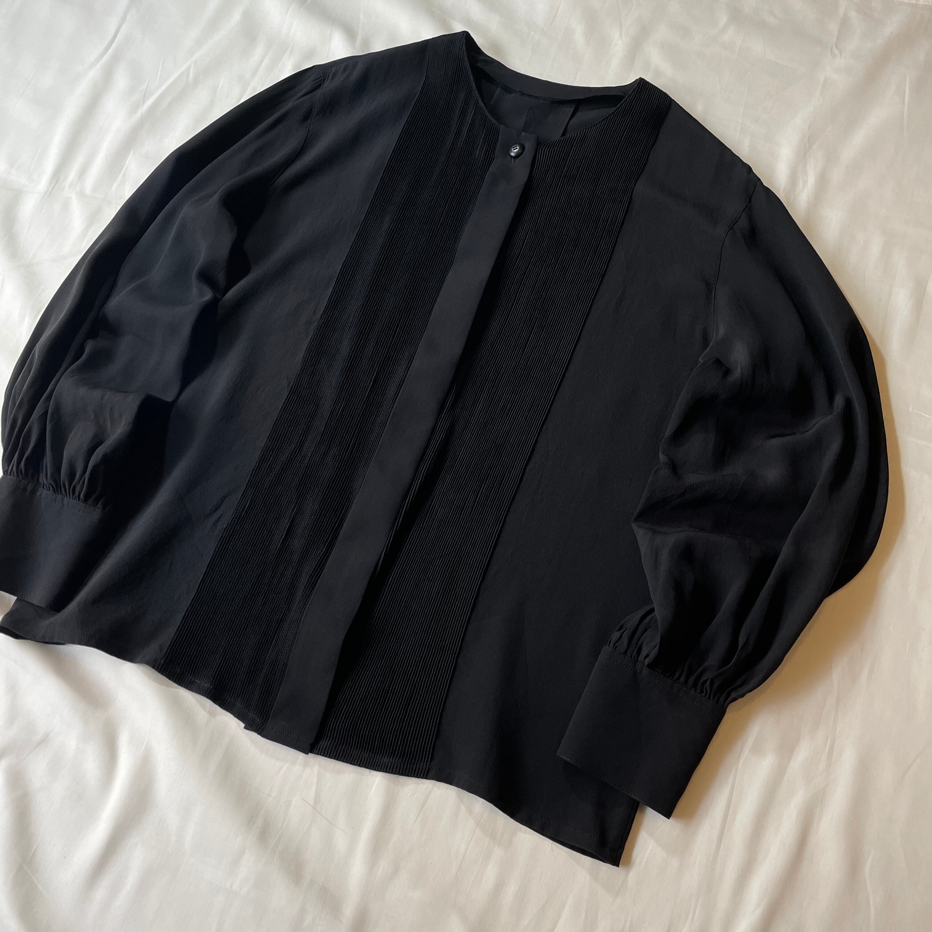 カラーはブラック。ざらっとしたシルクの肌触り。フロントのプリーツ、かわいいです。