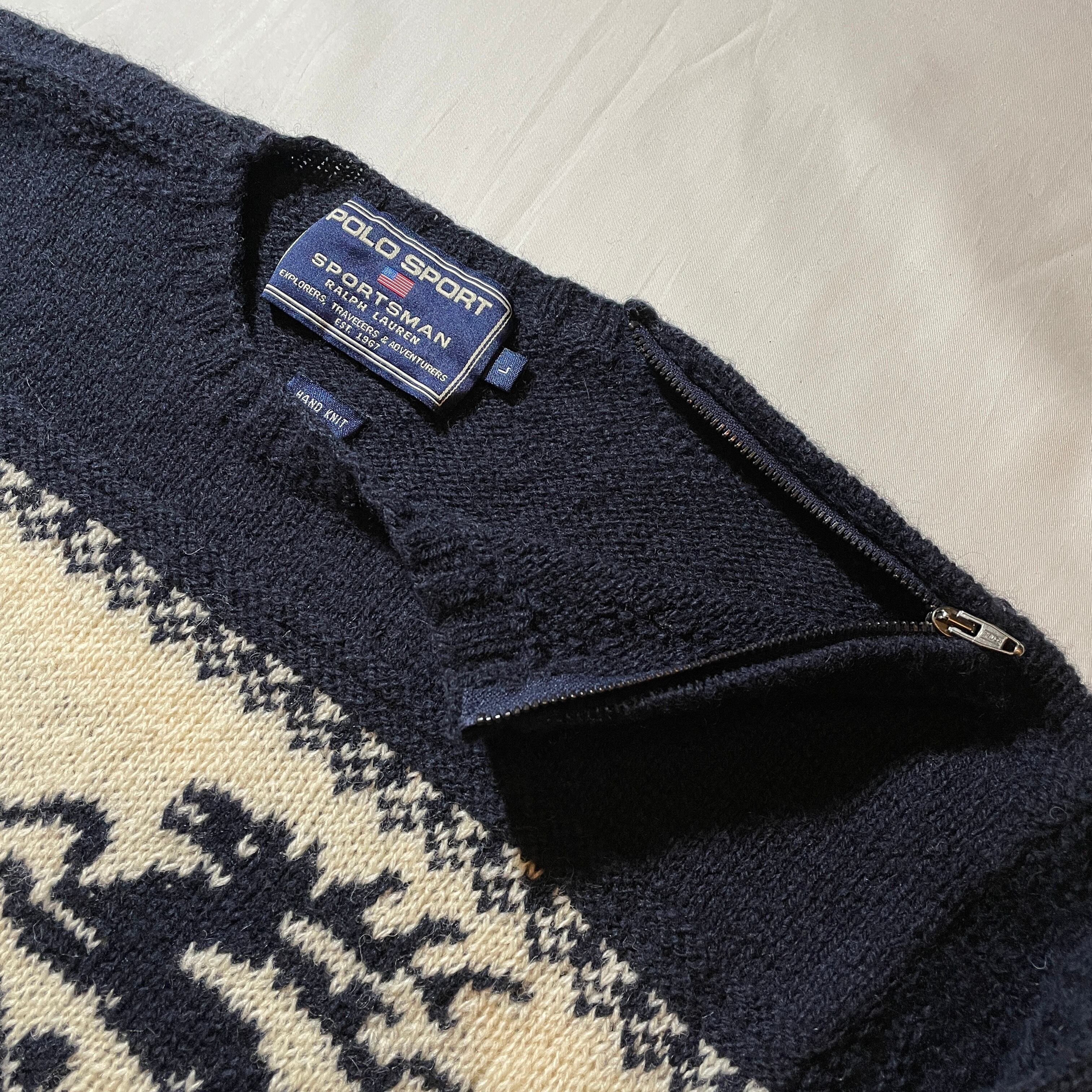 90s頃のPOLO SPORTS。ハンドニットのノルディックパターン。左肩から襟にかけてジップが入る珍しいデザイン。