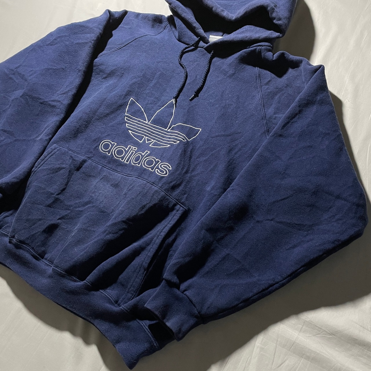 90s頃のadidas。フロントに刺繍のトレフォィルが入る定番モデル。XL相当のビッグサイズ。カラーはネイビー。