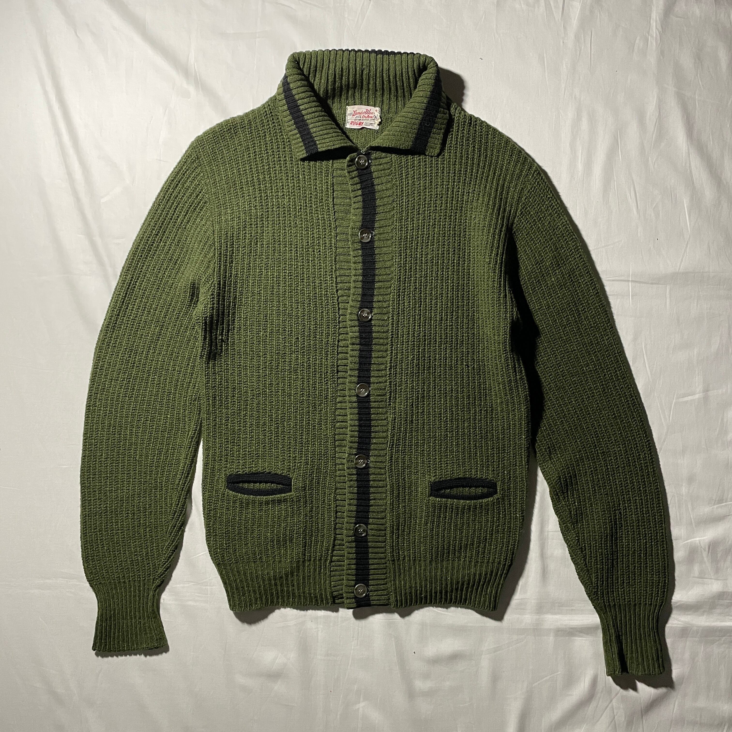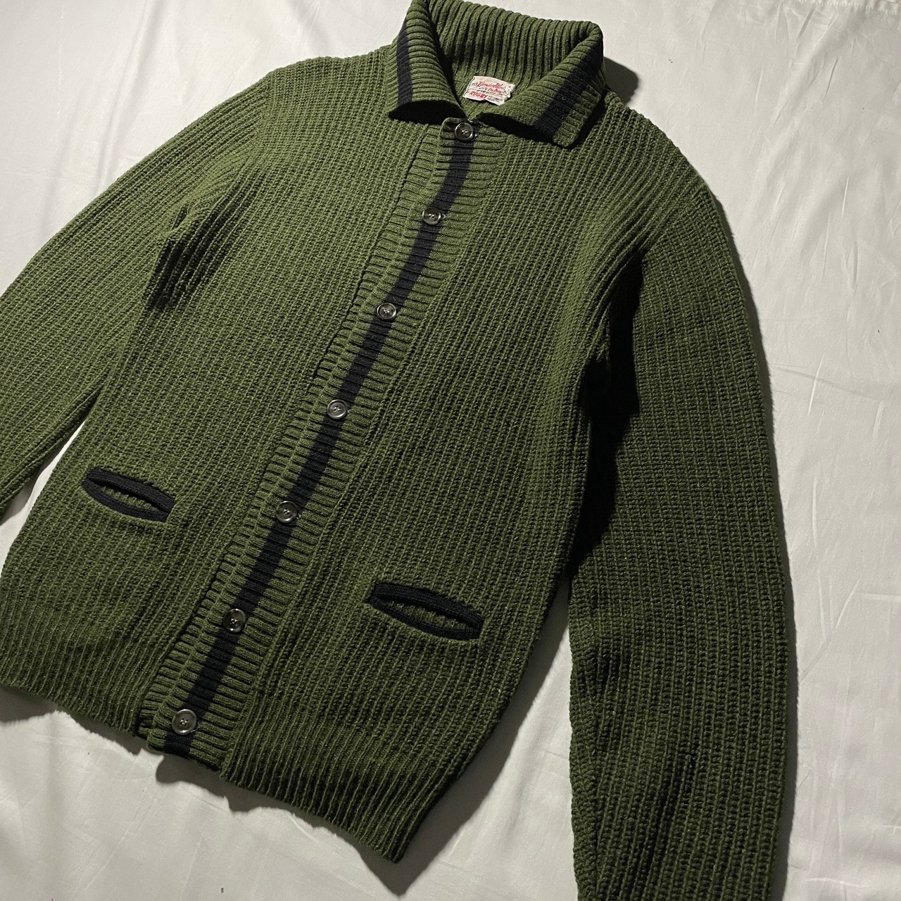 60s後期-70sあたりのRUGBY knitting Millsのカーディガン。モスグリーンベースにブラックのパイピングが○。ヴィンテージらしいカラーリングです。
