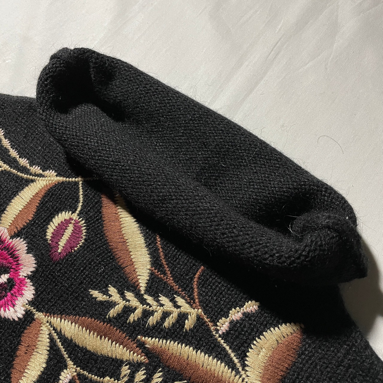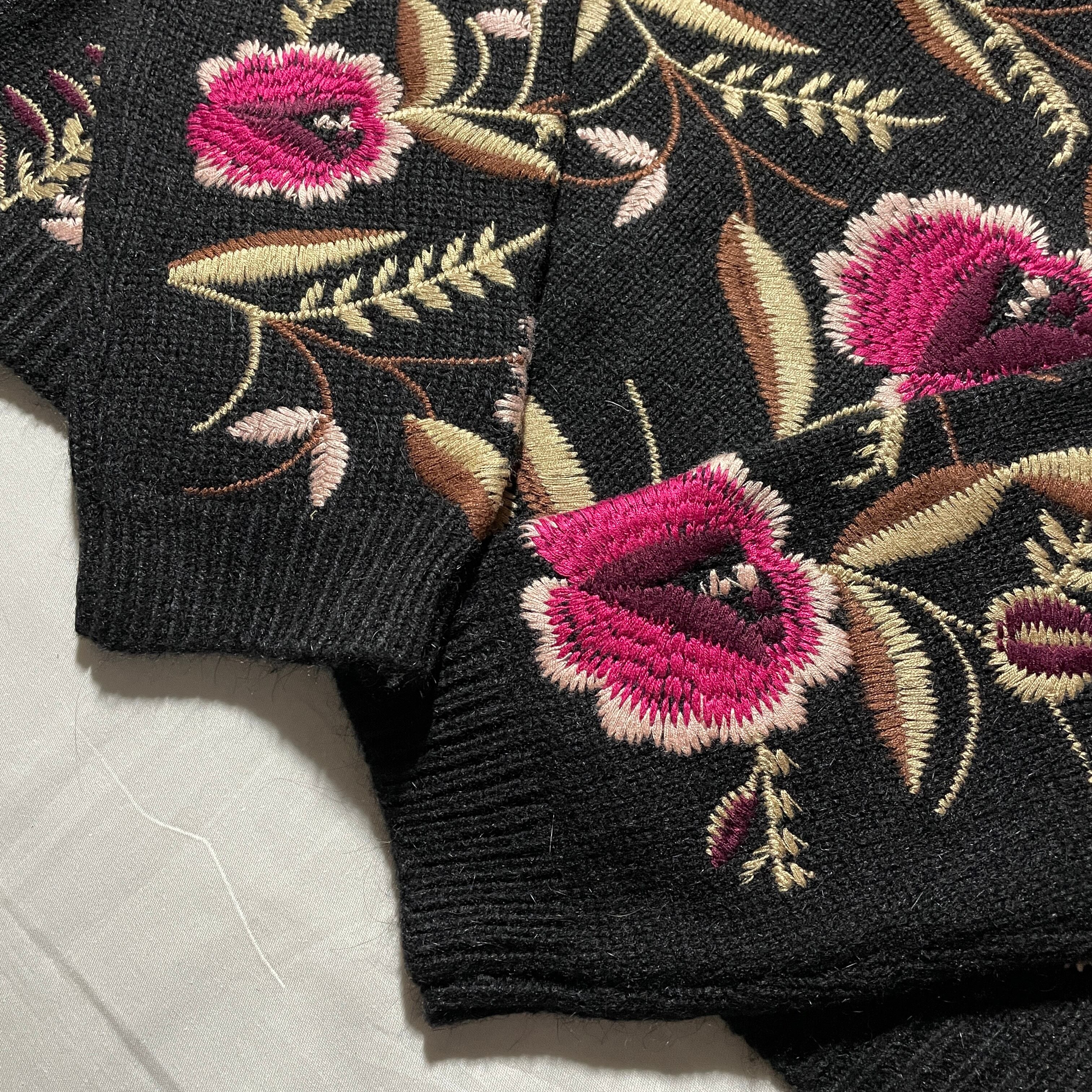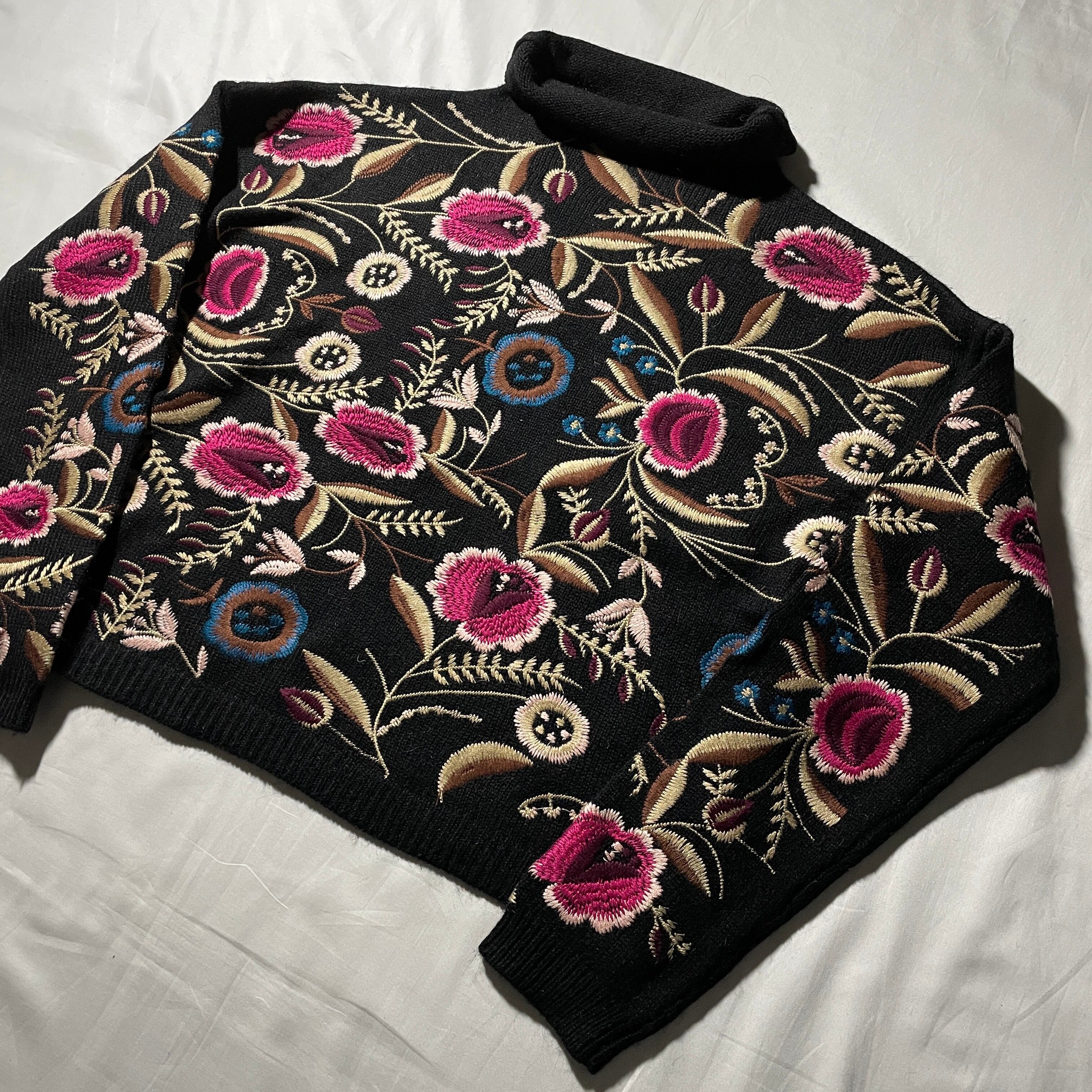 ブラック貴重のハイネックセーターに花の刺繍が入るかわいい一着。普通のセーターより丈が短く幅を広くとって作られてます。下に大きめのシャツやカットソーをレイヤーしてもかわいいと思います。