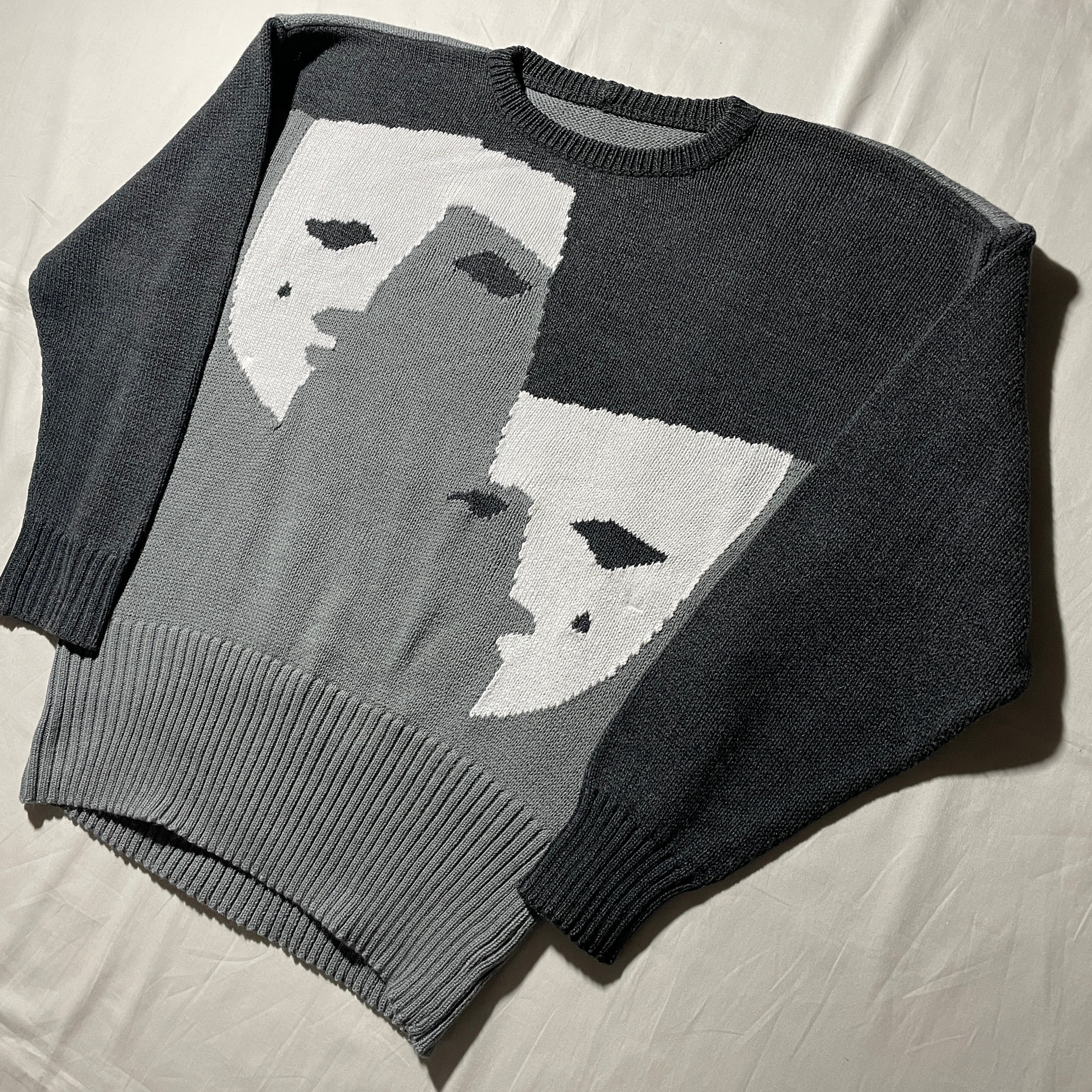 80s-90s頃のヴィンテージコットンセーター。知ってる人は知っているMotley CrueのTheater of Painのジャケットの泣き笑い仮面的デザイン。