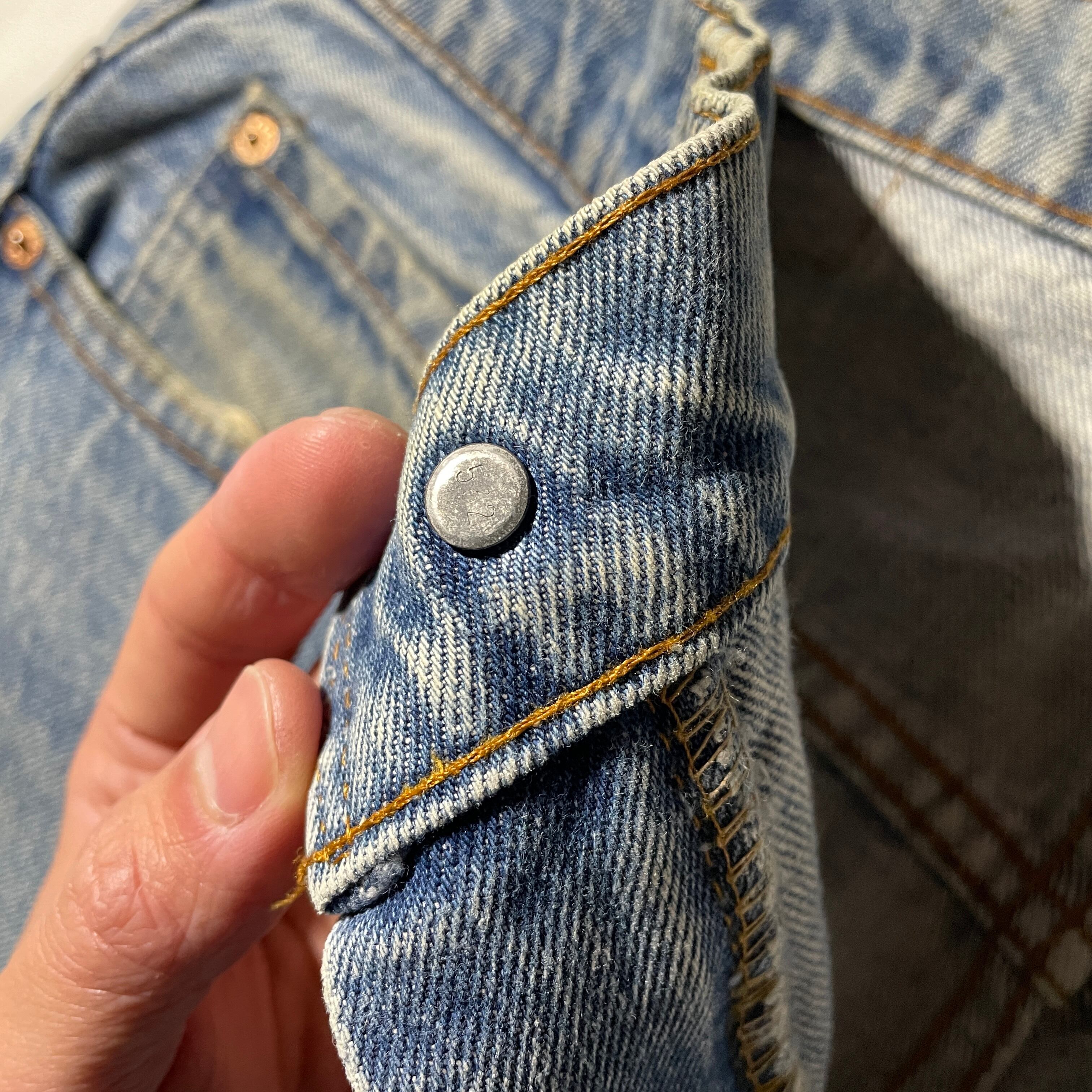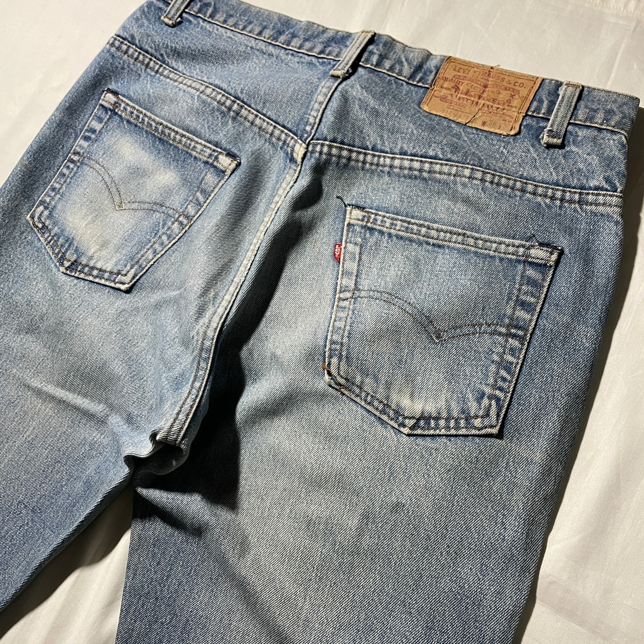 80s頃のインシームがシングルステッチのいわゆる内股シングルモデル。バックポケットは黒カンヌキ。ここまできて何故かジップはLevi’sジップという逆に珍しい一着です。