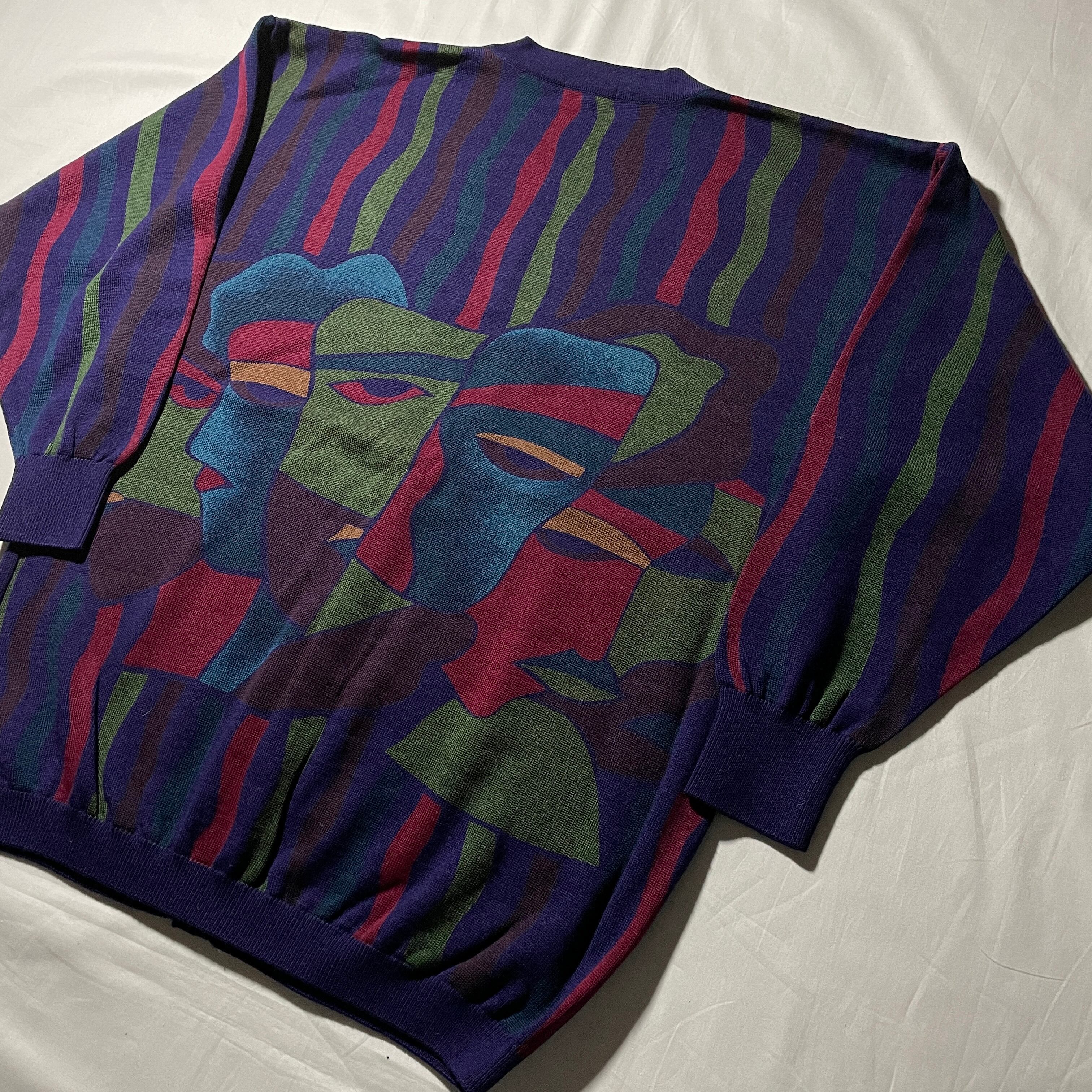 80s頃のヴィンテージカーディガン。KANSAIやKENZOライクな当時のドメブラらしいデザインかと思います。バックの顔は狂気ですね、、PINK FLOYDのジャケットっぽいです。