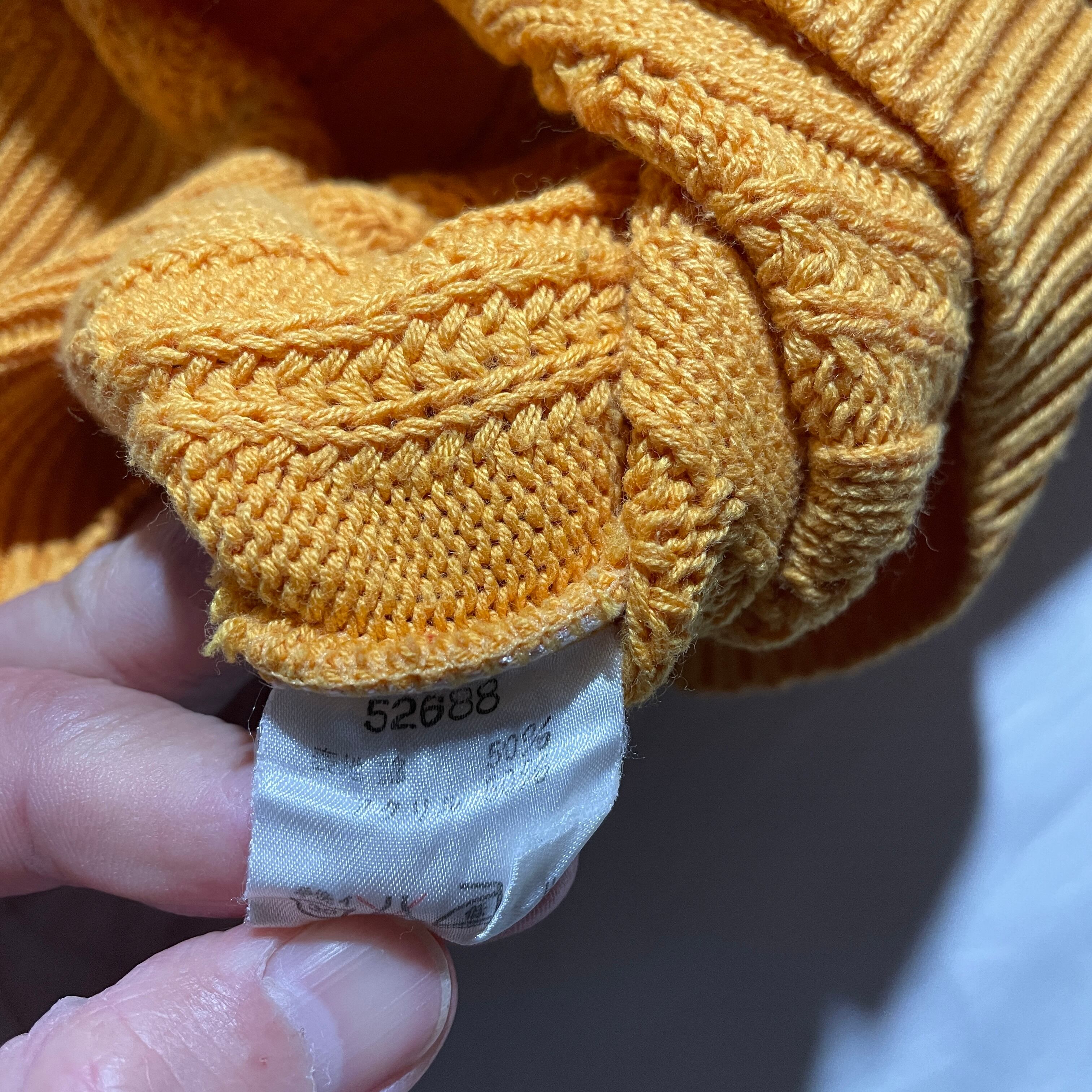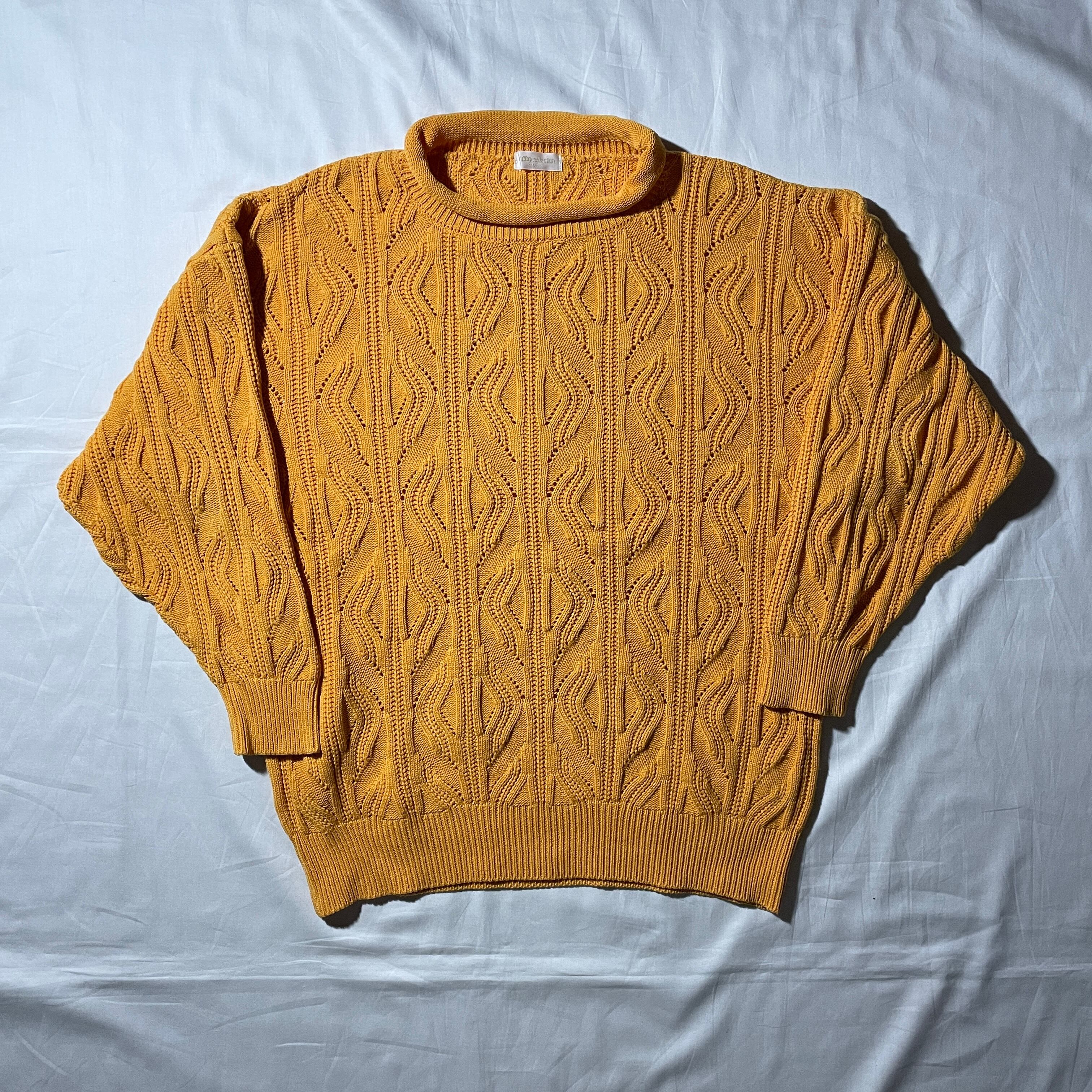 カラーはマスタードイエロー。コットン×アクリルで洗濯も容易です。汚れや破れ無く年代を考慮しても状態良好です。