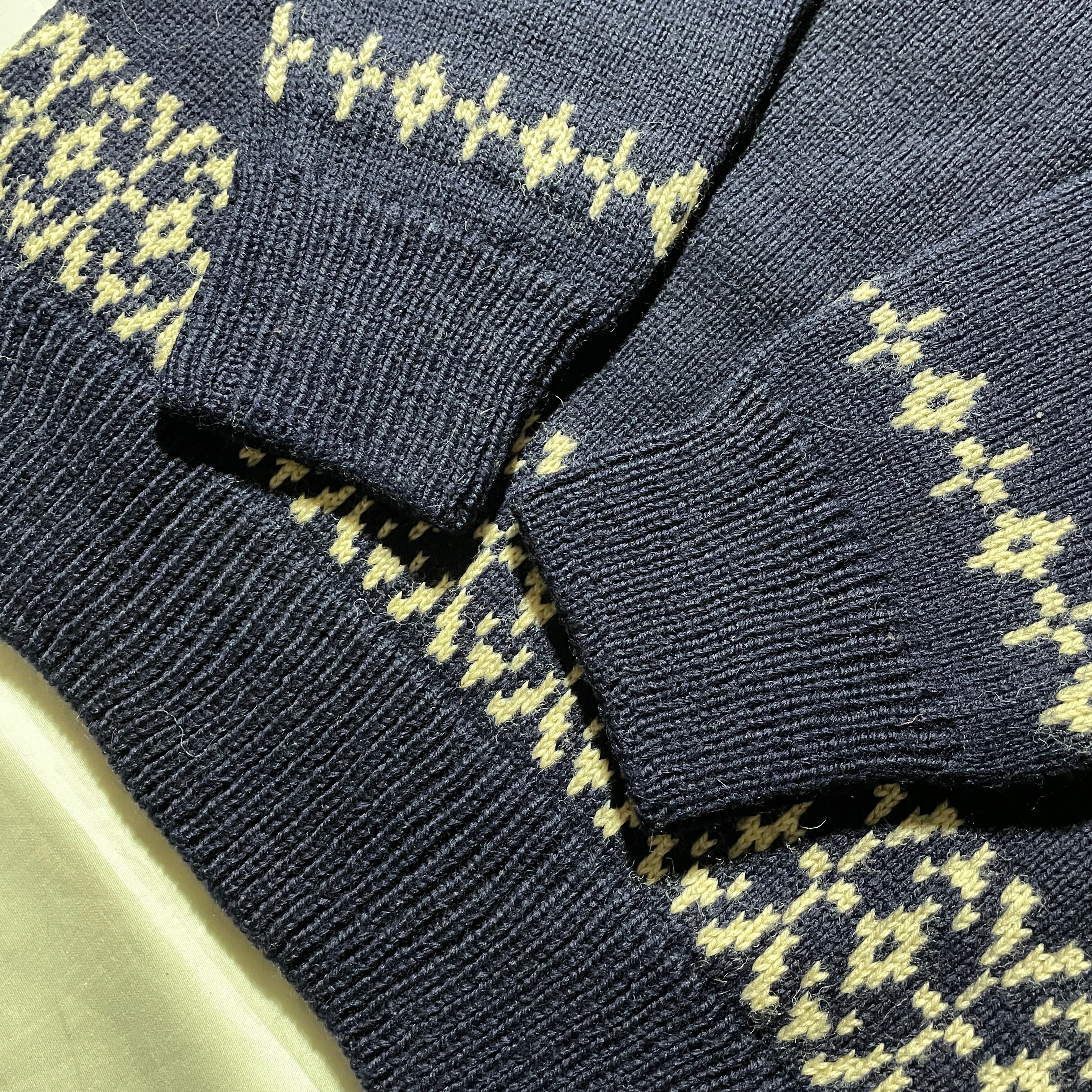 原産国不明、生地の感じやスタイルから80s頃のヴィンテージノルディックセーター。肉厚のウールを使用しており100%で間違いないと思います。