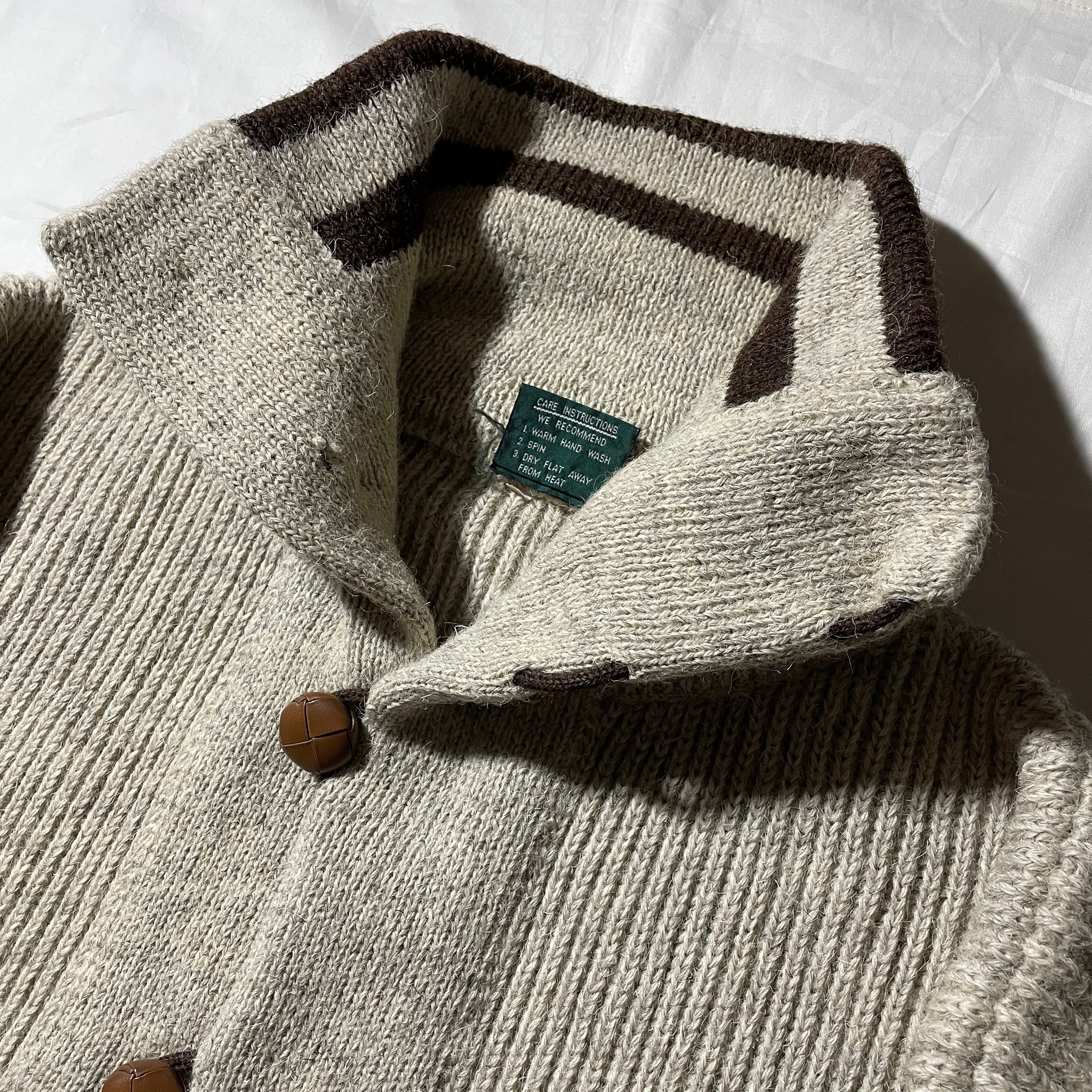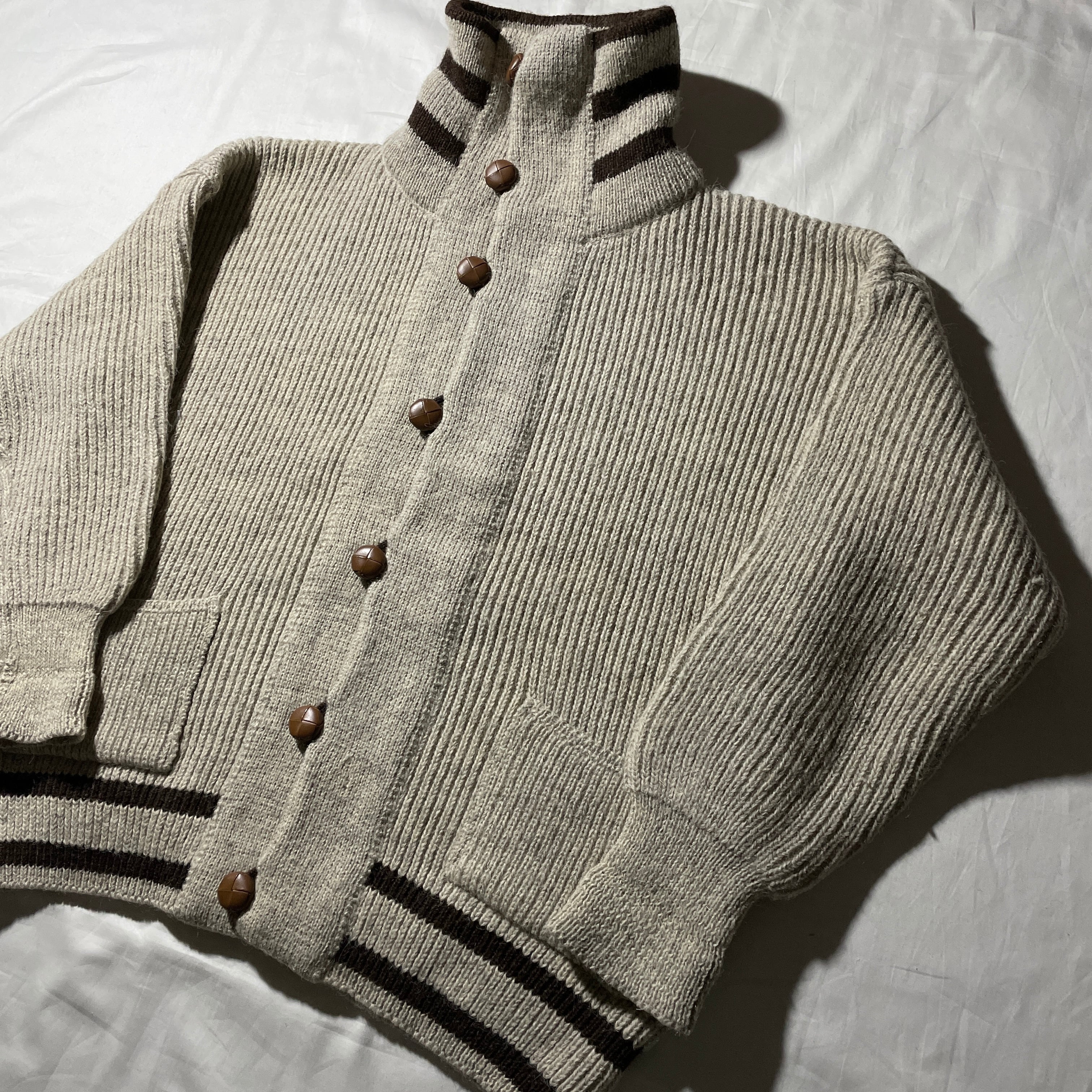 こちらは90s-00s頃の肉厚ウールを使用したカーディガンタイプ。上までボタンを留めればハイネックで着用できます。くるみのボタンを見てもクオリティの高さが伺えるかと思います。