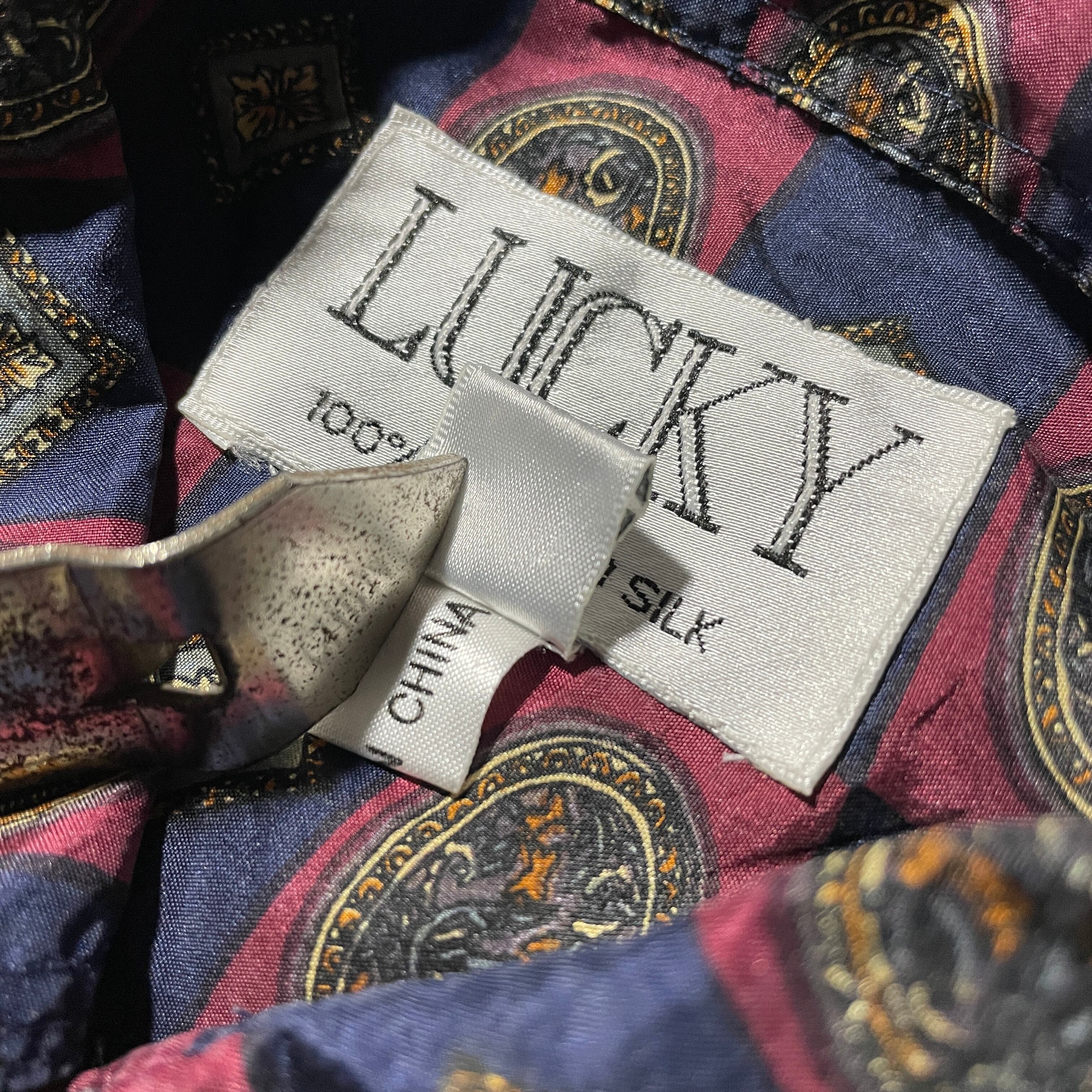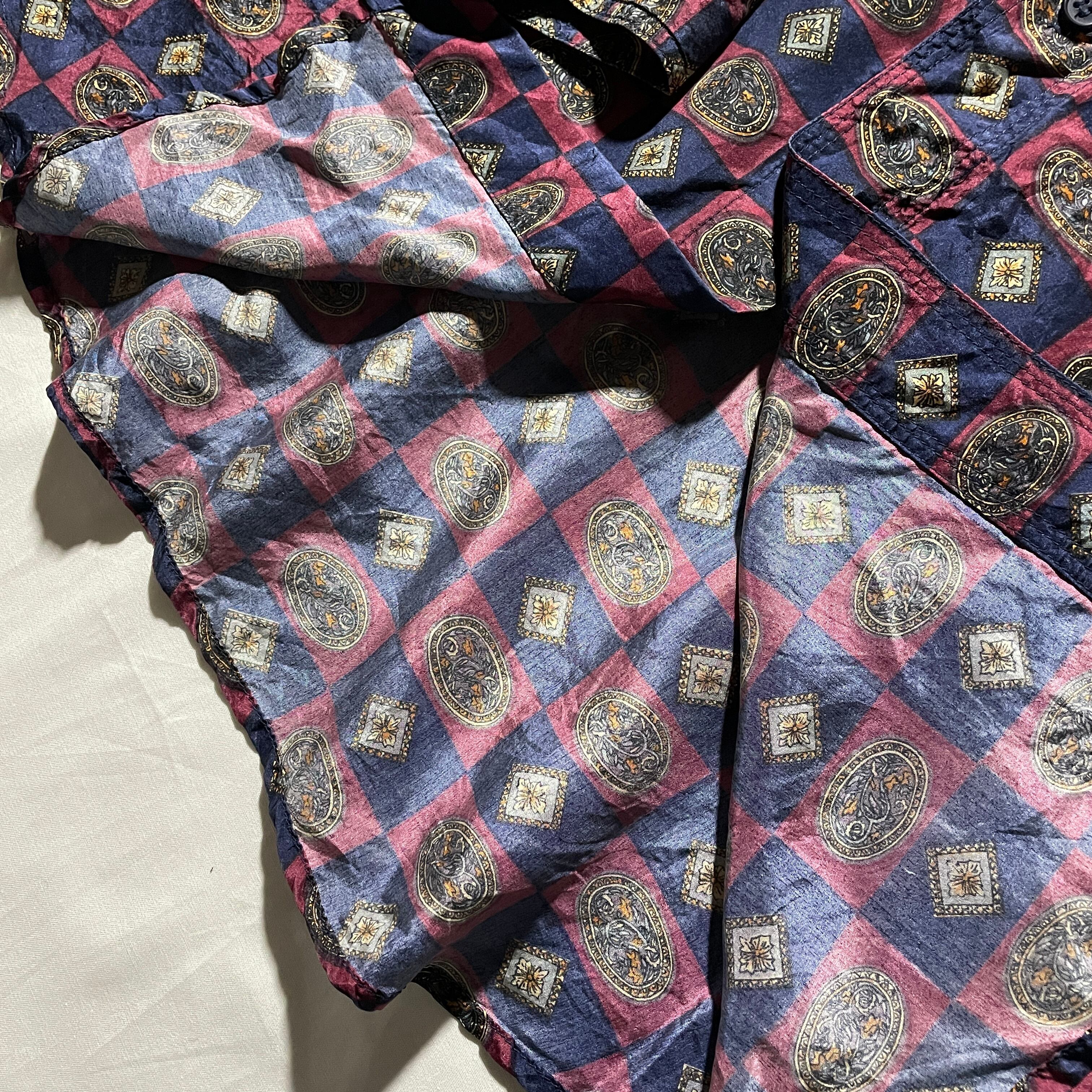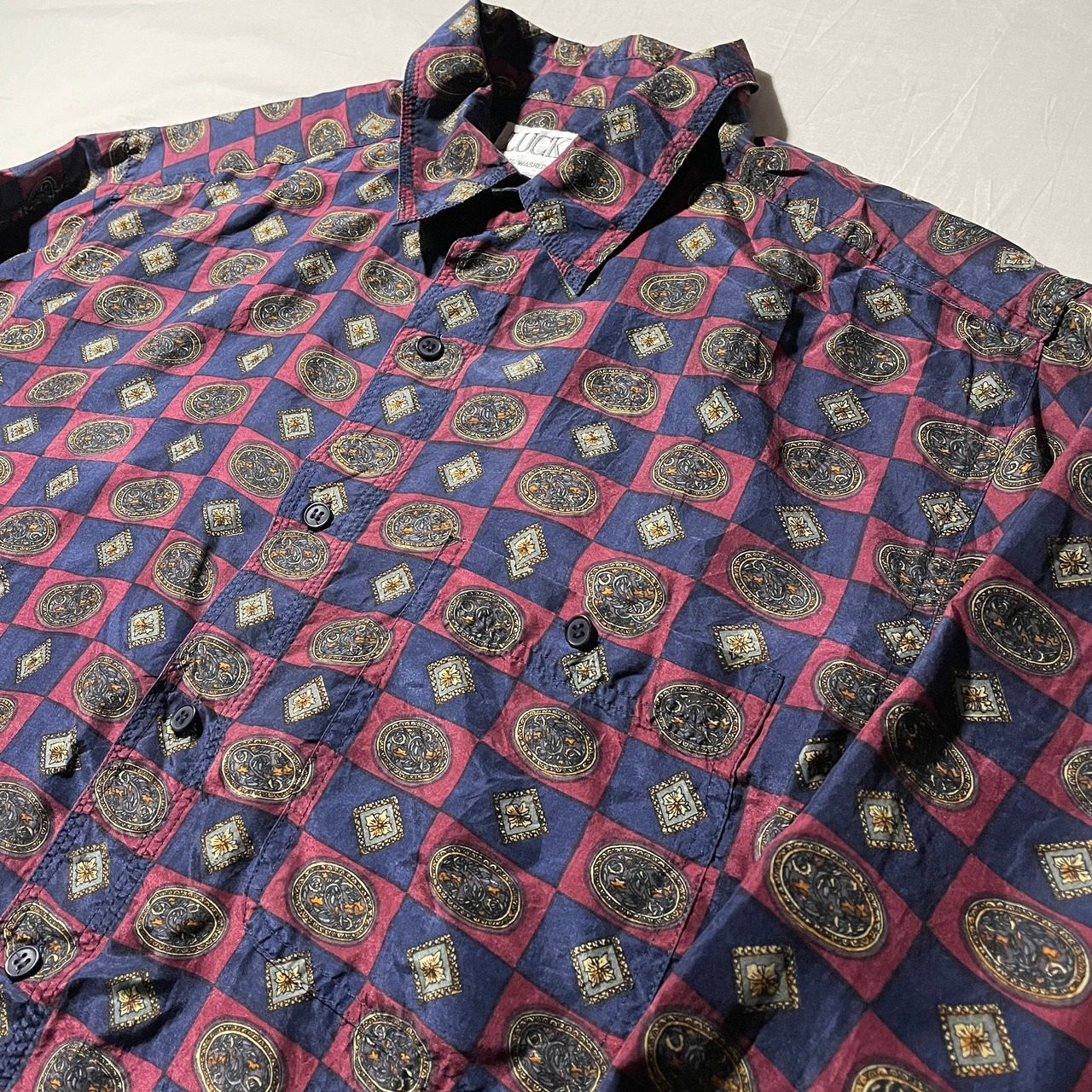 90s頃のヴィンテージシルクシャツ。良い総柄です。M表記ですがXL相当のビッグサイズ。シルクですが洗えます。