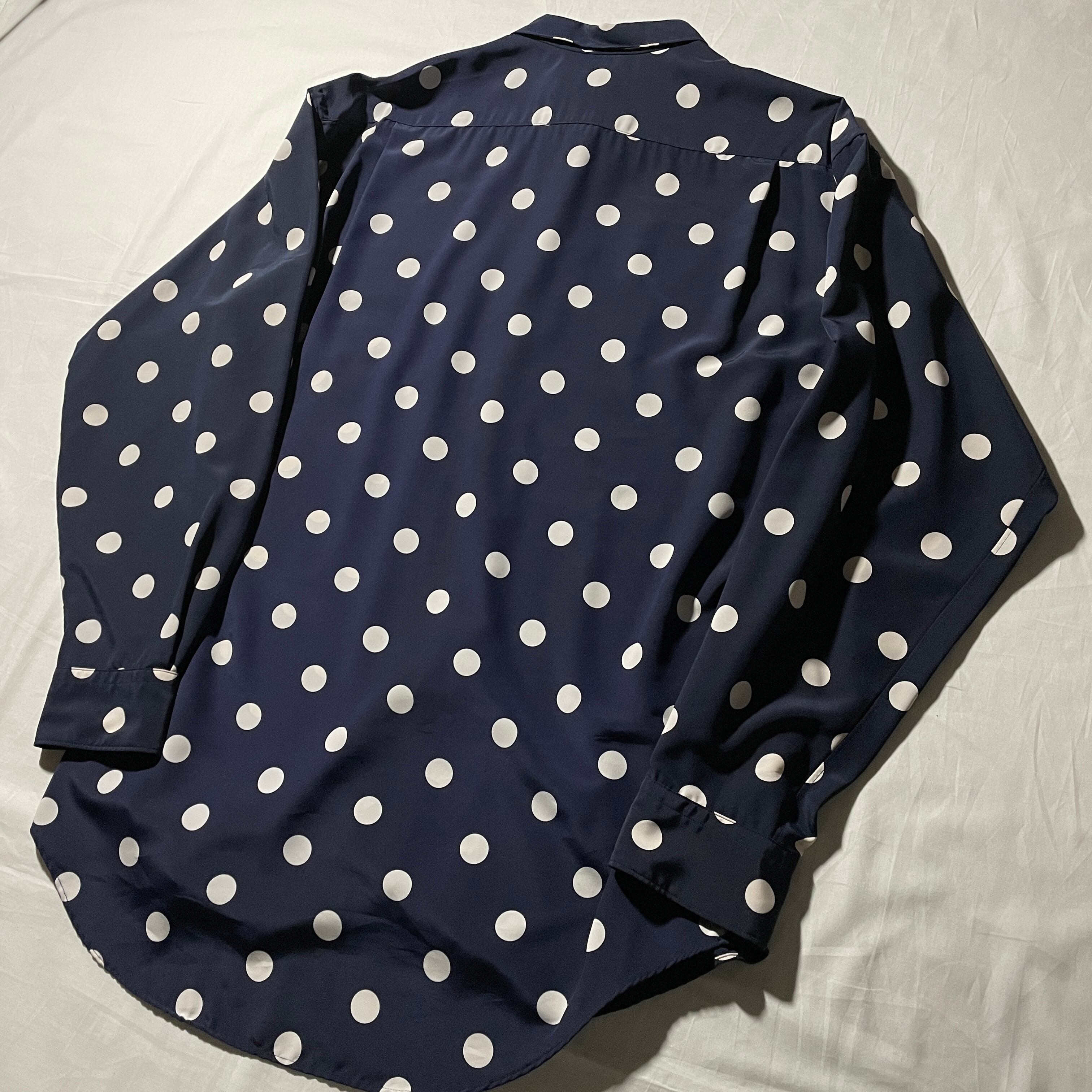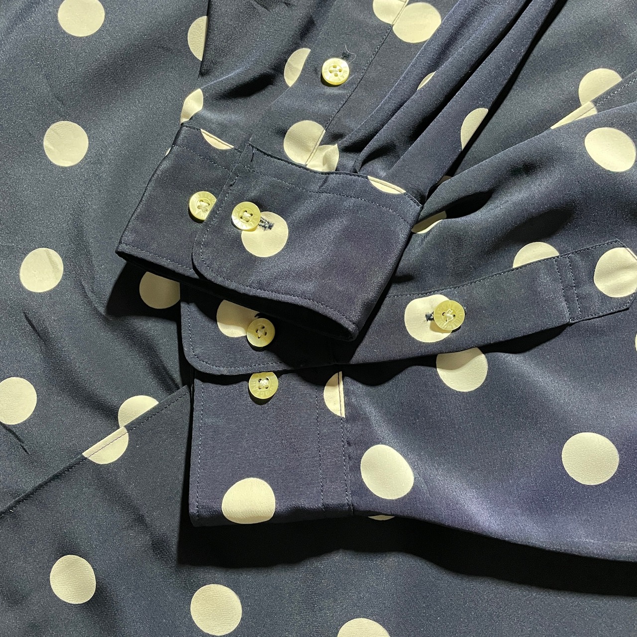 80s-90s頃の国産ヴィンテージ。レーヨンのようなテロっとした肌触りのポリシャツ。この年代で水玉の総柄は珍しいと思います。