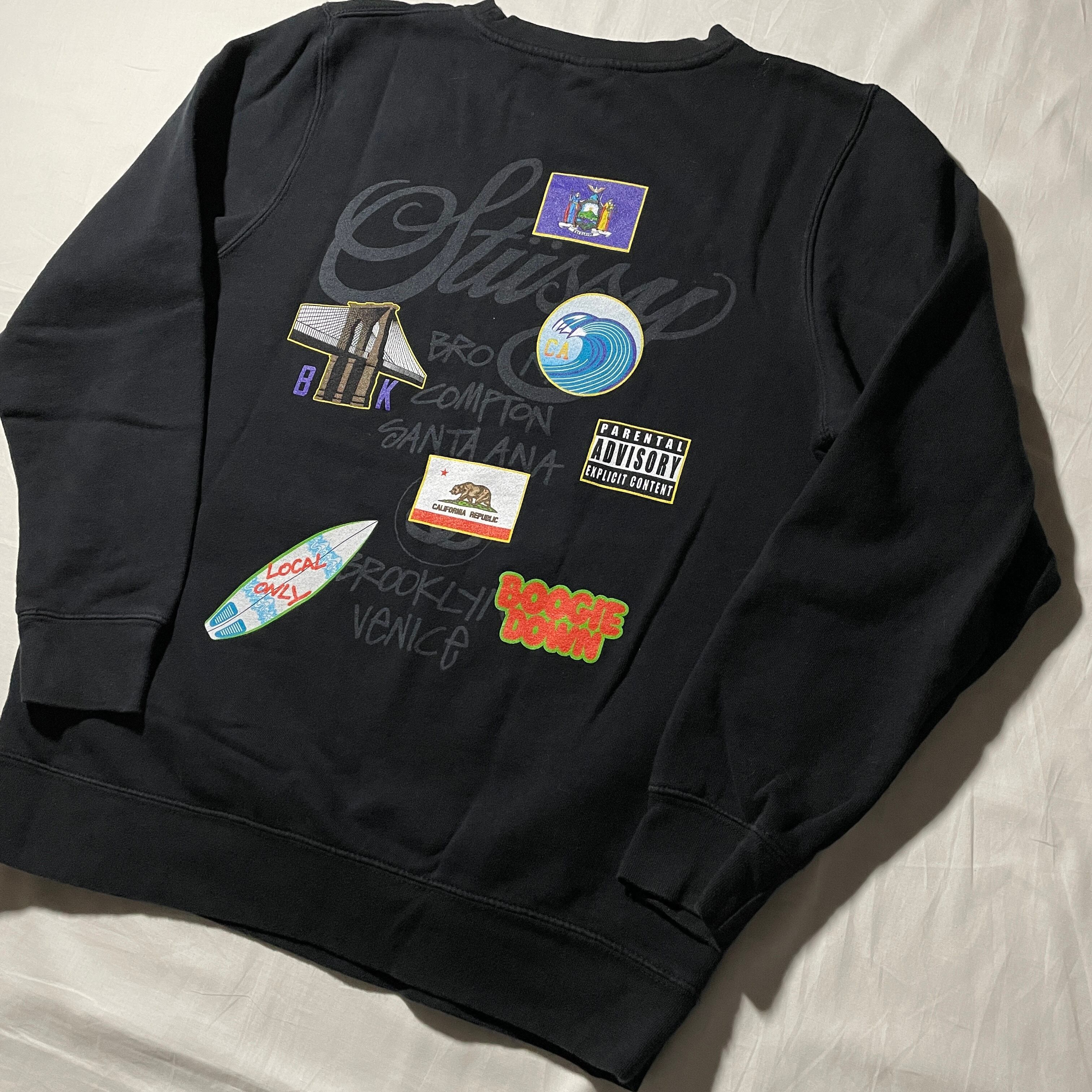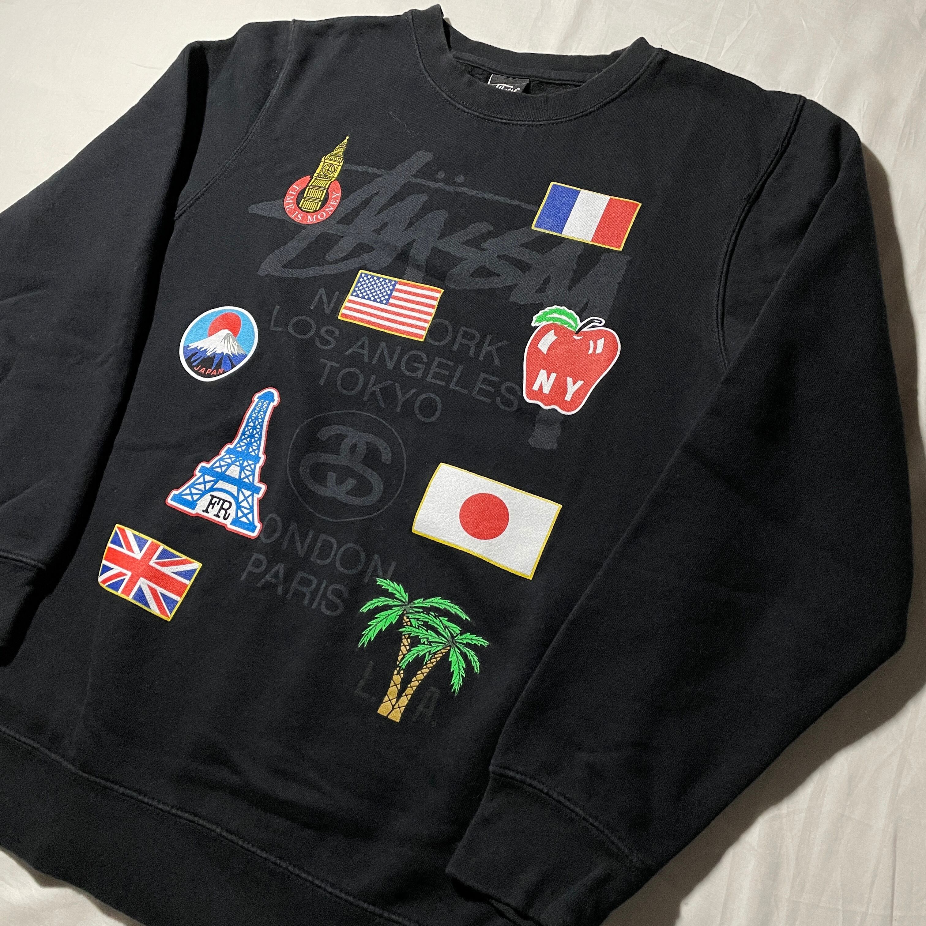 00s以降のOLD stussy。stussy定番のワールドツアープリントにステッカーを貼り付けたようなgood デザイン。