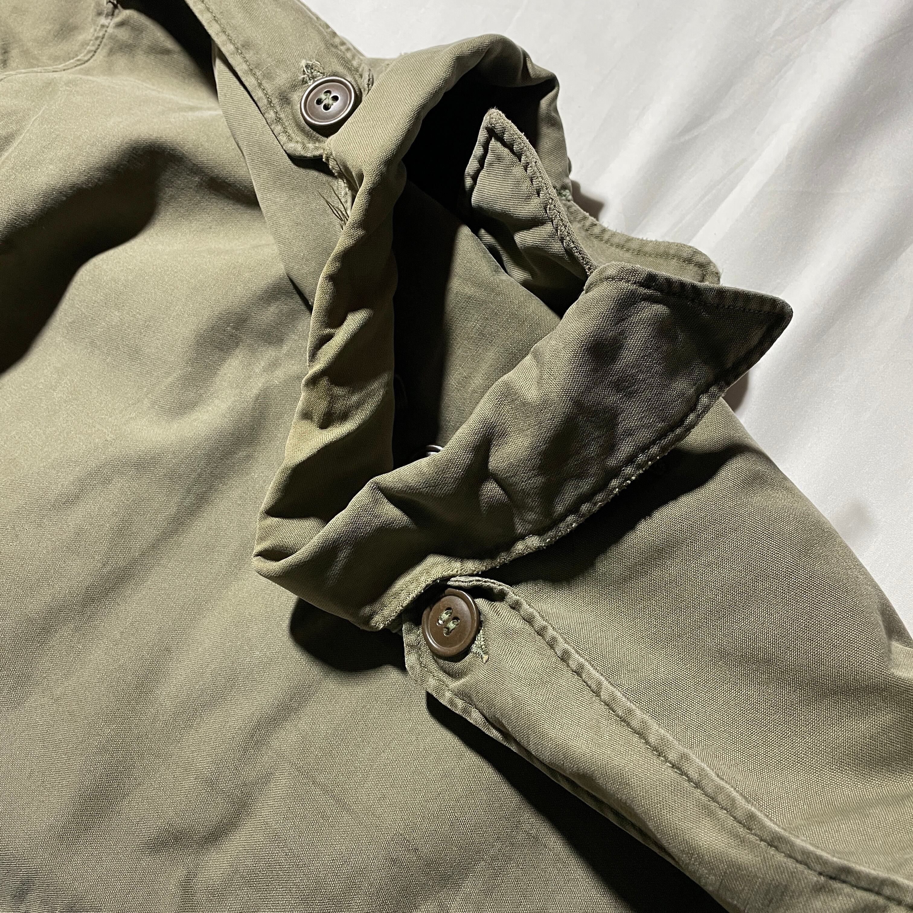 M-65よりもスッキリとしたシルエット。襟部分のフラップを使用することで襟を立てて着用可能です。コットンサテン地を使用したODカラーは高級感、ヴィンテージ感が漂います。
