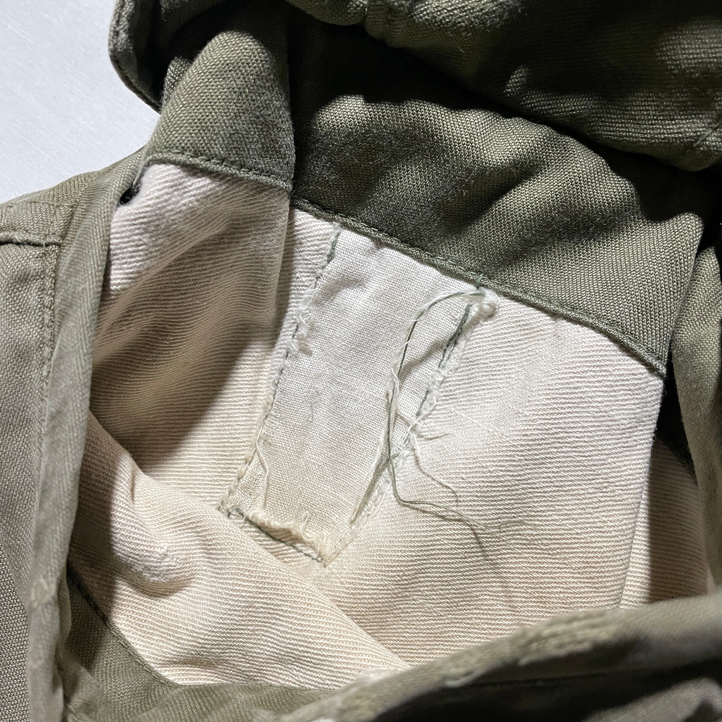 襟付付近に恐らくミルスペックがプリントで印字されていたはずですが無くなっています。この経年の使用によるくたびれ感もヴィンテージ古着ならではかと思います。