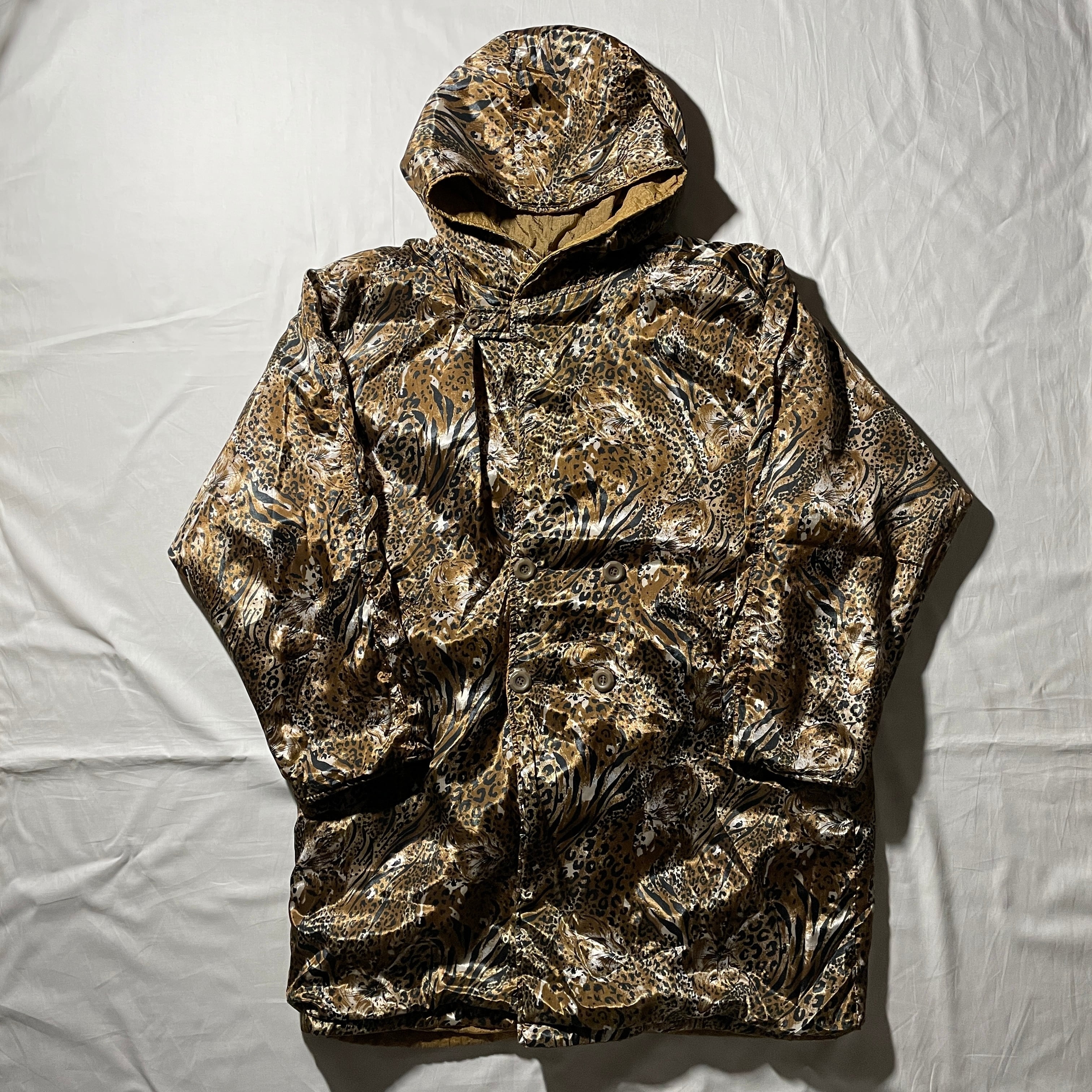 80s頃の国産ブランド。リバーシブルのナイロンミドルコート。豹柄が全面に入る総柄でフード付きなのでベンチコートみたいな感じです。