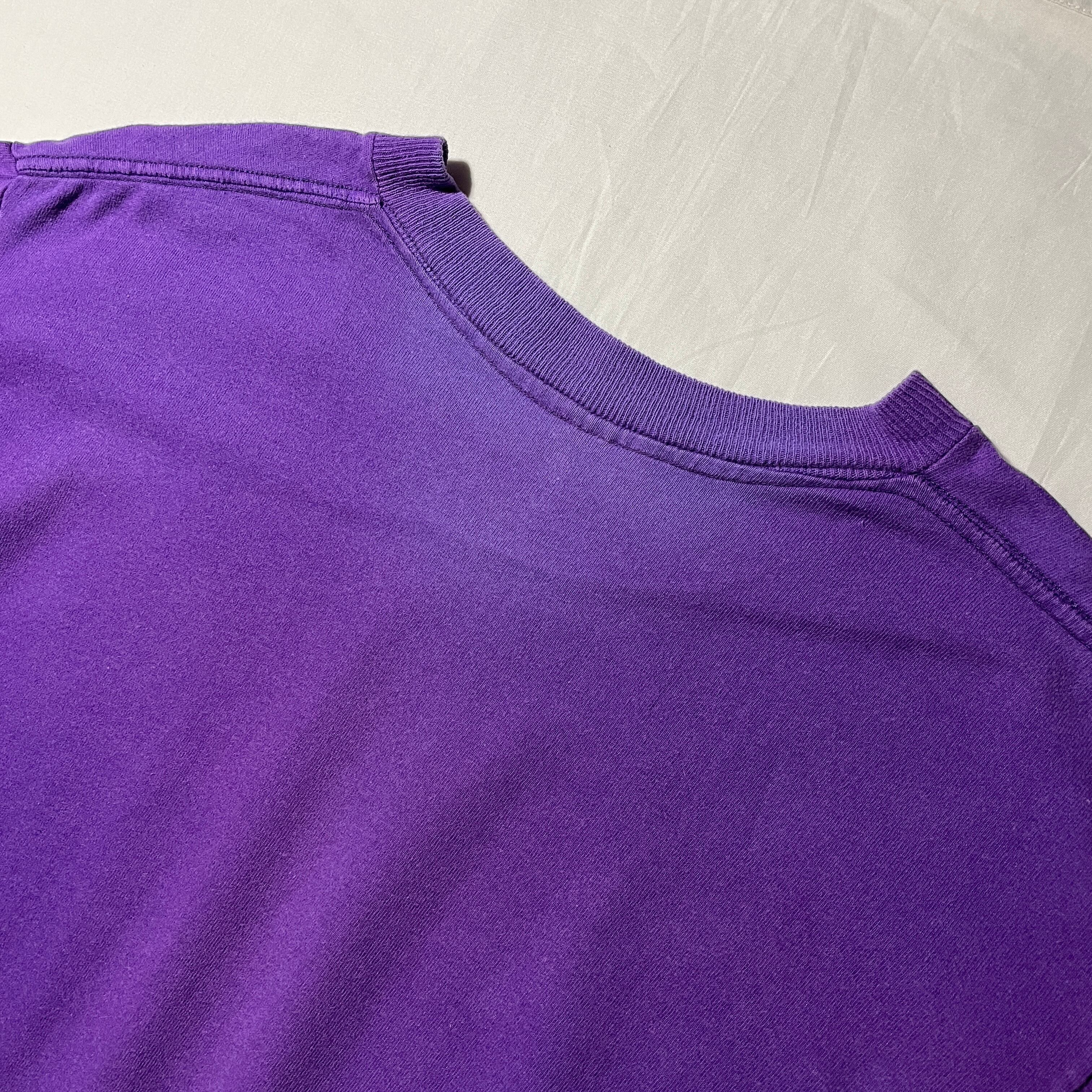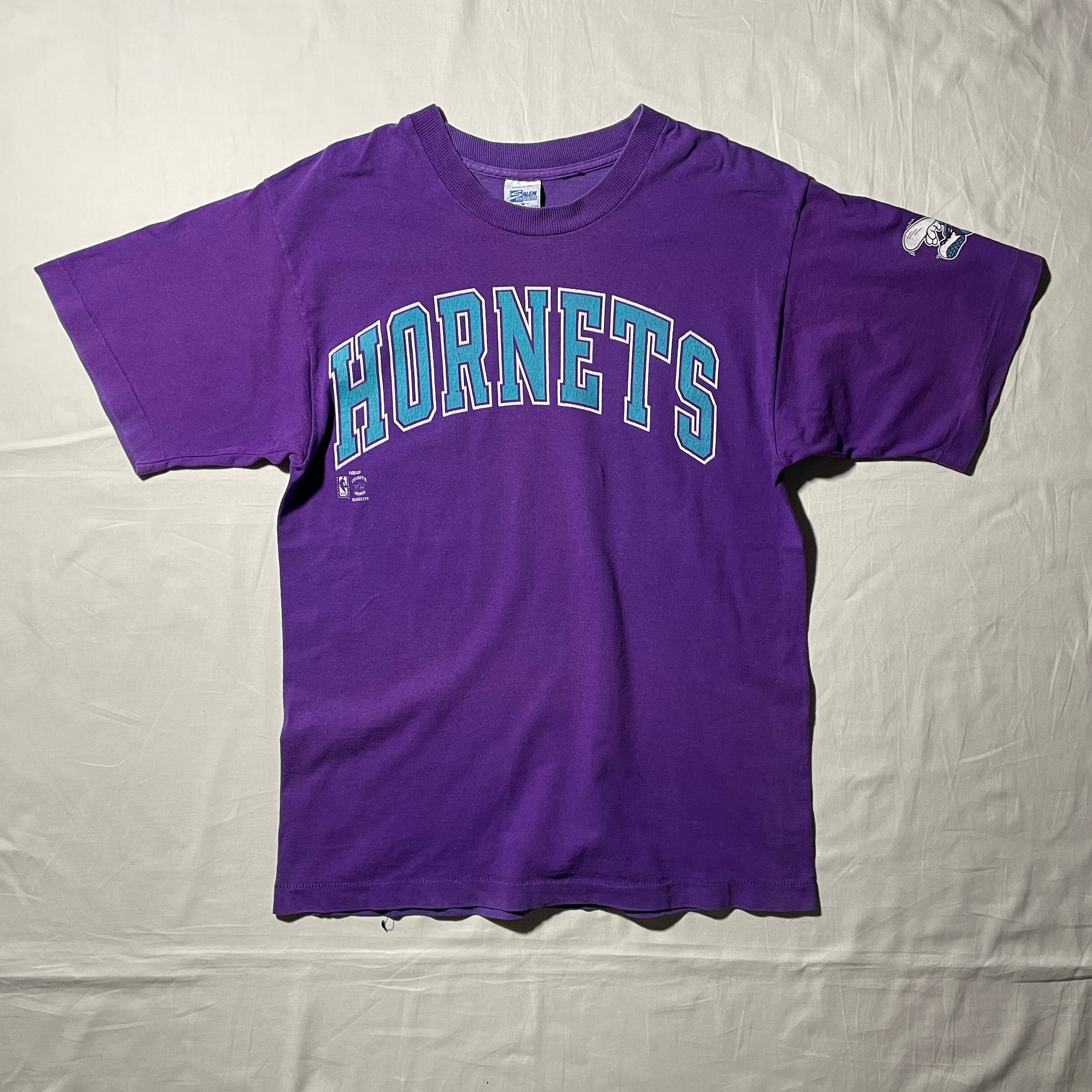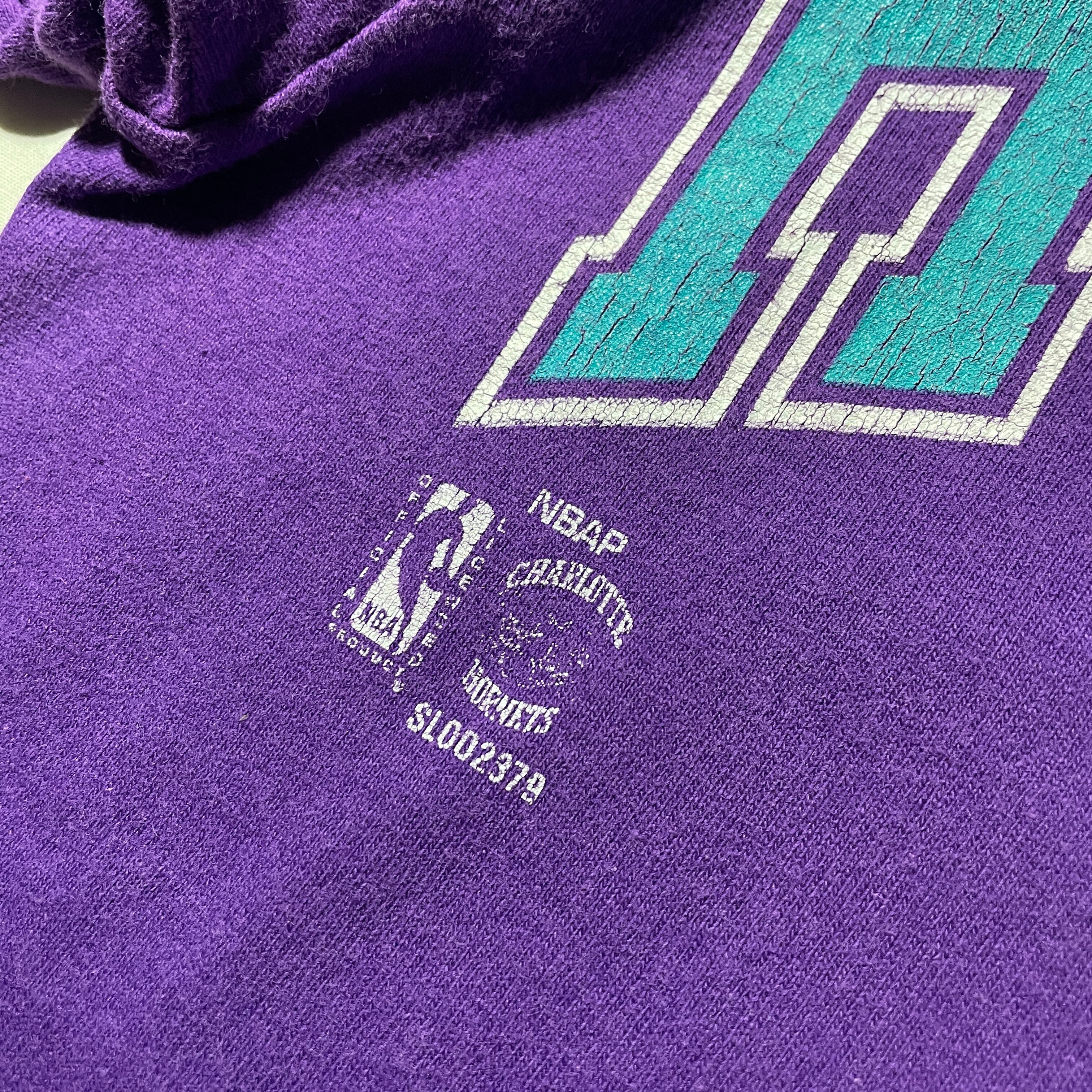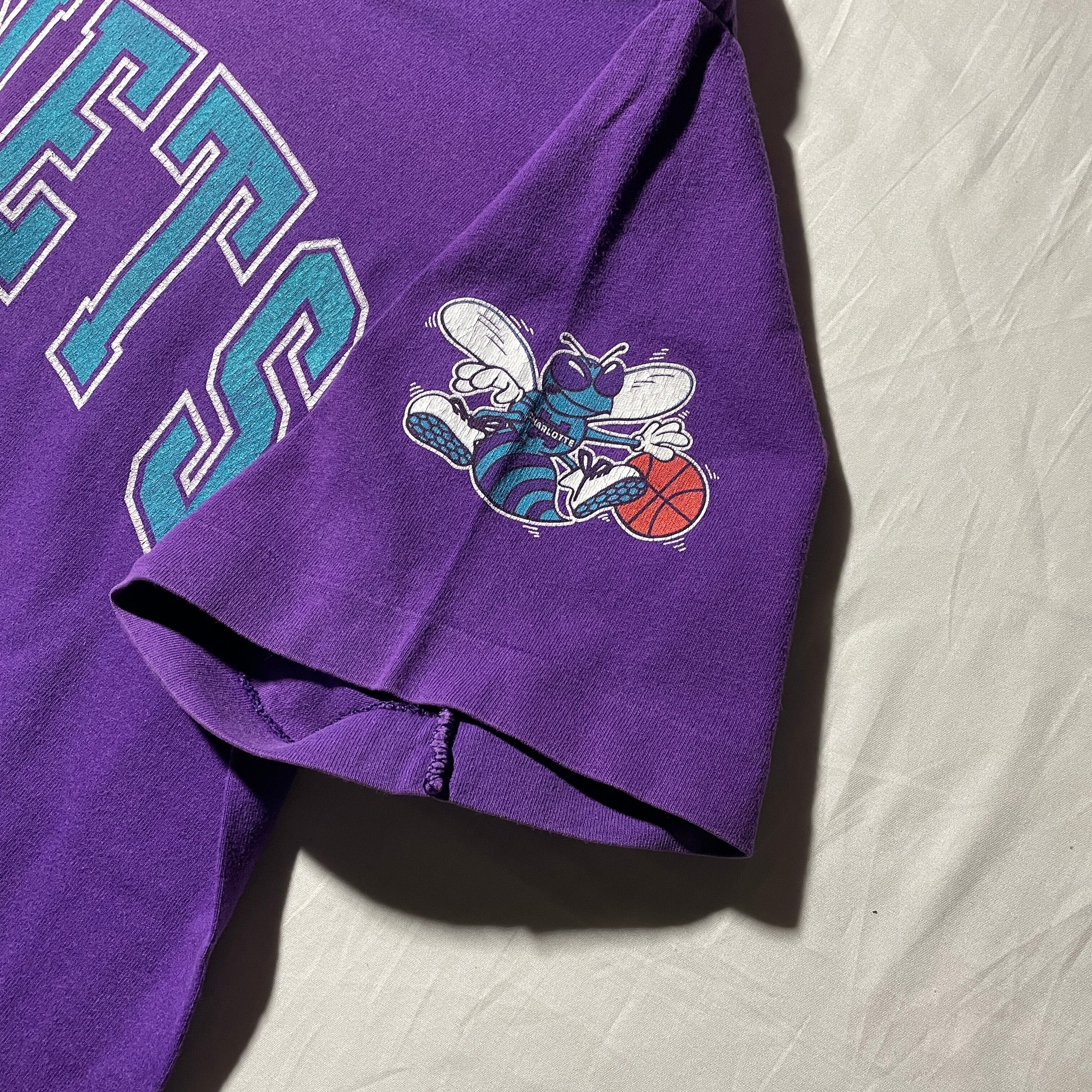 90s頃のCharlotte Hornets。アニメタッチのデザインの旧ロゴタイプ。ホームカラーのパープルにターコイズのプリントは一目でホーネッツとわかります。