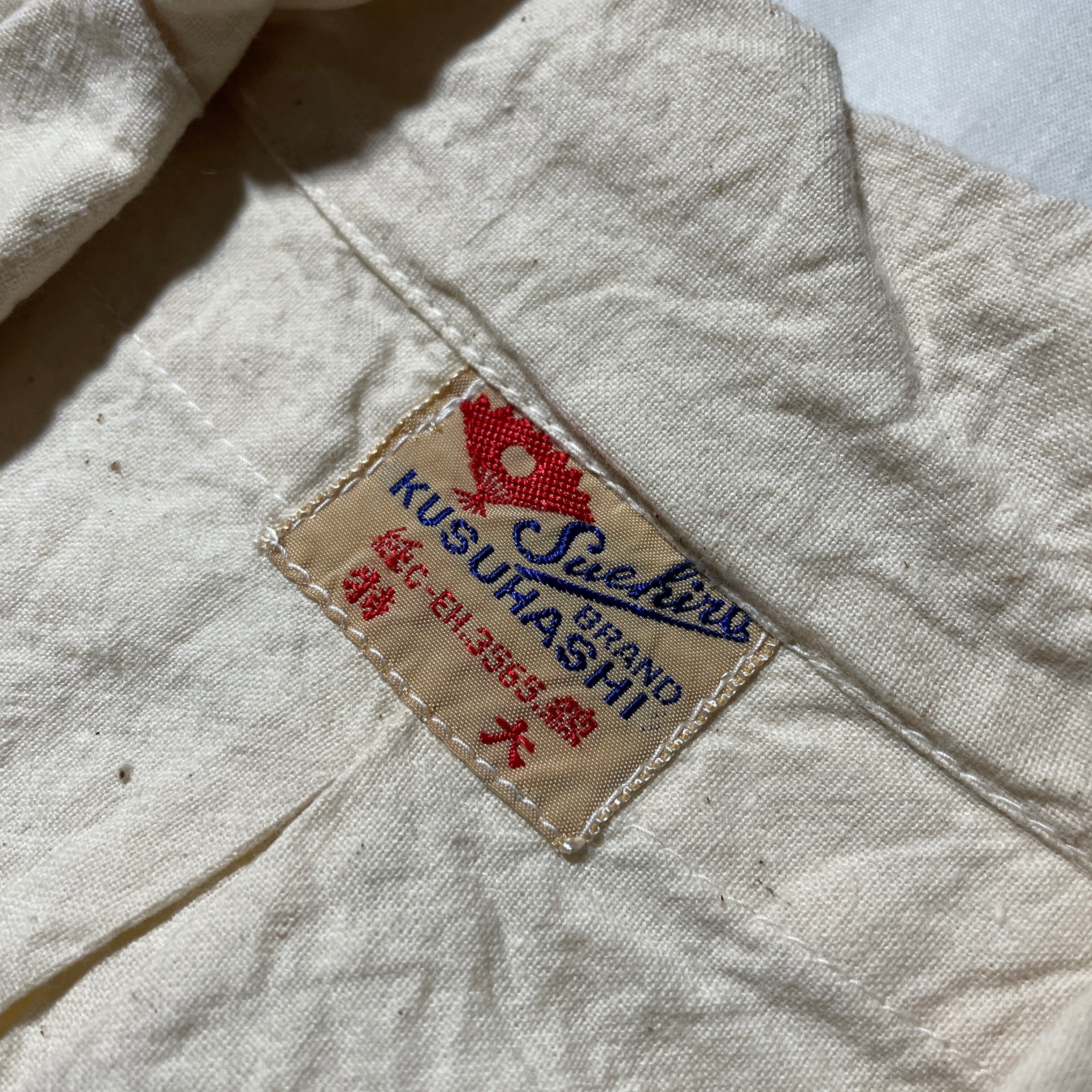 非常に珍しい40sあたりのコットンシャツ。セットインスリーブや猫目ボタン、マチに至るまでアメリカの洋服に影響を受けていることが見て取れます。