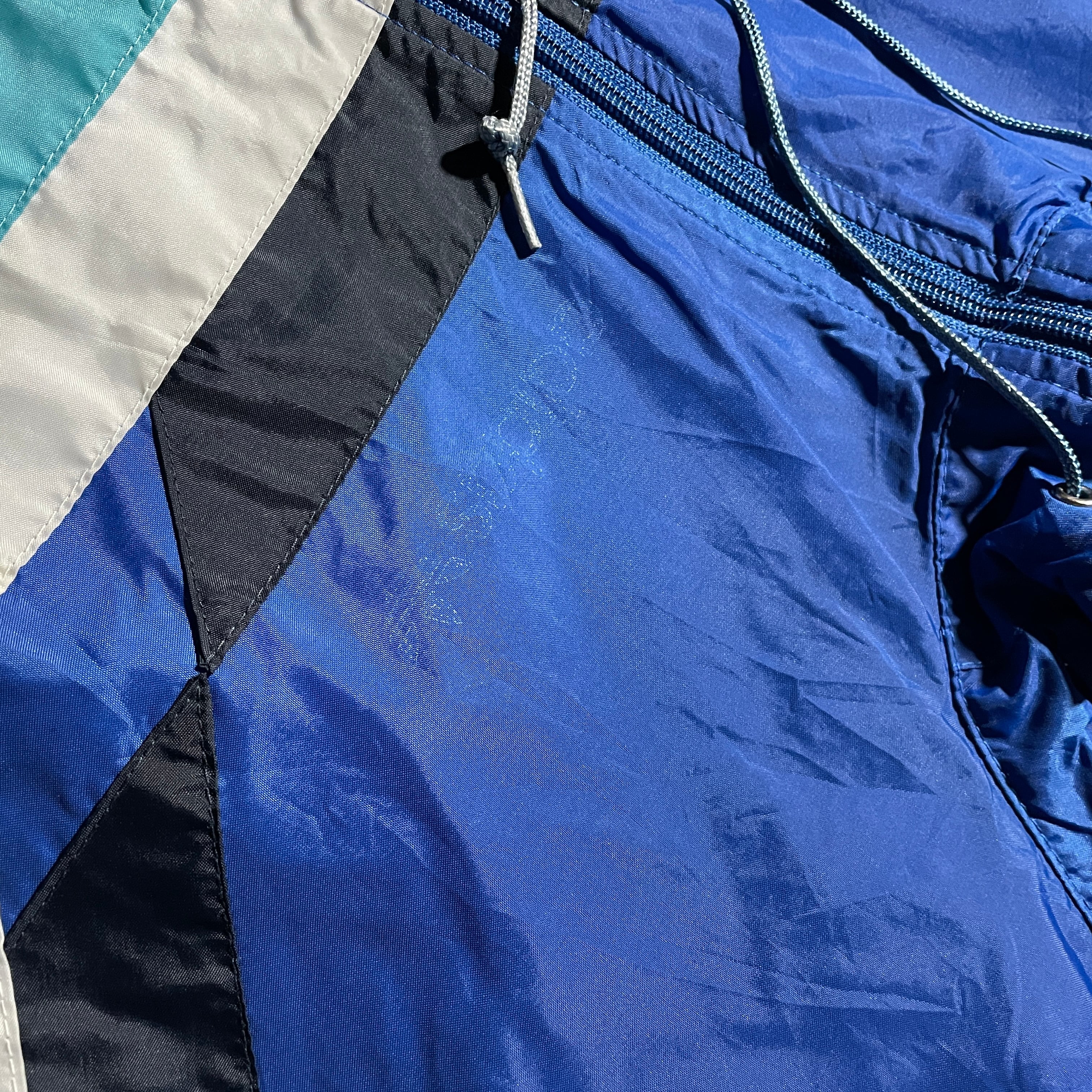 90s頃のヴィンテージadidas。襟元と裾口にドローコードがついた珍しいモデル。フロントの左右非対称なデザインもgoodです。