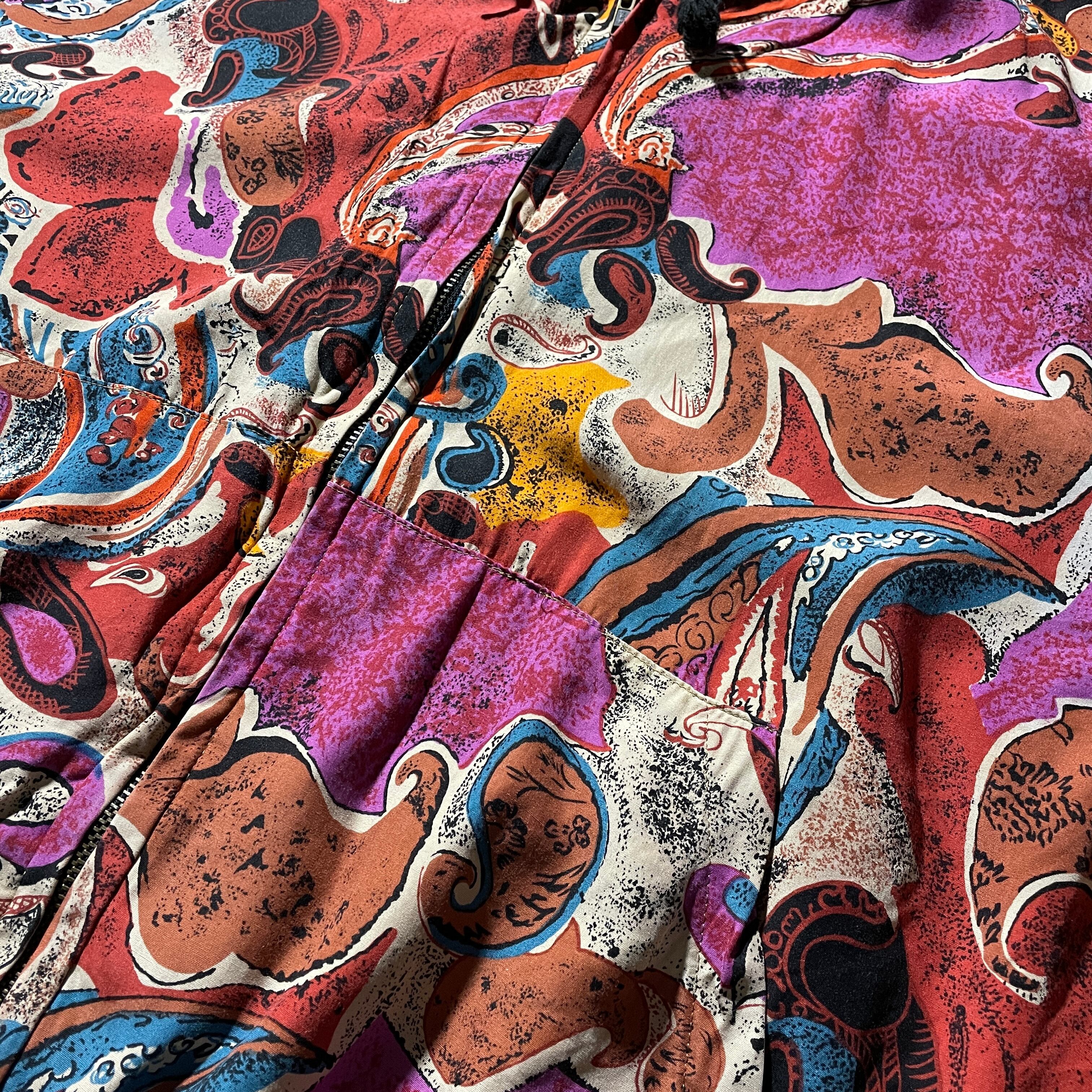 非常にセンスの良い総柄パターン。レーヨン100%のこのタイプのブルゾンも珍しいと思います。アロハシャツくらいの薄手地でサラッと羽織れる便利な一着です。