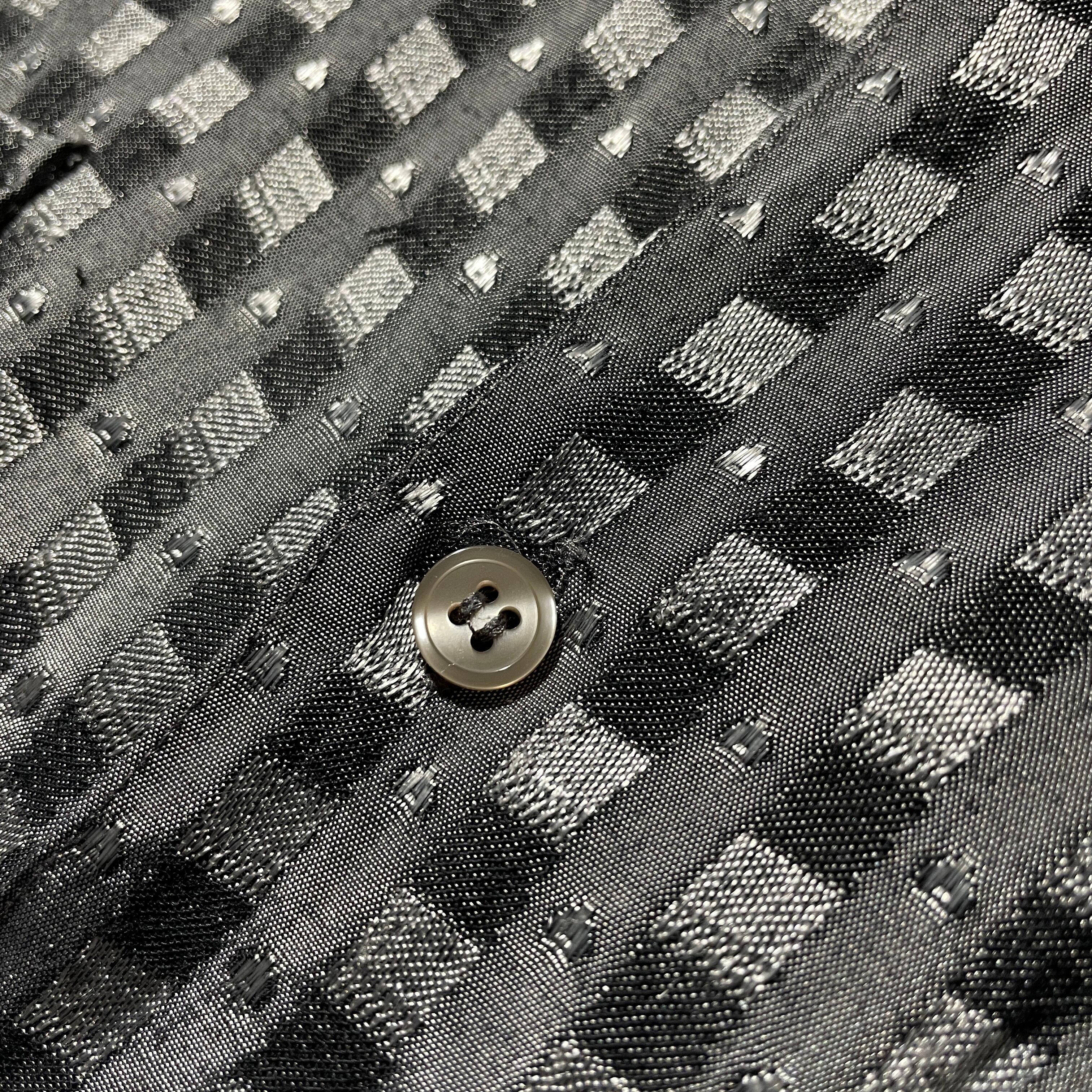 カラーは光沢のあるシルバー。S表記ですがL相当のビッグサイズ。羽織って一枚で完結する主役級のシャツかと思います。