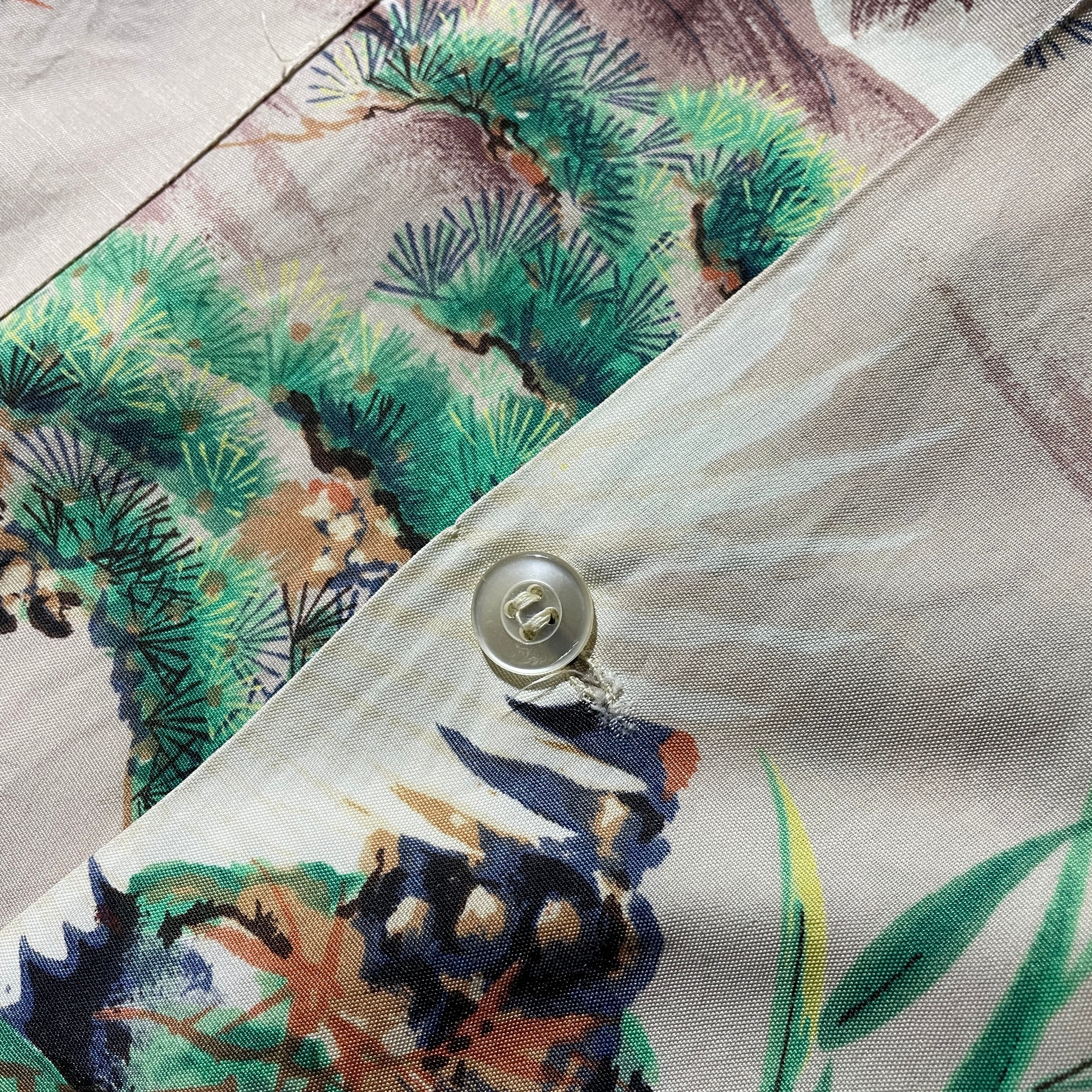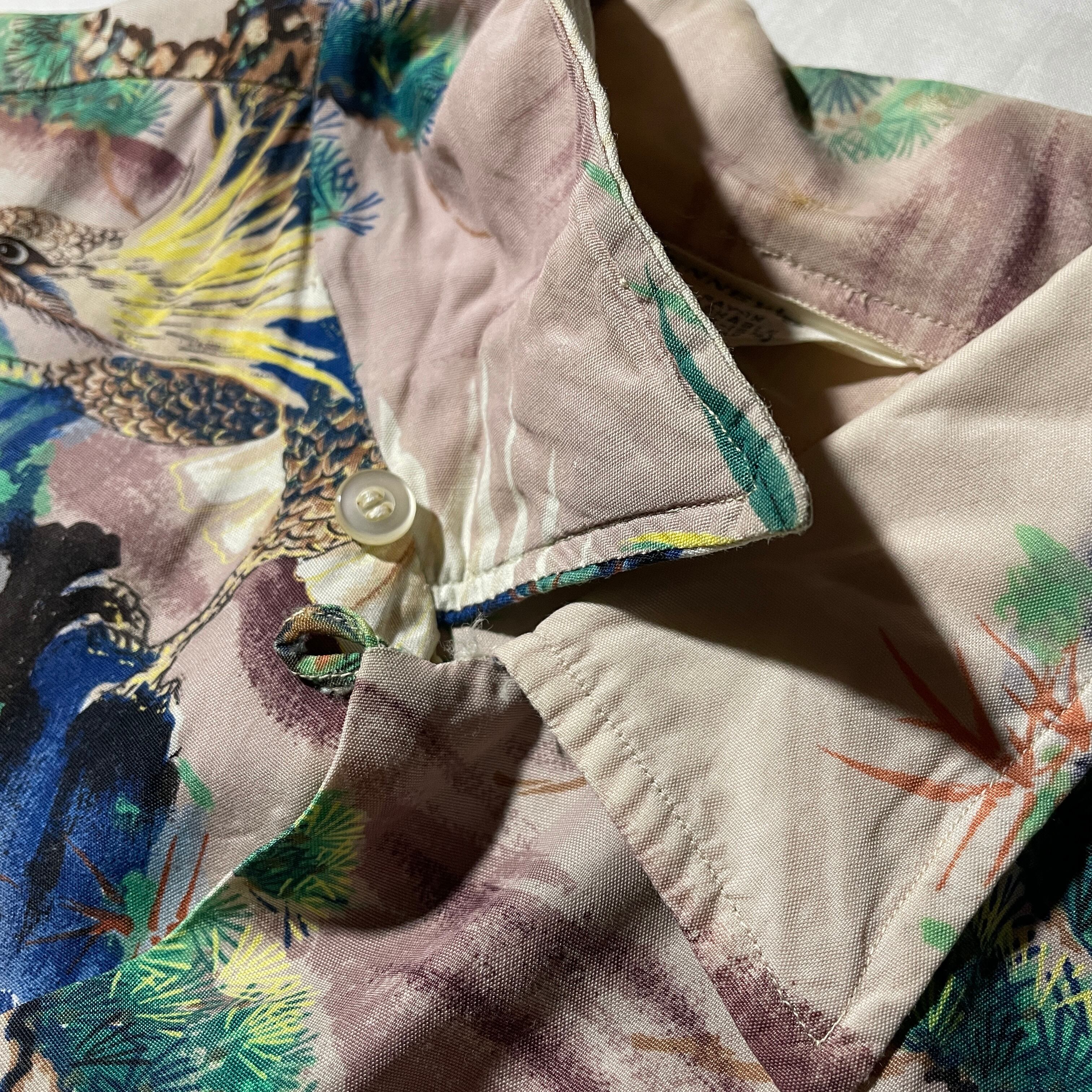 レーヨン100%、オープンカラータイプで鷲や松の木が入る非常にgoodなデザイン。コレクタブルなアイテムかと思います。
